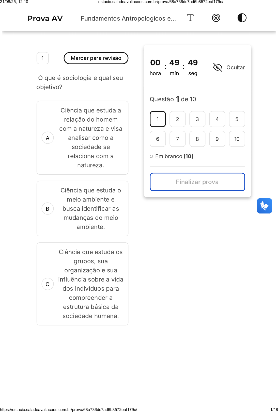 A B C 1 Marcar para revisão O que é sociologia e qual seu objetivo? Ciência que estuda a relação do homem com a natureza e visa analisar como a sociedade se relaciona com a natureza. Ciência que estuda o meio ambiente e busca identificar as mudanças do meio ambiente. Ciência que estuda os grupos, sua organização e sua influência sobre a vida dos indivíduos para compreender a estrutura básica da sociedade humana. 00 hora : 49 min : 49 seg Ocultar Questão 1 de 10 Em branco (10) Finalizar prova 1 2 3 4 5 6 7 8 9 10 Prova AV Fundamentos Antropologicos e… 21/08/25, 12:10 estacio.saladeavaliacoes.com.br/prova/68a736dc7ad6b8572eaf179c/ https://estacio.saladeavaliacoes.com.br/prova/68a736dc7ad6b8572eaf179c/ 1/18 D E Ciência que estuda os homens para avaliar como estes evoluíram com o tempo. Ciência que estuda a mecânica das sociedades. 2 Marcar para revisão Segundo Émile Durkheim, constitui uma lei da história que a solidariedade mecânica, a qual a princípio é quase único, perca terreno progressivamente e que a solidariedade orgânica, pouco a pouco, se torne preponderante. Por esta lei, segundo o autor, nas sociedades simples, prevalece a solidariedade por semelhança. Nas organizações sociais mais complexas, prevalece aquela que resulta do aprofundamento da especialização profissional. De acordo com a teoria de Durkheim, é correto afirmar que: 21/08/25, 12:10 estacio.saladeavaliacoes.com.br/prova/68a736dc7ad6b8572eaf179c/ https://estacio.saladeavaliacoes.com.br/prova/68a736dc7ad6b8572eaf179c/ 2/18 A B C As sociedades tendem a evoluir da solidariedade mecânica para a solidariedade orgânica, em função da intensificação da divisão do trabalho. Na situação em que prevalece a solidariedade mecânica, as sociedades não evoluem para a solidariedade orgânica. Na situação em que prevalecem clãs e hordas, as sociedades não desenvolvem formas de solidariedade e, por isso, tendem a desaparecer progressivamente. 21/08/25, 12:10 estacio.saladeavaliacoes.com.br/prova/68a736dc7ad6b8572eaf179c/ https://estacio.saladeavaliacoes.com.br/prova/68a736dc7ad6b8572eaf179c/ 3/18 D E Na situação em que prevalece a divisão social do trabalho, as sociedades não desenvolvem formas de solidariedade. A solidariedade mecânica representa o ponto máximo de evolução da sociedade. 3 Marcar para revisão Ao longo do tempo, o pensamento marxiano foi apropriado e reformulado por diferentes correntes, dando origem a distintas vertentes do marxismo. Entre os principais desafios enfrentados por esses teóricos estava a necessidade de adaptar a teoria marxista a contextos históricos específicos. Considerando esse processo, qual das afirmações a seguir está correta sobre a relação entre o pensamento marxiano e seus desdobramentos posteriores? 21/08/25, 12:10 estacio.saladeavaliacoes.com.br/prova/68a736dc7ad6b8572eaf179c/ https://estacio.saladeavaliacoes.com.br/prova/68a736dc7ad6b8572eaf179c/ 4/18 A B C O marxismo permaneceu homogêneo ao longo do tempo, sem variações ou interpretações divergentes entre os estudiosos e militantes. A Revolução Russa de 1917 seguiu fielmente todas as previsões de Marx, sem necessidade de ajustes na teoria para o contexto russo. O leninismo representou uma adaptação do marxismo às condições da Rússia czarista, enfatizando a necessidade de uma vanguarda revolucionária. 21/08/25, 12:10 estacio.saladeavaliacoes.com.br/prova/68a736dc7ad6b8572eaf179c/ https://estacio.saladeavaliacoes.com.br/prova/68a736dc7ad6b8572eaf179c/ 5/18 D E O pensamento de Marx se limitou ao século XIX e não teve impacto nas discussões políticas e econômicas do século XX. A teoria marxista rejeita qualquer tipo de adaptação ao contexto histórico e considera que as revoluções devem ocorrer da mesma forma em todas as sociedades. 4 Marcar para revisão As pessoas com deficiência estão no grupo de pessoas desfavorecidas e vulneráveis, segundo as determinações da Organização Mundial da Saúde e tratados internacionais, porque são vítimas de discriminação. A esse respeito, assinale a alternativa que melhor aponte as discriminações sofridas: 21/08/25, 12:10 estacio.saladeavaliacoes.com.br/prova/68a736dc7ad6b8572eaf179c/ https://estacio.saladeavaliacoes.com.br/prova/68a736dc7ad6b8572eaf179c/ 6/18 A B C A pessoa com deficiência não está vulnerável, porque ela pode fazer todas as coisas que qualquer outra pessoa. As empresas possuem pessoas com deficiência tanto como clientes quanto como funcionários, por isso não há discriminação. Os dados do IBGE apontam que as pessoas com deficiência possuem mais dificuldade de serem inseridas no mercado de trabalho. 21/08/25, 12:10 estacio.saladeavaliacoes.com.br/prova/68a736dc7ad6b8572eaf179c/ https://estacio.saladeavaliacoes.com.br/prova/68a736dc7ad6b8572eaf179c/ 7/18 D E Atualmente ninguém tem trabalho, por isso que as pessoas com deficiência também estão desempregadas. Os tratados internacionais apontam que apenas pessoas com deficiência física possuem dificuldade de acesso ao mercado de trabalho. 5 Marcar para revisão Os debates sobre antropologia cultural passam, necessariamente, por: 21/08/25, 12:10 estacio.saladeavaliacoes.com.br/prova/68a736dc7ad6b8572eaf179c/ https://estacio.saladeavaliacoes.com.br/prova/68a736dc7ad6b8572eaf179c/ 8/18 A B C D E Etnocentrismo - a lógica de que tendemos a olhar nossa cultura como certa e analisar e hierarquizar as outras a partir disso. Relativismo - que tudo é relativo e não existe nem certo e nem errado, assim não devemos nunca nos posicionar. Etnocentrismo - a dinâmica de que as culturas são individuais e não devem ser misturadas para que não percam seu centro. Relativismo - a lógica que o ponto de vista altera a visão sobre a cultura, e por isso a interpretação é sempre única. Etnocentrismo - nome original da antropologia, antes do aparecimento dos trabalhos de antropólogos americanos. 21/08/25, 12:10 estacio.saladeavaliacoes.com.br/pro