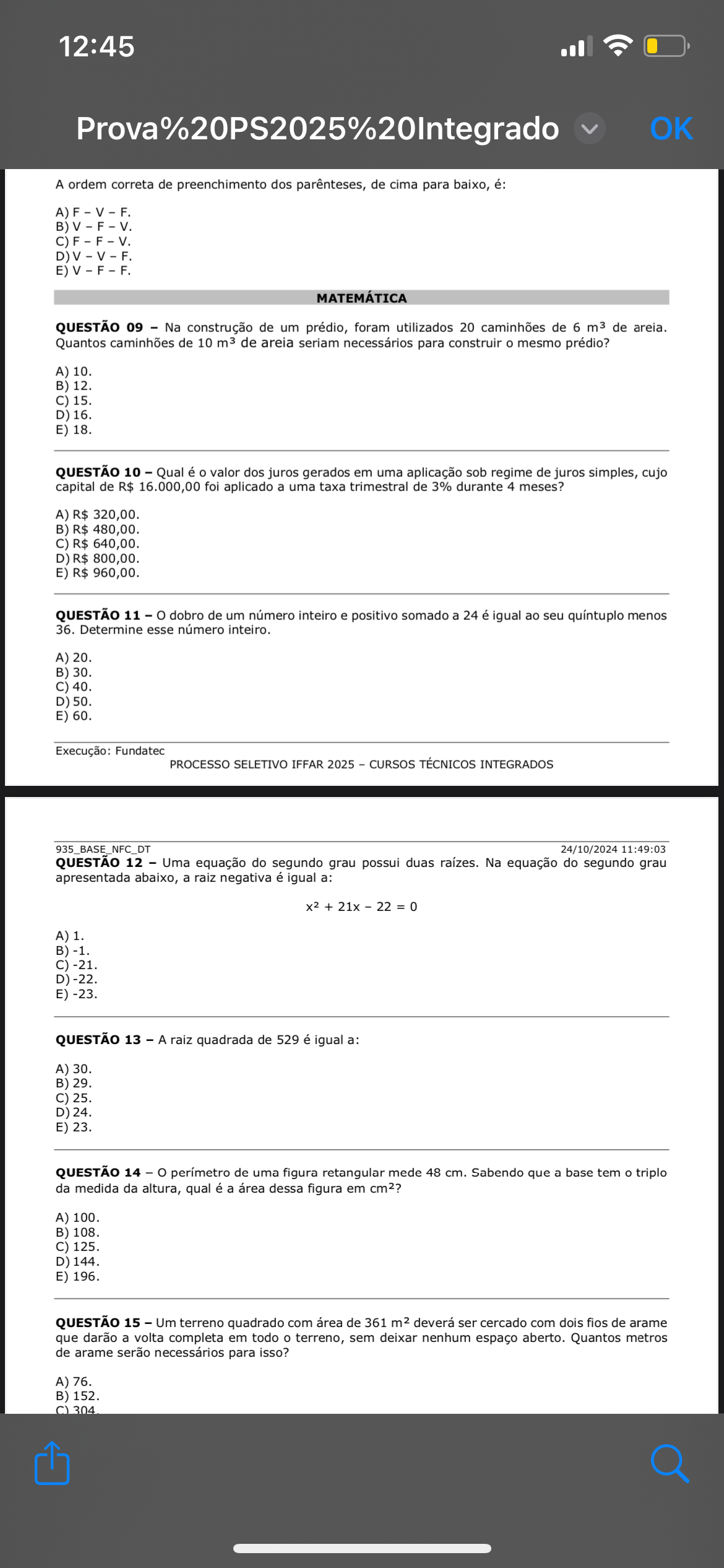 12:45 OK A ordem correta de preenchimento dos parênteses, de cima para baixo, é: B) V F V. C) F F V. D) V V F. MATEMÁTICA QUESTÃO 09 Na construção de um prédio, foram utilizados 20 caminhões de 6 de areia. Quantos caminhões de 10 de areia seriam necessários para construir mesmo prédio? A) 10. B) 12. C) 15. D) 16. E) 18. QUESTÃO 10 Qual é valor dos juros gerados em uma aplicação sob regime de juros simples, cujo capital de R$ 16.000,00 foi aplicado a uma taxa trimestral de 3% durante 4 meses? A) 320,00. B) R$ 480,00. C) R$ 640,00. D) R$ 800,00. E) R$ 960,00. QUESTÃO 11 o dobro de um número inteiro e positivo somado a 24 é igual ao seu quíntuplo menos 36. Determine esse número inteiro. A) 20. B) 30. C) 40. D) 50. E) 60. Execução: Fundatec PROCESSO SELETIVO IFFAR 2025 CURSOS TÉCNICOS INTEGRADOS 935_BASE_NFC_DT 24/10/2024 11:49:03 QUESTÃO 12 Uma equação do segundo grau possui duas raízes. Na equação do segundo grau apresentada abaixo, a raiz negativa é igual a: + 21x 22 = 0 A) 1. B) -1. C) -21. D) -22. E) -23. QUESTÃO 13 A raiz quadrada de 529 é igual a: A) 30. B) 29. C) 25. D) 24. E) 23. QUESTÃO 14 o perímetro de uma figura retangular mede 48 cm. Sabendo que a base tem triplo da medida da altura, qual é a área dessa figura em cm²? A) 100. B) 108. C) 125. D) 144. E) 196. QUESTÃO 15 Um terreno quadrado com área de 361 deverá ser cercado com dois fios de arame que darão a volta completa em todo terreno, sem deixar nenhum espaço aberto. Quantos metros de arame serão necessários para isso? A) 76. B) 152. C) 304