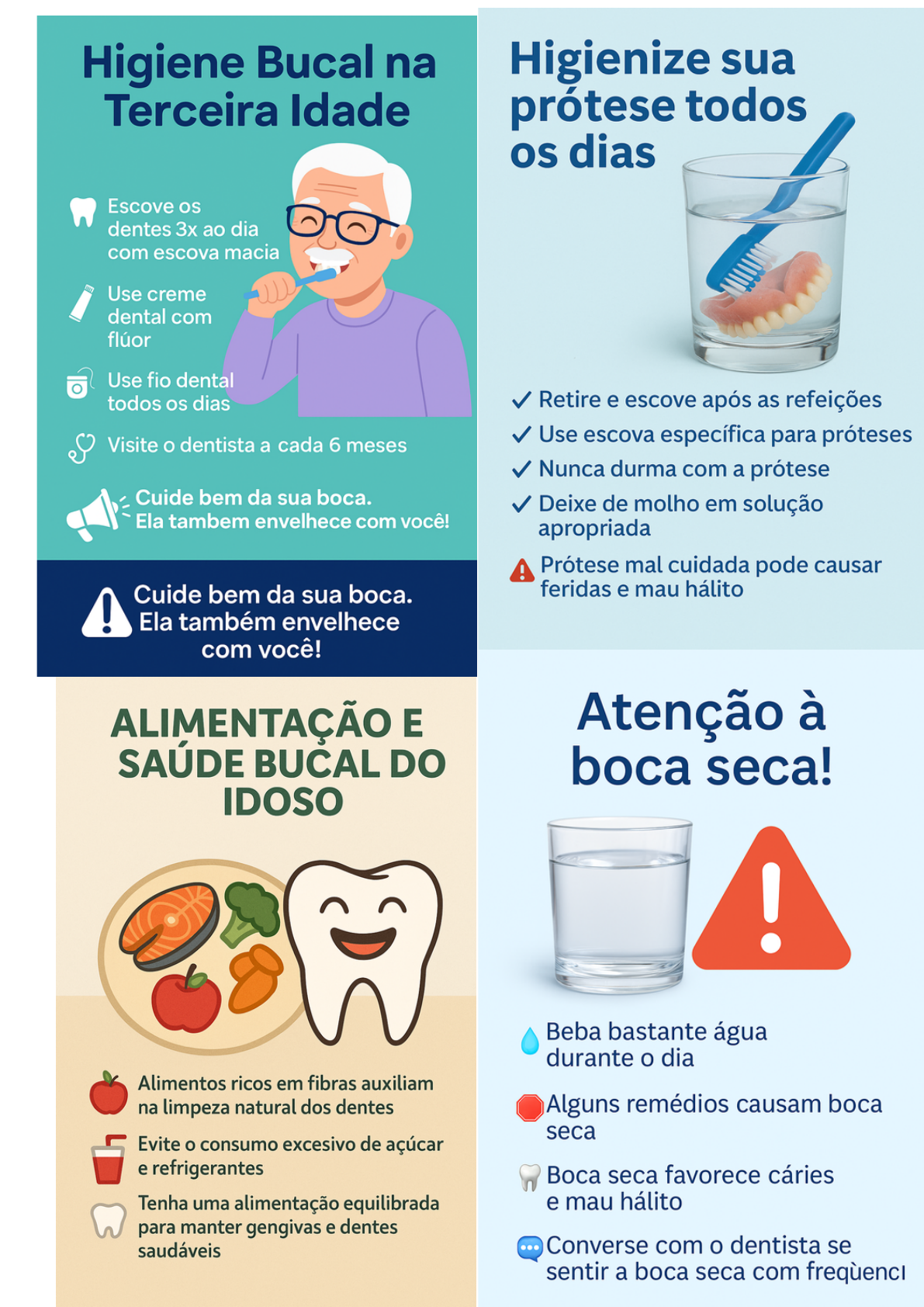 Higiene Bucal na Higienize sua Terceira Idade prótese todos dias Escove os dentes ao dia com escova macia Use creme dental com flúor Use fio dental todos os dias Retire e escove após as refeições Visite dentista a cada 6 meses Use escova específica para próteses Nunca durma com a prótese Cuide bem da sua boca. Deixe de molho em solução Ela tambem envelhece com você! apropriada ! Prótese mal cuidada pode causar Cuide bem da sua boca. feridas e mau hálito ! Ela também envelhece com você! ALIMENTAÇÃO E Atenção à SAÚDE BUCAL DO boca seca! IDOSO Beba bastante água durante dia Alimentos ricos em fibras auxiliam na limpeza natural dos dentes Alguns remédios causam boca seca Evite consumo excesivo de açúcar e refrigerantes Boca seca favorece cáries Tenha uma alimentação equilibrada e mau hálito para manter gengivas e dentes saudáveis Converse com dentista se sentir a boca seca comAUTOEXAME BUCAL AUTOEXAME DA CAVIDADE BUCAL FAÇA AUTOEXAME DA SUA BOCA Observe sua boca uma vez por mês, de frente para LEUCOPLASIA o espelho, com boa iluminação Examine: Lábios, língua, bochechas, céu da boca e gencivas. Procure por feridas, carocos, manchas brancas ou vermelhas FIQUE ATENTO A: Feridas que não cicatrizam em até 15 dias Inchaços ou caroços anormais AL DE FERIDA PERSISTENTES COR OU FORMA Sangramentos frequentes Mau hálito persistente ESSES SINAIS PODEM INDICAR ! DOENÇAS COMO: Gengivite Léucoplasia Estomátite Câncer de boca Se notar alga diferente, procure um ALTERAÇÕES DE HIPERPLASIAS COR OU FORMA dentista imediatamente! A Mucosa Mucosa D Gengiva jugal anterior Gengiva Lábios Gengiva posterior Mucosa E Palato F Região G Ventre H duro tonsilar da Soalho Borda Palato mole bucal lateral da língua