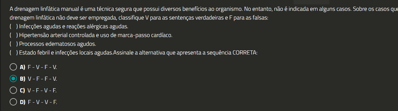 A drenagem linfática manual é uma técnica segura que possui diversos benefícios ao organismo. No entanto, não é indicada em alguns casos. Sobre os casos que drenagem linfática não deve ser empregada, classifique V para as sentenças verdadeiras eF para as falsas: Infecções agudas e reações alérgicas agudas. ( ) Hipertensão arterial controlada e uso de marca-passo cardíaco. Processos edematosos agudos. Estado febril e infecções locais agudas.Assinale a alternativa que apresenta a sequência CORRETA: A) F-V-F-V. D) F - V - V - F.
