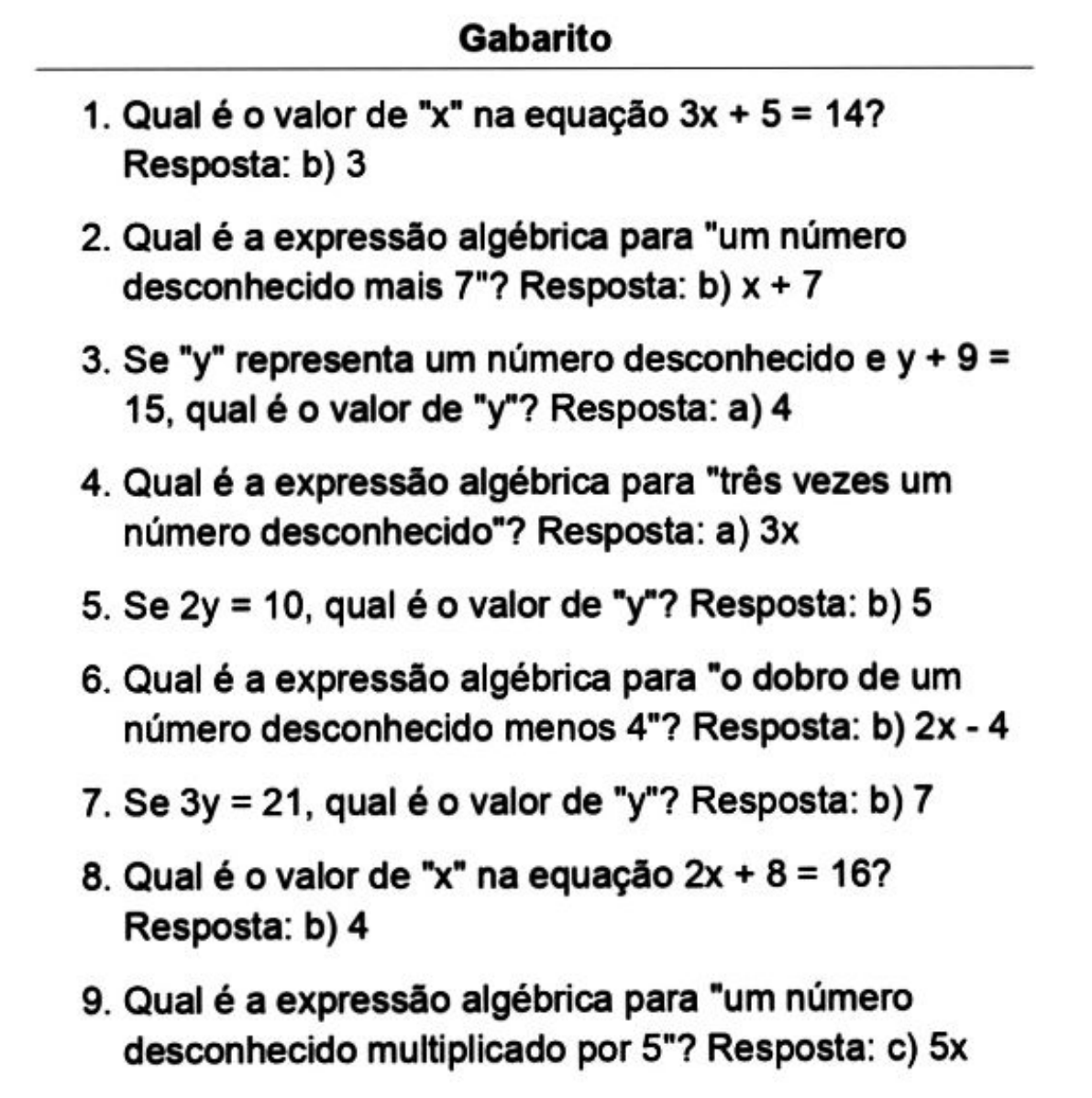 Gabarito 1. Qual é o valor de "x" na equação 3x + 5 = 14? Resposta: b) 3 2. Qual é a expressão algébrica para "um número desconhecido mais 7"? Resposta: b) X + 7 3. Se "y" representa um número desconhecido ey+9= 15, qual é valor de "y"? Resposta: a) 4 4. Qual é a expressão algébrica para "três vezes um número desconhecido"? Resposta: a) 3x 5. Se 2y = 10, qual é o valor de "y"? Resposta: b) 5 6. Qual é a expressão algébrica para "o dobro de um número desconhecido menos 4"? Resposta: b) 2x - 4 7. Se 3y = 21, qual é o valor de "y"? Resposta: b) 7 8. Qual é o valor de "x" na equação 2x + 8 = 16? Resposta: b) 4 9. Qual é a expressão algébrica para "um número desconhecido multiplicado por 5"? Resposta: c) 5x7. Se 3y = 21, qual é valor de "y"? a) 3 b) 7 c) 14 d) 6 8. Qual é o valor de "x" na equação 2x + 8 = 16? a) 2 b) 4 c) 6 d) 8 9. Qual é a expressão algébrica para "um número desconhecido multiplicado por 5"? a) 5 + X b) X - 5 c) 5x d) x/54. Qual é a expressão algébrica para "três vezes um número desconhecido"? a) 3x b) X + 3 5. Se 2y = 10, qual é valor de "y"? a) 2 b) 5 c) 10 d) 20 6. Qual é a expressão algébrica para "o dobro de um número desconhecido menos 4"? c) x/2 - 4 d) 4 - 2xAtividades de álgebra Nome: 1. Qual é o valor de "x" na equação a) 2 b) 3 c) 4 d) 9 2. Qual é a expressão algébrica para "um número desconhecido mais 7"? a) X - 7 c) 7 X d) 7x 3. Se "y" representa um número desconhecido e y + 9 = 15, qual é valor de "y"? a) 4 b) 6 c) 15 d) 24