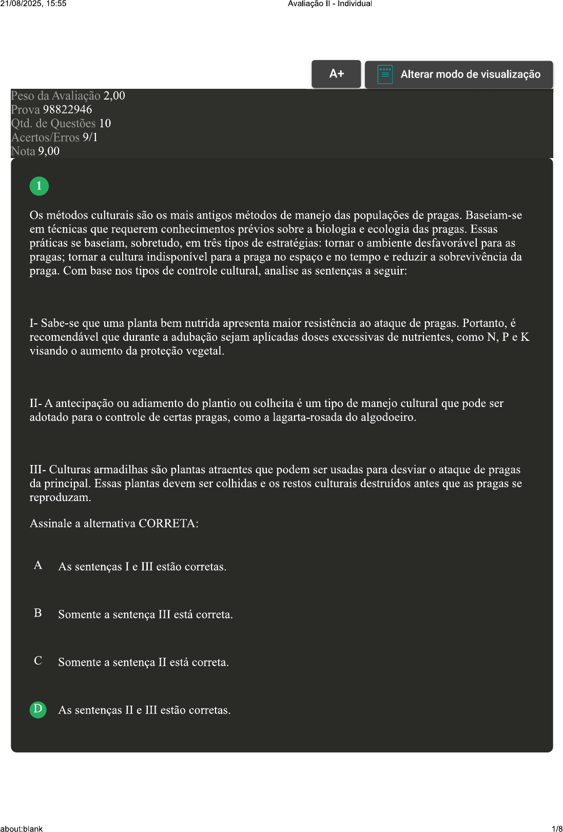 21/08/2025, 15:55 Avaliação Individual A+ Alterar modo de visualização Peso da Avaliação 2,00 Prova 98822946 Qtd. de Questões 10 Acertos/Erros 9/1 Nota 9,00 1 Os métodos culturais são os mais antigos métodos de manejo das populações de pragas. Baseiam-se em técnicas que requerem conhecimentos prévios sobre a biologia e ecologia das pragas. Essas práticas se baseiam, sobretudo, em três tipos de estratégias: tornar o ambiente desfavorável para as pragas; tornar a cultura indisponível para a praga no espaço e no tempo e reduzir a sobrevivência da praga. Com base nos tipos de controle cultural, analise as sentenças a seguir: I- Sabe-se que uma planta bem nutrida apresenta maior resistência ao ataque de pragas. Portanto, é recomendável que durante a adubação sejam aplicadas doses excessivas de nutrientes, como N, P e K visando o aumento da proteção vegetal. II- A antecipação ou adiamento do plantio ou colheita é um tipo de manejo cultural que pode ser adotado para o controle de certas pragas, como a lagarta-rosada do algodoeiro. III- Culturas armadilhas são plantas atraentes que podem ser usadas para desviar o ataque de pragas da principal. Essas plantas devem ser colhidas e os restos culturais destruídos antes que as pragas se reproduzam. Assinale a alternativa CORRETA: A As sentenças I e III estão corretas. B Somente a sentença III está correta. Somente a sentença II está correta. D As sentenças II e III estão corretas. about:blank 1/821/08/2025, 15:55 Avaliação Individual 2 A Lei 7.802, de 11 de julho de 1989, dispõe sobre a pesquisa, a experimentação, a produção, a embalagem e rotulagem, o transporte, o armazenamento, a comercialização, a propaganda comercial, a utilização, a importação, a exportação, destino dos resíduos e embalagens, o registro, a classificação, o controle, a inspeção e a fiscalização de agrotóxicos, seus componentes e afins, e dá outras providências. De acordo com os conceitos previstos na Lei 7.802, de 11 de julho de 1989, classifique V para as sentenças verdadeiras e F para as falsas: Adjuvante é a substância ou produto adicionado a agrotóxicos, componentes e afins, para melhorar sua ação, função, durabilidade, estabilidade e detecção ou para facilitar o processo de produção. ( ) Aditivo é o produto utilizado em mistura com produtos formulados para melhorar a sua aplicação. Dentre os aditivos mais comuns, encontram-se os espalhantes, umectantes, detergentes, dispersantes e aderentes, dentre outros. Limite Máximo de Resíduo (LMR) é a quantidade máxima de resíduo de agrotóxico ou afim oficialmente aceita no alimento, expressa em partes (em peso) do agrotóxico, afim ou seus resíduos por milhão de partes de alimento (em peso) (ppm ou mg/kg). Assinale a alternativa que apresenta a sequência CORRETA: Fonte: BRASIL. Lei n° 7.802, de novembro de 2011. Dispõe sobre a pesquisa, a experimentação, a produção, a embalagem e rotulagem, o transporte, o armazenamento, a comercialização, a propaganda comercial, [...] Brasília, DF: Presidência da República, 1989. Disponível em: em: 18 jan. 2023. A B V-V-F. D 3 controle biológico tem como princípio o controle de pragas agrícolas mediante a utilização de inimigos naturais, os quais podem ser organismos não praga, como insetos predadores, parasitoides e about:blank 2/821/08/2025, 15:55 Avaliação Individual microrganismos, incluindo os fungos, os vírus e as bactérias. Com base nos conceitos inerentes ao controle biológico de pragas, classifique V para as sentenças verdadeiras e F para as falsas: ( ) controle biológico natural é o método mais antigo de controle biológico e consiste na introdução de inimigos naturais importados da região nativa das pragas exóticas presentes no país, visando o seu controle. ( ) uso de inseticidas seletivos é uma estratégia importante para a preservação de inimigos naturais nos sistemas agrícolas. controle biológico clássico está relacionado a uma série de práticas que visam a conservação ou incremento das populações de inimigos naturais que ocorrem naturalmente nos agroecossistemas Assinale a alternativa que apresenta a sequência CORRETA: Fonte: GALLO, D. et al. Entomologia agrícola. Piracicaba: FEALQ, 2002. A B V-V-F. D V-F-V. 4 Inseticidas e acaricidas são substâncias químicas ou biológicas que aplicadas direta ou indiretamente sobre insetos e ácaros, em doses adequadas, provocam sua morte. Além de outras classificações, os inseticidas podem ser separados de acordo com a sua origem e natureza química. Com base nos conceitos envolvendo a classificação de inseticidas quanto a sua origem e natureza química, assinale a alternativa INCORRETA: A São exemplos de inseticidas à base de plantas (botânicos) as piretrinas, rotenonas, nicotinas e o nim, geralmente aplicados na forma de extratos. B A abamectina é um inseticida, acaricida e antihelmíntico de origem biológica, isolado de produtos de fermentação da bactéria Streptomyces avermetilis. about:blank 3/821/08/2025, 15:55 Avaliação Individual Inseticidas inorgânicos podem ser obtidos de arsênico, flúor, tálio, enxofre e dióxido de sílica e atuam provocando a desidratação e morte dos indivíduos entre dois e 14 dias após a exposição. D Os vírus Metarhizium anisopliae e Beauveria bassiana são exemplos de agentes biológicos utilizados no controle de pragas como as cigarrinhas da cana-de-açúcar e de pastagens. 5 Após a identificação das principais pragas de uma cultura, torna-se necessário estabelecer um plano de amostragem de pragas. Existem dois principais tipos de planos de amostragem: o plano convencional e o sequencial. Sobre o plano de amostragem sequencial, classifique V para as sentenças verdadeiras e F para as falsas: número de amostras colhidas é fixo, de modo que se garanta uma boa precisão da amostragem. Se a unidade amostral está infestada pela praga, ela recebe nota "