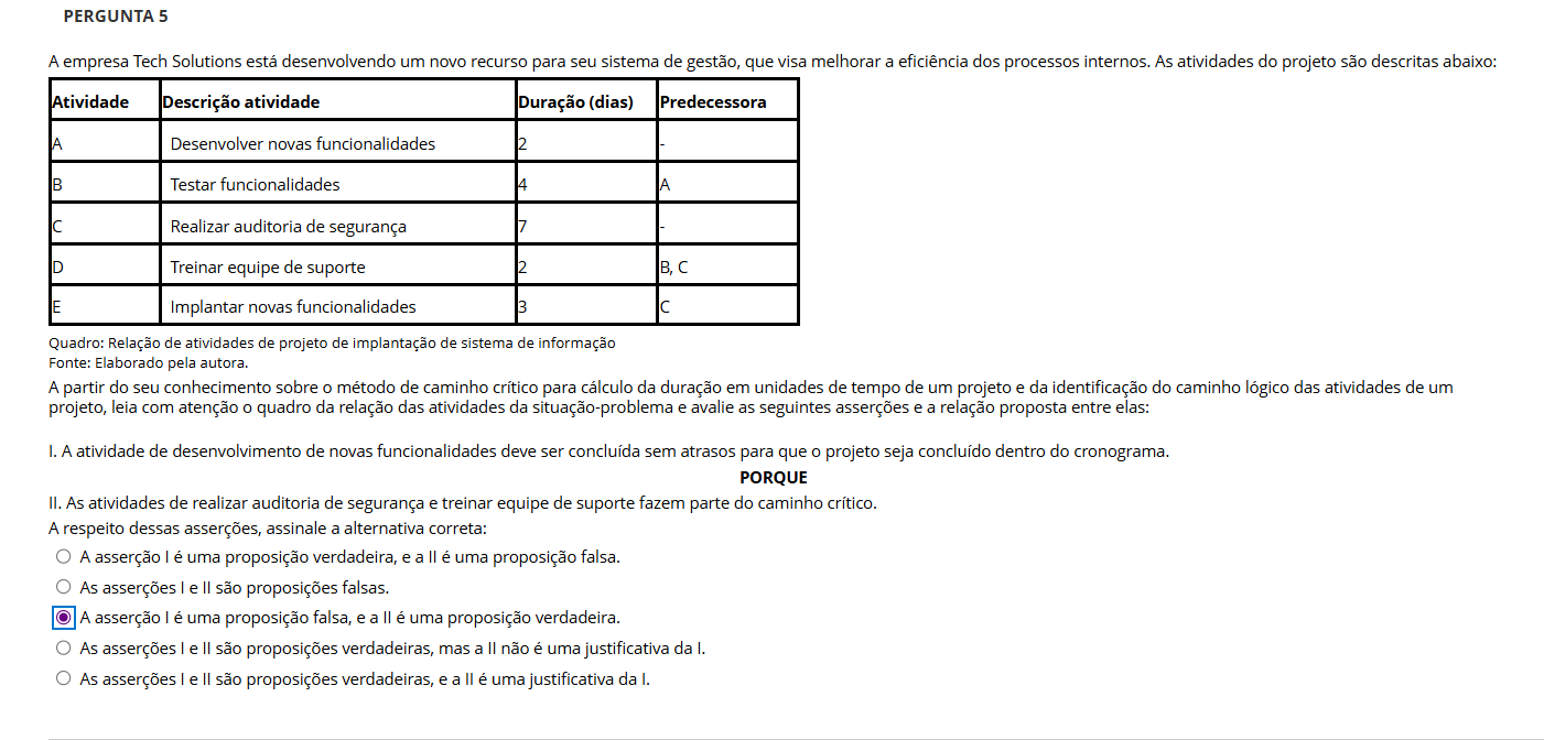 PERGUNTA 5 A empresa Tech Solutions está desenvolvendo um novo recurso para seu sistema de gestão, que visa melhorar a eficiência dos processos internos. As atividades do projeto são descritas abaixo: Atividade Descrição atividade Duração (dias) Predecessora A Desenvolver novas funcionalidades 2 Testar funcionalidades 4 A C Realizar auditoria de segurança 7 D Treinar equipe de suporte 2 B,C E Implantar novas funcionalidades 3 C Quadro: Relação de atividades de projeto de implantação de sistema de informação Fonte: Elaborado pela autora. A partir do seu conhecimento sobre O método de caminho crítico para cálculo da duração em unidades de tempo de um projeto e da identificação do caminho lógico das atividades de um projeto, leia com atenção O quadro da relação das atividades da situação-problema e avalie as seguintes asserções e a relação proposta entre elas: I. A atividade de desenvolvimento de novas funcionalidades deve ser concluída sem atrasos para que O projeto seja concluído dentro do cronograma. PORQUE II. As atividades de realizar auditoria de segurança e treinar equipe de suporte fazem parte do caminho crítico. A respeito dessas asserções, assinale a alternativa correta: A asserção I é uma proposição verdadeira, e a II é uma proposição falsa. As asserções I e II são proposições falsas. A asserção I é uma proposição falsa, e a II é uma proposição verdadeira. As asserções I e II são proposições verdadeiras, mas a II não é uma justificativa da I. As asserções I e II são proposições verdadeiras, e a II é uma justificativa da I.