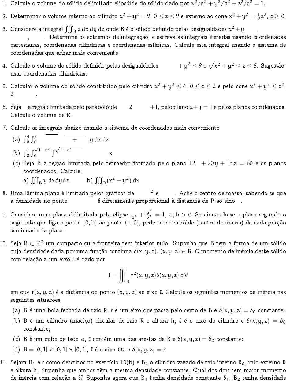 SMA0355 – Cálculo III Terceira Lista 1. Calcule o volume do s�olido delimitado elips�oide do s�olido dado por x2/a2 + y2/b2 + z2/c2 = 1. 2. Determinar o volume interno ao cilindro x2 + y2 = 9, 0 ≤ z ≤ 9 e externo ao cone x2 + y2 = 1 9 z2, z ≥ 0. 3. Considere a integral ∫∫∫ B z dxdydz onde B �e o s�olido de�nido pelas desigualdades x2+y2 ≤ z, x2+y2+ z2 ≤ 2, z ≥ 0. Determine os extremos de integra�c~ao, e escreva as integrais iteradas usando coordenadas cartesianas, coordenadas cil��ndricas e coordenadas esf�ericas. Calcule esta integral usando o sistema de coordenadas que achar mais conveniente. 4. Calcule o volume do s�olido de�nido pelas desigualdades 1 ≤ x2 +y2 ≤ 9 e √ x2 + y2 ≤ z ≤ 6. Sugest~ao: usar coordenadas cil��ndricas. 5. Calcular o volume do s�olido constitu��do pelo cilindro x2 + y2 ≤ 4, 0 ≤ z ≤ 2 e pelo cone x2 + y2 ≤ z2, 2 ≤ z ≤ 5. 6. Seja R a regi~ao limitada pelo parabol�oide z = 2x2+y2+1, pelo plano x+y = 1 e pelos planos coordenados. Calcule o volume de R. 7. Calcule as integrais abaixo usando a sistema de coordenadas mais conveniente: (a) ∫4 0 ∫3 0 ∫√9−x2 0 √ x2 + y2 dydxdz (b) ∫1 0 ∫√1−x2 0 ∫√1−x2−y2 0 z2dzdydx (c) Seja B a regi~ao limitada pelo tetraedro formado pelo plano 12 x + 20 y + 15 z = 60 e os planos coordenados. Calcule: a) ∫∫∫ B ydxdydz b) ∫∫∫ B (x2 + y2)dxdydz 8. Uma lâmina plana �e limitada pelos gr�a�cos de y = x2 e y = 4. Ache o centro de massa, sabendo-se que a densidade no ponto P = (x, y) �e diretamente proporcional �a distância de P ao eixo y. 9. Considere uma placa delimitada pela elipse x2 a2 + y2 b2 = 1, a, b > 0. Seccionando-se a placa segundo o segmento que liga o ponto (0, b) ao ponto (a, 0), pede-se o centr�oide (centro de massa) de cada por�c~ao seccionada da placa. 10. Seja B ⊂ R3 um compacto cuja fronteira tem interior nulo. Suponha que B tem a forma de um s�olido cuja densidade dada por uma fun�c~ao cont��nua δ(x, y, z), (x, y, z) ∈ B. O momento de in�ercia deste s�olido com rela�c~ao a um eixo ℓ �e dado por I = ∫∫∫ B r2(x, y, z)δ(x, y, z)dV em que r(x, y, z) �e a distância do ponto (x, y, z) ao eixo ℓ. Calcule os seguintes momentos de in�ercia nas seguintes situa�c~oes (a) B �e uma bola fechada de raio R, ℓ �e um eixo que passa pelo cento de B e δ(x, y, z) = δ0 constante; (b) B �e um cilindro (maci�co) circular de raio R e altura h, ℓ �e o eixo do cilindro e δ(x, y, z) = δ0 constante; (c) B �e um cubo de lado a, ℓ cont�em uma das arestas de B e δ(x, y, z) = δ0 constante; (d) B = [0, 1]× [0, 1]× [0, 1], ℓ �e o eixo Oz e δ(x, y, z) = x. 11. Sejam B1 e ℓ como descritos no exerc��cio 10(b) e B2 o cilindro vazado de raio interno R0, raio externo R e altura h. Suponha que ambos têm a mesma densidade constante. Qual dos dois tem maior momento de in�ercia com rela�c~ao a ℓ? Suponha agora que B1 tenha densidade constante δ1, B2 tenha densidade SMA0355 – Cálculo III Terceira Lista constante δ2 e a massa de ambos sejam iguais. Neste caso, qual dos dois tem maior momento de in�ercia com rela�c~ao a ℓ? Respostas 1. 4πabc/3 2. 54π. 3. ∫1 −1 ∫√1−x2 − √ 1−x2 ∫√2−x2−y2 x2+y2 z dzdydx = ∫2π 0 ∫1 0 ∫√2−r2 r2 zr dzdrdθ ∫2π 0 ∫π/4 0 ∫√2 0 ρ3 cosφ senφdρdφdθ+ ∫2π 0 ∫π/2 π/4 ∫ cosφ/ sen 2 φ 0 ρ3 cosφ senφdρdφdθ = 7π 12 4. 92π/3 5. 47π 6. 3/4 7. a) 18π b) π/30. c-a) 15/2 c-b) 34 8. (0, 8/3) 9. Parte menor: ( 2a 3(π−2) , 2b 3(π−2) ). Parte maior: (− 2a 3(3π+2) ,− 2b 3(3π+2) ). 10. (a) I = 2MR2/5, em que M �e a massa de B (b) I = MR2/2, em que M �e a massa de B (c) I = 2Ma2/3, em que M �e a massa de B (d) 5/12 11. B1; B2.