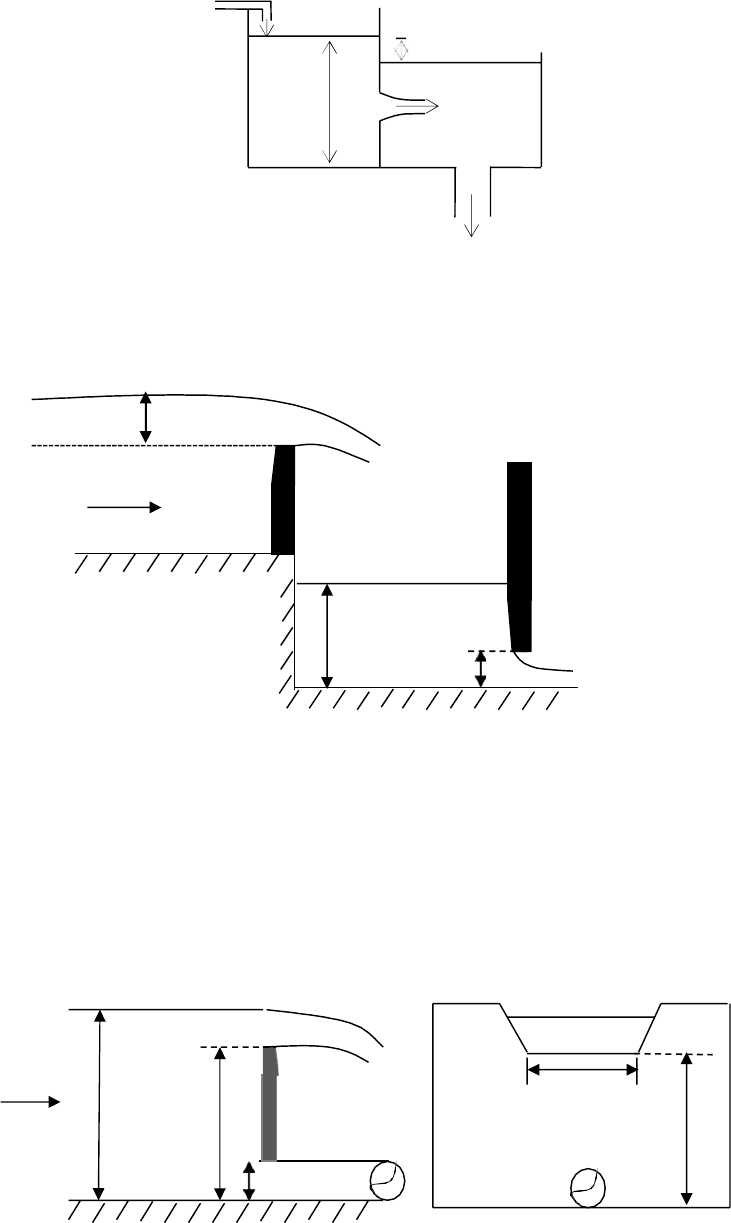 Q ∆h HA 1. Uma tubulação descarrega uma vazão Q em um reservatório A, de onde passa ao reservatório B por um bocal de bordas arredondadas e finalmente escoa para a atmosfera por um bocal cilíndrico externo. Após o sistema entrar em equilíbrio, determine a diferença de nível entre os reservatórios e a vazão Q. Dados: bocal de bordas arredondadas: A = 0,002 m2 , Cd = 0,98; bocal cilíndrico externo: A = 0,001 m2; Cd = 0,82; Ha = 0,80m. Considere escoamento permanente. 2. Na instalação abaixo, o vertedor é retangular com 2 contrações laterais, largura da soleira igual a 0,80m e carga de 0,20m. A comporta plana e vertical possui largura igual a 0,5m, a abertura do orifício igual a 0,10m e descarrega livremente na atmosfera. Determinar a carga à montante da comporta. 4. Uma combinação de um vertedor trapezoidal tipo cipoleti, parede fina, e um tubo curto em concreto com entrada em aresta viva, de 300 mm de diâmetro e 12 m de comprimento, com escoamento livre a jusante é colocada em um canal retangular, como mostrado a seguir. Considerando que a máxima vazão possível que passa somente pelo tubo curto seja igual a 0,21 m3/s e desprezando a carga cinética de aproximação para a estrutura e não corrigindo o coeficiente de vazão do orifício pelo fato da contração incompleta, calcular a profundidade H a montante da estrutura para uma vazão total de 0,6 m3/s. Q m h Q y b 1,20 m 1,20 H 1,20 m D = 300 mm 4m 2m 0m x H1 h=5m 2 H2 h1 h2 1 A B 7. Um reservatório de seção quadrada de 1,0m de lado possui um orifício circular de parede fina de 2 cm2 de área, com coeficiente de velocidade Cv = 0,97 e coeficiente de contração Cc = 0,63, situado a 2m acima do piso, conforme figura. Inicialmente, com uma vazão de alimentação constante, o nível de água no reservatório mantém-se estável na cota 4m. Nestas condições, determine: a) a vazão Q; b) a perda de carga no orifício; c) a distância x da vertical passando na saída do orifício até o ponto onde o jato toca o solo (alcance do jato) e, d) interrompendo-se bruscamente a alimentação, Q = 0, no instante t = 0, determine o tempo necessário para o nível de água no reservatório baixar até a cota 3m. Q 9. Na parede vertical do reservatório A de grandes dimensões existe um orifício afogado “1” que deságua em um reservatório “B”. Este por sua vez possui também um orifício “2” de paredes delgadas que deságua livremente na atmosfera. Supondo que o escoamento seja permanente e sabendo-se que a altura “h” indicada na figura vale 5m, pede-se: a) os valores de H1 e de H2; b) a vazão do escoamento. Dados: Cv1 = Cv2 =0,98; Cc1 = Cc2 = 0,61; A1 = 2cm²; A2 = 4cm² 10. Determinar o coeficiente de descarga de um aspersor dotado de um bocal de diâmetro igual a 4,0 mm, que lança uma vazão de 1m³/h ao estar submetido a uma pressão de funcionamento de 2,8 kgf/cm². Desprezar a velocidade de aproximação. Dados: H2O = 1000 kgf/m³. 15. Um vertedor triangular com ângulo de abertura de 90º descarrega água com uma carga de 0,15m em um tanque, que possui no fundo 3 orifícios circulares de parede delgada, com 40 mm de diâmetro. Na condição de equilíbrio, determine a vazão e a profundidade da água no tanque. 5) Calcule a vazão através do conduto, tendo como dados: A1 = 0,01m2, g = 10m/s2, P2 = 2000 kgf/m2, água = 1000 kgf/m3 água = 1,0, água = 1000 kg/m3. 9) Qual é a diferença de pressão entre os pontos 1 e 2? O fluido nas tubulações é água e o líquido indicador é o Hg. Dados: água = 1000 kgf/m3, Hg = 13600 kgf/m3 33) Determine a pressão efetiva nos pontos F, E, B, D, H e C., Hg = 13600 kgf/m3 = 0,96.