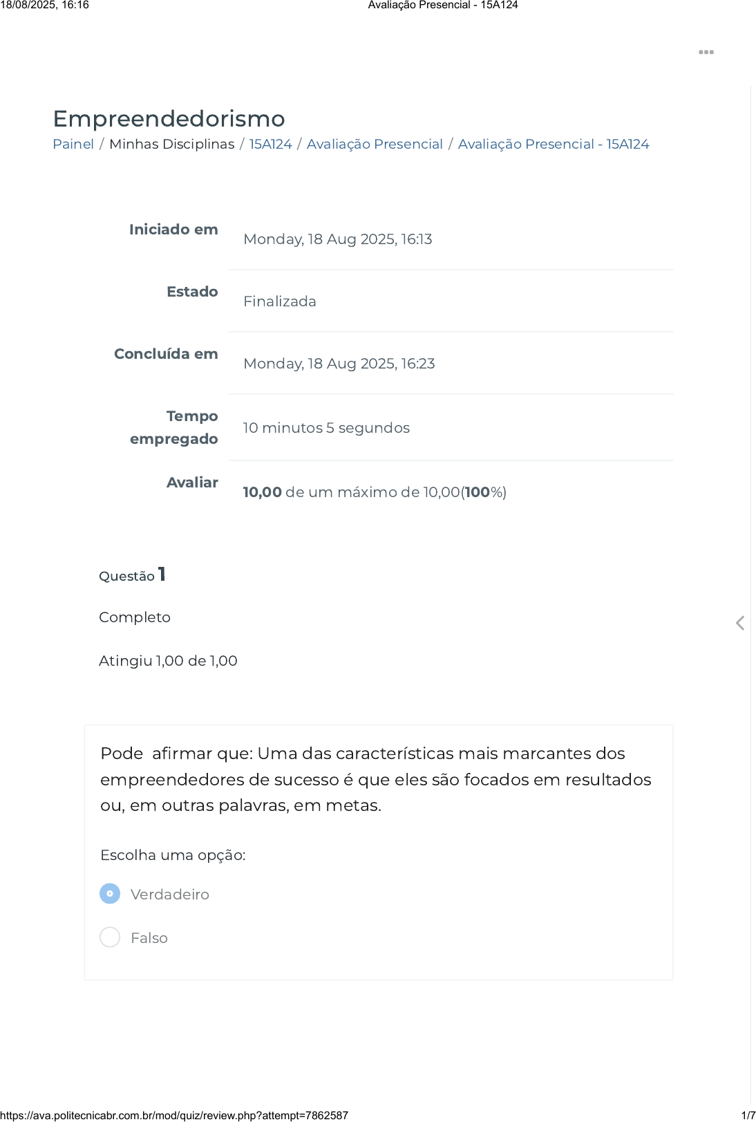 Painel / Minhas Disciplinas / 15A124 / Avaliação Presencial / Avaliação Presencial - 15A124 Empreendedorismo Iniciado em Monday, 18 Aug 2025, 16:13 Estado Finalizada Concluída em Monday, 18 Aug 2025, 16:23 Tempo empregado 10 minutos 5 segundos Avaliar 10,00 de um máximo de 10,00(100%) Questão 1 Completo Atingiu 1,00 de 1,00 Pode afirmar que: Uma das características mais marcantes dos empreendedores de sucesso é que eles são focados em resultados ou, em outras palavras, em metas. Escolha uma opção: Verdadeiro Falso 18/08/2025, 16:16 Avaliação Presencial - 15A124 https://ava.politecnicabr.com.br/mod/quiz/review.php?attempt=7862587 1/7 https://ava.politecnicabr.com.br/my/ https://ava.politecnicabr.com.br/my/ https://ava.politecnicabr.com.br/course/view.php?id=883 https://ava.politecnicabr.com.br/course/view.php?id=883#section-15 https://ava.politecnicabr.com.br/mod/quiz/view.php?id=29067 https://ava.politecnicabr.com.br/ Questão 2 Completo Atingiu 1,00 de 1,00 O tema da qualidade e da eficiência envolve dois níveis, quais são eles: Escolha uma opção: Questão 3 Completo Atingiu 1,00 de 1,00 O poder não é exercido apenas dentro da organização mas também fora dela, envolvendo o mapeamento de pessoas-chave em outras organizações e a formulação de estratégias de persuasão. Escolha uma opção: a. nível comportamental e técnico b. nível pessoal e comportamental c. nível técnico e pessoal Verdadeiro Falso 18/08/2025, 16:16 Avaliação Presencial - 15A124 https://ava.politecnicabr.com.br/mod/quiz/review.php?attempt=7862587 2/7 https://ava.politecnicabr.com.br/ Questão 4 Completo Atingiu 1,00 de 1,00 Uma ferramenta muito útil é o denominado “mapa de poder” (COOLEY, 1991), que classifica o poder em quantas áreas? Escolha uma opção: Questão 5 Completo Atingiu 1,00 de 1,00 Empreendedores de sucesso desempenham o papel de líderes, sendo que seu estilo de liderança sofre influência direta das características de sua personalidade, como motivação, forma de captar informações e processá-las (decidir). Escolha uma opção: a. 2 b. 5 c. 4 d. 6 e. 3 Verdadeiro Falso 18/08/2025, 16:16 Avaliação Presencial - 15A124 https://ava.politecnicabr.com.br/mod/quiz/review.php?attempt=7862587 3/7 https://ava.politecnicabr.com.br/ Questão 6 Completo Atingiu 1,00 de 1,00 Podemos afirmar que as pessoas com comprometimento colabora com os empregados ou se coloca no lugar deles, se necessário, para terminar uma tarefa. Escolha uma opção: Questão 7 Completo Atingiu 1,00 de 1,00 Atualmente, o empreendedorismo é visto como um ramo da administração de empresas e, no Primeiro Mundo, as escolas de administração não conseguiram ter um setor, grupo ou área de pesquisa em empreendedorismo. Isso só ser dar atualmente. Escolha uma opção: Verdadeiro Falso Verdadeiro Falso 18/08/2025, 16:16 Avaliação Presencial - 15A124 https://ava.politecnicabr.com.br/mod/quiz/review.php?attempt=7862587 4/7 https://ava.politecnicabr.com.br/ Questão 8 Completo Atingiu 1,00 de 1,00 O estilo democrático se baseia na ideia de que o poder do líder é decorrente da posição que ocupa e de que as pessoas são preguiçosas e irresponsáveis por natureza (visão conhecida como Teoria X), enquanto o estilo autoritário supõe que o poder do líder é conferido pelo grupo liderado e que as pessoas podem basicamente dirigir-se a si mesmas e ser criativas no trabalho, desde que adequadamente motivadas (abordagem denominada Teoria Y). Escolha uma opção: Questão 9 Completo Atingiu 1,00 de 1,00 No processo de empreender ou desenvolver algo novo, é possível que a diversidade de informações, experiências e objetivos buscados sirva, algumas vezes, para desviar o foco do que desejamos em vez de facilitar a nossa tarefa. Escolha uma opção: Verdadeiro Falso Verdadeiro Falso 18/08/2025, 16:16 Avaliação Presencial - 15A124 https://ava.politecnicabr.com.br/mod/quiz/review.php?attempt=7862587 5/7 https://ava.politecnicabr.com.br/ Questão 10 Completo Atingiu 1,00 de 1,00 Levando em consideração o que estudamos nesta disciplina, podemos afirmar que: a iniciativa permeia todas as outras competências, pois é preciso ter a iniciativa de estabelecer metas, buscar informações, fazer um plano etc. As coisas não acontecem para as pessoas bem-sucedidas apenas porque elas querem. Acontecem porque elas querem e se mexem. Escolha uma opção: Verdadeiro Falso Entre em Contato https://www.politecnicabr.com.br 0800 084 2627 0800 084 2627 Links Úteis Dicas da nossa Diretora Acadêmica Planner de Estudos Declaração de Matrícula Orientações do AVA Abertura de Ticket Fale com o Tutor Cronograma de Estudos Manual de Estágio Manual de Competência Siga-nos nas redes sociais 18/08/2025, 16:16 Avaliação Presencial - 15A124 https://ava.politecnicabr.com.br/mod/quiz/review.php?attempt=7862587 6/7 https://www.politecnicabr.com.br/ https://soundcloud.com/user-501638417/sets/escola-politecnica-brasileira https://soundcloud.com/user-501638417/sets/escola-politecnica-brasileira https://storage.googleapis.com/sirius-pubstore/semestre_plannerdeestudo%20poli.pdf https://storage.googleapis.com/sirius-pubstore/semestre_plannerdeestudo%20poli.pdf https://storage.googleapis.com/sirius-pubstore/declaracao_matricula.pdf https://storage.googleapis.com/sirius-pubstore/declaracao_matricula.pdf https://storage.googleapis.com/sirius-pubstore/orientacoes_ava.pdf https://storage.googleapis.com/sirius-pubstore/orientacoes_ava.pdf https://storage.googleapis.com/sirius-pubstore/abertura_ticket.pdf https://storage.googleapis.com/sirius-pubstore/abertura_ticket.pdf https://storage.googleapis.com/sirius-pubstore/fale_com_tutor.pdf https://storage.googleapis.com/sirius-pubstore/fale_com_tutor.pdf https://storage.googleapis.com/sirius-pubstore/cronograma_estudos.pdf https://storage.googleapis.com/sirius-pubstore/cronograma_estudos.pdf https://storage.googleapis.com/sirius-pubstore/manual_estagio.pdf https://storage.googleapis.