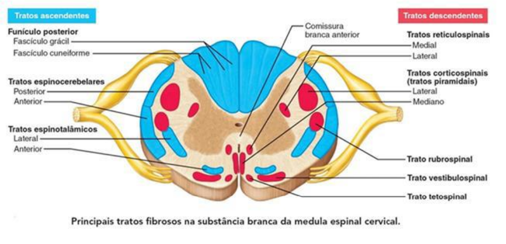Vias Aferentes do Sistema Nervoso Resumindo a via Aferentes, é a via que conduz os estímulos sensitivos até a medula pelas raízes dorsais da medula, e em seguida para o SNC através dos tratos ascendentes da mesma. Os receptores (Mecano, noci, termo...) são ativados disparando um potencial de ação, o qual percorre todo neurônio pseudounipolar o qual possui seu corpo (Gânglio sensitivo) próximo a raiz dorsal da medula, esse impulso vai pela raiz posterior ou dorsal da medula o qual irá ser interpretado pela substância cinzenta e será conduzido ao SNC pela substância branca. Todo estímulo sensitivo do corpo ele pode ir até o encéfalo por dois caminhos: 1. Funículo posterior – lemnisco medial: Cruzamento ocorre no bulso 2. Sistema anterolateral.: Cruzamento ocorre na própria medula Figura 2 SISTEMA ANTERO LATERAL Figura 1FUNÍCULO POSTERIOR - LEMNÍSCO MEDIAL Funículo Posterior – Lemnísco Medial Conduz sinais ascendentes até o bulbo principalmente pela parte posterior da medula espinhal. Em seguida, cruza a sinapse ou decusa para o lado oposto no bulbo. Os sinais continuam ascendendo pelo tronco encefálico até o tálamo por meio do lemnisco medial. Ao adentrar a medula espinhal pelas raízes dorsais, as fibras grandes de Mecanoreceptores se dividem para formar um ramo medial e outro lateral. Onde o ramo medial vai a parte medial da medula e vai ascendente até o encéfalo, já o lateral adentra no corno posterior e se divide várias vezes para fornecer terminais que farão sinapses com neurônios locais. Seu trajeto é: 1. As fibras sensitivas adentram ao funículo posterior e passam sem interrupções onde fazem sinapses nos núcleos cuneiforme ou grácil. (1) 2. A partir desses núcleos, neurônios se cruzam ao lado oposto no tronco encefálico e continuam ascendendo pelos lemniscos mediais até o tálamo.(2) 3. No tálamo as fibras do lemnísco medial terminam na área sensorial talâmica que recebe o nome de complexo ventobrasal. (3) 4. Depois fibras projetam-se para o giro pós-central do córtex cerebral na região denominada somatossensorial No funículo posterior existem dois fascículos: • Fásciculo grácil: é uma via sensitiva ascendente, que faz parte do sistema dorsal das colunas posteriores, se inicia desde as regiões coccígeas e sacrais e vai até o bulbo. São fibras aferentes que entram pela raiz posterior. Conduz impulsos provenientes dos membros inferiores e da metade inferior do tronco. • Fásciculo cuneiforme: Evidente a partir da medula torácica alta, formado por fibras que penetram pelas raízes dorsais das cervicais e torácicas terminando no núcleo cuneiforme. Conduz impulsos originados nos membros superiores. Suas funções são: 1. Propriocepção consciente: permite sem auxilio da visão, situar uma parte do corpo. 2. Tato discriminativo: permite localizar e descrever as características táteis de um objeto. 3. Sensibilidade vibratória (Palestesia). 4. Estereognosia: Capacidade de perceber com as mãos a forma e o tamanho de um objeto . Sistema/Via Anterolateral Transmitem informações de: Calor, frio, dor (lateral) tato grosseiro, cócegas, prurido sensações sexuals (anterior). As fibras anterolaterais da medula se originam principalmente no corno dorsal nas lâminas I (Dor e temperatura, marginal layer), IV, V e VI (Tato e nocicepção). Seu trajeto é: 1. Raizes dorsais entram na parte posterior da medula e cruzam imediatamente na comissura cinzenta da medula para o lado oposto através do segundo neurônio nas colunas brancas anterior e lateral, aonde se direcionam para os tratos espinotalâmico anterior (Pressão e tato protopático) e espinotalâmico lateral (Dor e temperatura) ou espinocerebelar posterior e anterior. 2. As fibras ascendem indo para dois destinos: - Núcleos reticulares do tronco encefálico: importante para a modulação da percepção da dor e para reflexos - Tálamo: Complexo ventrobasal (VPL/VPM): Recebendo sinais táteis e enviando ao córtex somatossensorial - Núcleos intralaminares: Recebendo sinais de dor difusa. Vias Trigeminais Responsáveis pela sensibilidade somática da cabeça que tem sua origem através do nervo trigemino. Possui duas vias sendo uma Exteroceptiva e Proprioceptiva. Exteroceptiva Carrega as sensações que vêm de fora, através de receptores idênticos (dor, pressão e tato). 1. O primeiro neurônio está localizado no Gânglio Trigeminal ou Gânglio de Gasser onde prolongamentos centrais e periféricos vão ser distribuídos. O prolongamento central vai para o tronco encefálico, e o prolongamento periférico vai para os receptores. 2. O segundo neurônio vai estar no tronco encefálico, em dois núcleos, no núcleo do trato espinhal (cruza) e o núcleo sensitivo principal do trigêmeo. (não cruza) Quando o estimulo terminar no núcleo do trato espinhal vai detectar temperatura e dor, já no núcleo principal tato discriminativo 3. Em seguida esses neurônios vão ao tálamo no núcleo ventro póstero medial no tálamo. Via Próprioceptiva 1. Os neurônios estão no núcleo do trato mesencefálico vai sofrer sinapse e vai subir para o tálamo onde vai fazer sinapse com o terceiro neurônio.