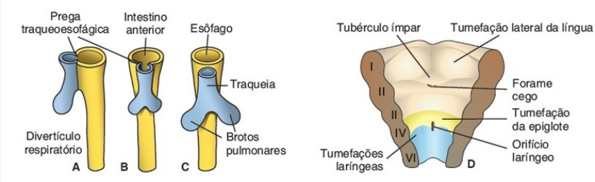 · Compreender a embriologia do sistema respiratório · Primórdio respiratório - Por volta de 4 semanas, surge o divertículo respiratório ou broto pulmonar - Seu aparecimento e localização dependem do aumento do ácido retnóico produzido pelo mesoderma adjacente eleva a expressão de um fator de transcrição que induz a formação do broto, seu crescimento e a diferenciação dos pulmões - Mesoderma esplâncnico do intestino: de onde surgem os tecidos cartilaginoso muscular e conjuntivo para a formação da traqueia e dos pulmões - Inicialmente, o divertículo está em comunicação aberta com o intestino anterior, a partir das pregas traqueoesofágicas eles são separados e vai ser dividido o esôfago, a traqueia e os brotos pulmonares, a comunicação com a faringe vai ser feita pelo orifício faríngeo · Faringe e arcos faríngeos - Os arcos faríngeos começam a se desenvolver no início da quarta semana quando as células da crista neural migram para a futura região da cabeça e do pescoço - O primeiro par aparece como elevações superficiais laterais à faringe em desenvolvimento - Ao final da quarta semana, quatro pares de arcos faríngeos são visíveis externamente, o quinto e o sexto são rudimentares e não são visíveis na superfície do embrião - Os arcos faríngeos são separados por fissuras – os sulcos faríngeos e sustentam as paredes laterais da faringe primitiva que deriva da parte cefálica do intestino anterior - Os arcos faríngeos contribuem para a formação da face, cavidades nasais, boca, laringe, faringe e pescoço · Laringe - Seu revestimento interno vem do mesoderma e suas cartilagens e músculos vem a partir do 4º e 6º arcos faríngeos - O orifício laríngeo inicialmente possui formato de “T” pela rápida proliferação desses arcos - Subsequentemente, o mesênquima desses arcos se transforma nas cartilagens tireóide, cricóidea e aritenóidea, dando o formato característico da laringe adulta - Ventrículos laríngeos: são recessos laterais que surgem após a vacuolização (formação de vacúolos) e recanalização (retomada do fluxo sanguíneo) após a oclusão temporária do lúmen do epitélio laríngeo e formam as pregas vocais falsas e verdadeiras - Por a musculatura da laringe se derivada dos arcos faríngeos, vai ser inervada pelo nervo vago e seus ramos, sendo que o nervo laríngeo superior inerva os derivados do 4º arco faríngeo e o nervo laríngeo recorrente inerva os derivados do 6º arco faríngeo · Traqueia, brônquios e pulmões - Durante a separação do intestino anterior, o broto pulmonar forma a traqueia e os brotos brônquicos - No início da quinta semana, cada um dos brotos se alarga para formar os brônquios principais direito e esquerdo, sendo que o brônquio principal direito possui 3 brônquios secundários e o principal esquerdo, 2 brônquios secundários, que formaram os 3 lobos pulmonares direitos e os 2 esquerdos - Com o crescimento latero-caudal dos brotos pulmonares, os canais pericardioperitoniais inicialmente estreiros se encontram de cada lado do intestino anterior e são gradualmente preenchidos pelos brotos pulmonares em expansão - Depois, as pregas pleuroperitoniais e pleuropercárdicas vão separar esses canais das cavidades pleurais primitivas e o mesoderma que cobre o exterior dos pulmões se torna a pleura visceral e o que cobre o interior, a pelura parietal e entre elas o espaço é chamado de cavidade pleural - Com a continuação do desenvolvimento, os brônquios secundários dão origem por meio de divisão a 10 brônquios terciários no pulmão direito e 8 no pulmão esquerdo, criando os segmentos broncopulmonares no pulmão adulto - Essa ramificação é regulada por interações epiteliomesenquimais e os sinais para essa ramidicação são emitidos do mesoderma, enquanto ela acontece, o pulmão toma uma posição mais caudal de modo que no nascimento a bifurcação da traqueia esteja oposta à quarta vértebra torácica - Até o 7º mês, ocorrem cerca de 17 gerações de subdivisões · Maturação - Fase canalicular: divisão contínua dos bronquíolos até o sétimo mês pré-natal em um número maior de canais cada vez menores com aumento do suprimento vascular - Bronquíolos terminais se dividem em bronquíolos respiratórios e cada um se divide em 3 a 6 ductos alveolares que terminam nos sacos alveolares ou alvéolos primitivos que estão cercados por células alveolares achatadas próximas aos capilares vizinhos - No final do 7º mês, há uma quantidade suficiente de sacos alveolares e de capilares maduros para uma troca gasosa adequada e a sobrevivência do prematuro - Desde os 2 últimos meses pré-natais até alguns anos de vida, a quantidade de sacos alveolares aumenta gradativamente - Células epiteliais do tipo I: revestem os sacos tornam-se mais achatadas e os capilares adjacentes se projetam para esses sacos, formando a barreira sangue-ar - Células alveolares epiteliais do tipo II: produzem surfactante que diminui a tensão superficial na interface ar-alvéolo, diminuindo a pressão necessária para expandir os pulmões e facilitando a inspiração e evitando o colapso alveolar - A produção de surfactante aumenta durante as duas últimas semanas de nascimento - Não existem alvéolos maduros antes do nascimento, estima-se que por ocasião do nascimento exista apenas um sexto dos alvéolos encontrados no adulto - Os movimentos respiratórios fetais começam antes do nascimento e são importantes para a estimulação do desenvolvimento pulmonar e para o condicionamento dos músculos respiratórios - Quando a respiração começa no nascimento, a maior parte do líquido dos pulmões é absorvida rapidamente pelo sangue e pelos capilares linfáticos e um pequeno volume é expelido pela traqueia e brônquios durante o parto - O ar que é respirado após o parto enche a cavidade pleural - Embora os alvéolos aumentem de tamanho, o crescimento dos pulmões após o