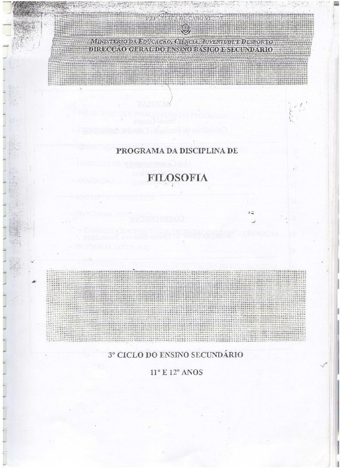 DE MINISTERIO DA DESPORTO DIRECCAO GERAL DO ENSINO BASICO E SECUNDARIO PROGRAMA DA DISCIPLINA DE FILOSOFIA 3° CICLO DO ENSINO SECUNDÁRIO 11° E ANOSTITULO Programa da disciplina de Filosofia 3° Ciclo 11° e 12° Anos AUTORES Isabel Gomes Consultora da Fundação Calouste Gulbenkian COLABORADORES Isidoro Tavares Marina Ramos COORDENAÇÃO Direcção Geral do Ensino Básico e Secundário EDITOR Ministério da Educação, Ciência, Juventude Desporto C.P 111 - Praia República de Cabo VerdeÍNDICE - PRESSUPOSTOS E FINALIDADES DO PROGRAMA 3 - OBJECTIVOS GERAIS 7 - ORIENTAÇÃO METODOLÓGICA GERAL 8 - UNIDADES PROGRAMÁTICAS 9 - AVALIAÇÃO 12 - MATRIZ DE CONTEÚDOS 14 - PROGRAMA DO ANO 18 CONTEÚDOS, OBJECTIVOS, ORIENTAÇÕES METODOLÓGICAS 18 - PROGRAMA DO 12° ANO 28 OBJECTIVOS, ORIENTAÇÕES METODOLÓGICAS 28 BIBLIOGRAFIA RECOMENDADA 35 - GESTÃO TEMPORAL DO PROGRAMA 39de 3 PRESSUPOSTOS E FINALIDADES DO PROGRAMA A disciplina de Filosofia faz parte do tronco comum de todos os cursos do ciclo do Ensino Secundário. assim a uma heterogeneidade de alunos com grande diversidade de interesses e motivações: desde alunos de Ciências Tecnologia, de onde sairão futuros agrónomos, engenheiros, médicos,... [Via e os jovens que encontrarão a sua futura área de trabalho na construção civil, mecânica, análises [Via aos alunos do Curso de Artes, em que se enquadram os futuros arquitectos, pintores, escultores,... Geral] e OS jovens das Artes Oficios [Via Técnica]. Se à disciplina de Filosofia foi conferido um papel fundamental na formação geral dos jovens cabo-verdianos que fazem parte do universo de estudantes do ciclo, esta deverá corresponder lugar que lhe foi confiado, permitindo, através das suas metodologias de leccionação assim como dos temas abordados, o desenvolvimento de competências essenciais a qualquer cidadão. Competências do dominio cognitivo, afectivo e sócio-moral. Pretende-se que aluno, após OS dois anos de trabalho na disciplina de Filosofia, tenha uma visão diferente do mundo, do seu pais e de si próprio: uma perspectiva mais alargada e livre de preconceitos. Este programa deverá, ainda, fornecer quadros referenciais históricos assim como um aparelho conceptual possibilitadores de uma fácil inserção no Ensino Superior. programa do anos oscila entre a necessidade de "ser fiel à vida", levando jovens a repensarem a sua própria experiência a do seu país e, fornecer conhecimentos no âmbito da História da Pretende-se que cada jovem comece a perceber pequenos problemas que lugar onde vive lhe coloca. Comece a despertar para a relação destes problemas localizados com resto do mundo e inicie um processo de auto-reflexão da construção de uma identidade pessoal e cultural.Programa de Filosofia 4 Só pessoas conscientes da sua identidade pessoal e cultural estarão preparadas para um enriquecedor confronto com a tradição histórica da filosofia e as clássicas temáticas filosóficas, sem destas fazerem mero achado arqueológico. Só jovens conhecedores da memória cultural que envolveu desde que nasceram, poderão reconhecer esboçar a sua identidade pessoal (que é também identidade cultural). o passado constitui-nos, mas é preciso que nos interpele hoje para, num incessante fluir e refluir do presente ao passado do passado ao presente, se de forma mais consciente, caminhos do futuro. Neste sentido, programa aqui apresentado assenta numa concepção contemporânea do homem. Com Arnold Gehen e Lain Entralgo assumimos a vida humana como tarefa permanente vital do homem. Homem, ser enraizado circunstancial situado quando confrontado com outros animais revela-se detentor de uma existência que requer 0 outro com qual se relaciona, mediado pela linguagem.¹ A consciência da vida humana como jogo no qual homem se encontra desde sempre já jogado; jogo que transcende e que não conseguiu, até ao momento, explicar, constituirá pressuposto indispensável ao reconhecimento da necessidade e sentido da reflexão Este caminhante, movido pela procura de sentido, desde há muitos séculos se questiona do seu lugar no mundo, procurando conquistar esse sentido que lhe é dado configurar sem prévia orientação. Daqui emergiu um saber critico, racional marcado pela inquietação permanente: a Filosofia.³ ser enraizado não pode esquecer legado natural nem a herança histórico- cultural onde mergulha as suas E a partir da cultura em que está que vai herdando simultaneamente construindo uma "tábua de valores" orientadora da sua Esta especificidade da acção e reflexão humana frente ao mundo, concretiza-se em diversas dimensões axiológicas, que estão na base das suas acções para cujo Ct. I HOMEM E SEU LUGAR NO MUNDO. 2. Mundo Como Cf. A FILOSOFIA E A SUAPrograma de Filosofia sentido, hoje em dia muitas vezes é preciso alettar os jovens. Daqui resulta a necessidade de uma reflexão em tomo da da da Apesar de a existência humana não ter sido resultante da nossa vontade criadora, o nosso desejo de saber, aliado à vontade de poder, traduziu-se na ciência e na técnica, através das quais o homem procura entender 0 funcionamento do mundo (e do próprio homem) para mais facilmente 0 poder dominar e, no limite, A ciência e a técnica encontram no chão grego a sua inspiração, os seus primeiros mitos gérmen da rigorosa linguagem lógica em que se virão a Mas, neste seu ansioso e incessante caminhar em busca de um saber que é poder, o homem muitas vezes ignorou o corpo vivo que o constitui. Esqueceu-se que ele é natureza e esqueceu outros sem 08 quais não poderia subsistir. Daqui resultam grandes problemas que assolam mundo contemporâneo marcado pelo individualismo, e hedonismo Problemas que o filósofo tem de pensar hoje, se deseja preservar a vida e construir um mundo mais Mais do que fazer da Filosofia um mero lugar de exposição de conhecimentos, pretende-se, com este programa, formar cidadãos mais conscientes, mais livres e responsáveis.