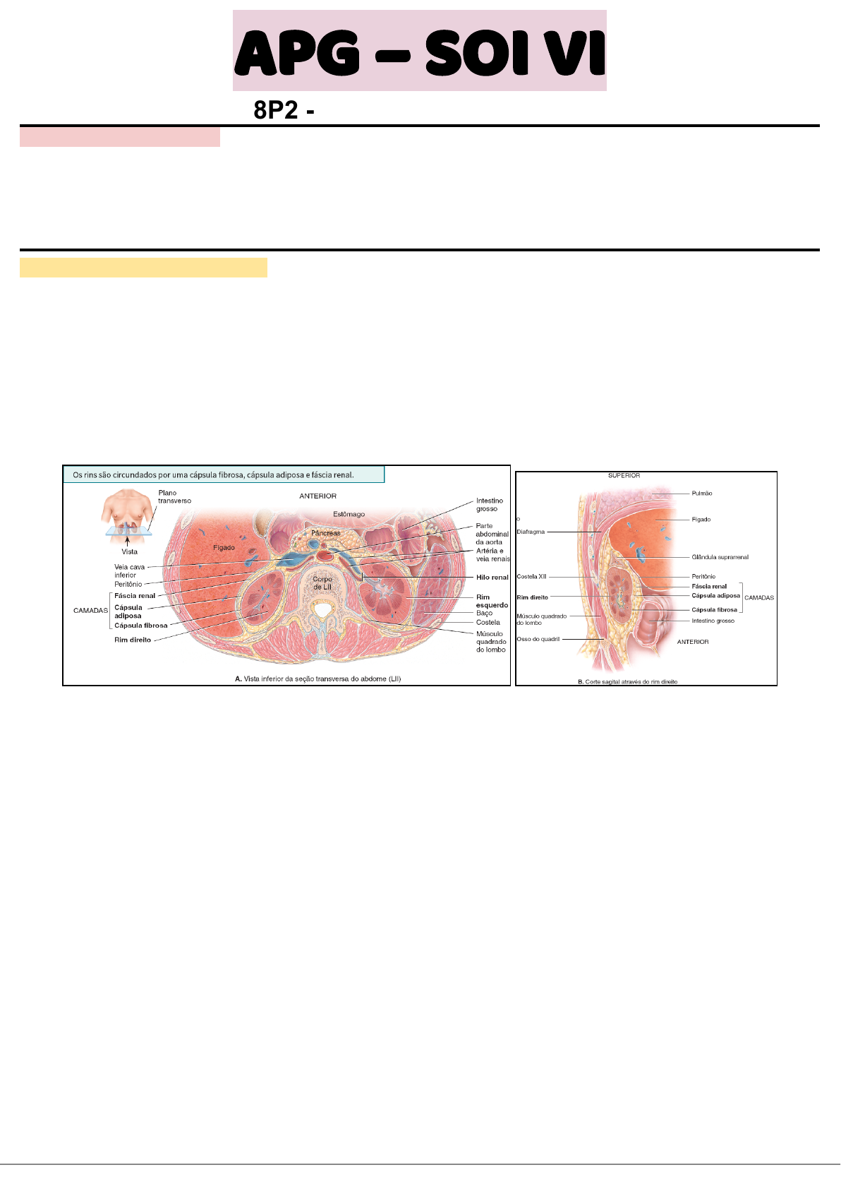 APG – SOI VI S8P2 - LESÃO RENAL AGUDA OBJETIVOS DE ESTUDO - REVER A MORFOFISIOLOGIA DOS RENAL; - ENTENDER A EPIDEMIOLOGIA, ETIOLOGIA, FISIOPATOLOGIA, MANIFESTAÇÕES CLÍNICAS, COMPLICAÇÕES, DIAGNÓSTICO E TRATAMENTO DAS LESÕES RENAIS AGUDA , MORFOFISIOLOGIA DOS RINS RINS Os rins são órgãos pares avermelhados, com formato de feijão, localizados logo acima da cintura, entre o peritônio e a parede posterior do abdome. Como sua posição é posterior ao peritônio da cavidade abdominal, são considerados órgãos retroperitoneais. Os rins estão localizados entre os níveis da última vértebra torácica e terceira vértebra lombar. O rim direito é ligeiramente mais baixo do que o esquerdo, visto que o fígado ocupa um espaço considerável no lado direito, superiormente ao rim. Anatomia externa dos rins Um rim adulto normal mede de 10 a 12 cm de comprimento, 5 a 7 cm de largura e 3 cm de espessura. A margem medial côncava de cada rim está voltada para a coluna vertebral. Próximo ao centro da borda côncava, existe um entalhe denominado hilo renal, através do qual o ureter emerge do rim, juntamente de vasos sanguíneos, vasos linfáticos e nervos. Três camadas de tecido circundam cada rim: a fáscia renal, a cápsula adiposa e a cápsula fibrosa. Anatomia interna dos rins Um corte coronal através do rim revela duas regiões distintas: uma região superficial, vermelho-clara, denominada córtex renal, e uma região interna profunda, mais escura e marrom-avermelhada, denominada medula renal. A medula renal consiste em várias pirâmides renais em formato de cone. A base (extremidade mais larga) de cada pirâmide está voltada para o córtex renal, enquanto seu ápice (extremidade mais estreita), denominado papila renal, aponta em direção ao hilo renal. O córtex renal é a área de textura uniforme, que se estende da cápsula fibrosa até as bases das pirâmides renais e nos espaços entre elas. É dividido em uma zona cortical externa e uma zona justamedular interna. As partes do córtex renal que se estendem entre as pirâmides renais são denominadas colunas renais. HELLEN CAROLINE - MED T35 - SÃO LUCAS - PORTO VELHO-RO - 2024/1 Juntos, o córtex renal e as pirâmides renais da medula renal constituem a porção funcional do rim. No interior do parênquima, estão as unidades funcionais do rim – cerca de 1 milhão de estruturas microscópicas em cada rim, denominadas néfrons. O filtrado (líquido filtrado) formado pelos néfrons drena para grandes ductos papilares, que se estendem através das papilas renais das pirâmides. Os ductos papilares drenam para os cálices renais maiores e cálices renais menores. Cada rim tem 8 a 18 cálices renais menores e dois ou três cálices renais maiores. Um cálice menor recebe o filtrado dos ductos papilares de uma papila renal e o conduz até um cálice renal maior. Após sua entrada nos cálices, o filtrado torna-se urina, visto que não pode mais ocorrer reabsorção. A razão disso é que o epitélio simples dos néfrons e ductos torna-se o urotélio nos cálices. O urotélio bloqueia as trocas entre as paredes desses tubos. A partir dos cálices renais maiores, a urina flui para uma grande cavidade única, denominada pelve renal (pelv- = bacia) e, em seguida, através do ureter, até alcançar a bexiga urinária. Suprimento sanguíneo e inervação dos rins Como os rins removem escórias do sangue e regulam seu volume e composição iônica, não é surpreendente que eles sejam abundantemente irrigados por vasos sanguíneos. Embora os rins constituam menos de 0,5% da massa corporal total, eles recebem 20 a 25% do débito cardíaco em repouso, por meio das artérias renais direita e esquerda. Nos adultos, o fluxo sanguíneo renal, o fluxo sanguíneo através de ambos os rins, é de cerca de 1.200 mℓ por minuto. HELLEN CAROLINE - MED T35 - SÃO LUCAS - PORTO VELHO-RO - 2024/1 Nefrons Os néfrons constituem as unidades funcionais dos rins. Cada néfron consiste em duas partes: uma cápsula renal, onde o plasma sanguíneo é filtrado, e um túbulo renal, no qual o líquido filtrado (filtrado glomerular) passa e é ainda mais regulado. O suprimento sanguíneo, está estreitamente associado ao néfron. Os dois componentes de um corpúsculo renal são o glomérulo (rede de capilares) e a cápsula glomerular ou cápsula de Bowman, uma estrutura epitelial de parede dupla que circunda os capilares glomerulares. O plasma sanguíneo é filtrado na cápsula glomerular, e, em seguida, o líquido filtrado passa para o túbulo renal, que possui três partes principais: (1) um túbulo contorcido proximal (TCP), (2) alça de Henle e (3) um túbulo contorcido distal (TCD). O corpúsculo renal e os túbulos contorcidos proximais e distais situam-se dentro do córtex renal; a alça de Henle estende-se dentro da medula renal, faz uma curva em grampo e, em seguida, retorna ao córtex renal. Fisiologia Renal Para produzir urina, os néfrons e os ductos coletores realizam três processos básicos – filtração glomerular, reabsorção tubular e secreção tubular ● Filtração glomerular. Na primeira etapa da produção de urina, a água e a maior parte dos solutos no plasma sanguíneo atravessam a parede dos capilares glomerulares, onde são filtrados e passam para dentro da cápsula glomerular e, em seguida, no túbulo renal; ● Reabsorção tubular. À medida que o líquido filtrado flui pelos túbulos renais e ductos coletores, as células tubulares renais reabsorvem cerca de 99% da água filtrada e muitos solutos úteis. A água e os solutos retornam ao sangue que flui pelos capilares peritubulares e arteríolas retas. ● Secreção tubular. À medida que o líquido filtrado flui pelos túbulos renais e ductos coletores, as células dos túbulos renais e ductos secretam outros materiais, como escórias, medicamentos e excesso de íons, dentro do líquido.Remove uma substância do sangue. HELLEN CAROLINE - MED T35 - SÃO LUCAS - PORTO 