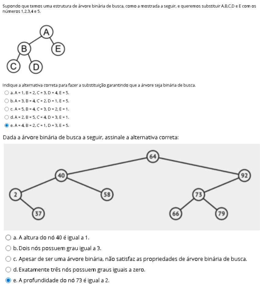 Supondo que temos uma estrutura de árvore binária de busca, como a mostrada a seguir, e queremos substituir e E com os números 5. A B E c D Indique a alternativa correta para fazer a substituição garantindo que a árvore seja binária de busca. = = Dada a árvore binária de busca a seguir, assinale a alternativa correta: 64 40 92 2 58 73 37 66 79 a. A altura do nó 40 é igual a 1. b. Dois nós possuem grau igual a 3. C. Apesar de ser uma árvore binária, não satisfaz as propriedades de árvore binária de busca. d. Exatamente três nós possuem graus iguais a zero. e. A profundidade do nó 73 é igual a 2.Uma árvore binária é uma árvore em que abaixo de cada nó existem no máximo duas subárvores. Sobre conceitos de árvore, analise as afirmativas a seguir. I. A altura de um nó equivale ao comprimento do caminho mais longo do nó até uma folha. II. A altura da árvore é a altura do nó raiz r. III. A profundidade de um nó é a distância percorrida da raiz até 0 nó. IV. Um nó folha é um nó de grau 1. Está correto 0 que se afirma em: a.l, III e IV, apenas. III e IV, apenas. C. I, e III, apenas. d. e IV, apenas. e. e III, apenas. Leia atentamente 0 que se afirma a seguir. Para realizar buscas, as árvores binárias são mais eficientes do que outras estruturas como filas e pilhas. Diante disso, assinale a alternativa que explique corretamente a afirmativa apresentada. a. A vantagem das árvores binárias está em sua aplicação, pois elas podem transformar qualquer linguagem em C + + Esse tipo de árvore alterna a linguagem que não é C + + para que 0 programa possa ser lido universalmente. b.A vantagem das árvores binárias está no seu eficiente tempo de busca quando a árvore está razoavelmente balanceada, 0 que equivale a dizer que as folhas em cada extremidade estão em igual profundidade. C. Quando utilizamos árvores binárias, conseguimos reutilizar comandos que se repetem uma única vez, fazendo com que códigos sejam realizados dez vezes mais rápido que sem a utilização dela. d.As árvores binárias podem ter 10 subárvores ligadas à raiz, por isso são mais eficientes que as demais, pois cada subárvore faz pesquisas em cada linha. Por isso, 0 código precisa ter somente 10 linhas, nem mais, nem menos. e. A vantagem das árvores binárias é a separação de dígitos que facilitam as buscas, pois se a separação é feita, ocorre uma busca mais otimizada e ágil, visto que 0 tempo de pesquisa do código total diminui. Em árvores binárias, podemos realizar dois procedimentos: processo de inserção, que é incluir um novo nó na lista, e processo de remoção, que é excluir um nó da árvore. No processo de remoção de se nó não tiver filhos, ele é simplesmente retirado; porém, se ele tiver um filho, então este ficará em seu lugar e nó será removido. Se nó tiver mais de um filho, é necessário fazer sua substituição pelo lógico antes de removê-lo. Uma observação é que 0 sucessor lógico é sempre O elemento mais à esquerda na subárvore da direita. Também há outra opção: se nó tiver mais de um filho, ele pode ser substituído por seu lógico antes de sua remoção. Nesse caso, predecessor lógico é sempre elemento mais à direita na subárvore da esquerda. Preencha as lacunas, escolhendo a alternativa correta. a. lista lineares; antecessor; sucessor. b. árvores binárias; antecessor; nó C. elementos; sucessor. d.lista lineares; e. árvores binárias; sucessor; antecessor.Em estrutura de dados, existem as árvores binárias, nas quais, quando um novo nó é inserido, deve-se verificar que, se seu valor for menor que 0 nó na posição atual, ele é inserido a esquerda; e se for maior que nó na posição atual, ele é inserido a direita. Podemos utilizar como exemplo uma árvore recém-criada, que tem em seu nó raiz número 35. Após a inserção de um novo valor, algoritmo deve conferir se número é menor do que 35; nesse caso, 0 novo número deve ser inserido no galho da esquerda, do contrário, número deve ser inserido no galho da direita. 25 20 30 15 24 35 33 40 Com relação à inserção do número 22 na árvore binária da figura, assinale a alternativa que corresponde à posição para inserção do novo valor. a. À direita do 24, filho do 24. b.À esquerda do 15, filho do 15. C. À direita do 15, filho do 15. esquerda do 33, filho do 33. e. À esquerda do 24, filho do 24. Nas opções de percorrer uma árvore em estrutura binária, existe um método chamado "pós-ordem", em que se inicia percurso pelos últimos nós da esquerda até chegar à raiz; em seguida, começa-se pelos últimos nós da direita e se encerra na raiz da árvore. 60 51 80 44 59 85 46 81 Com relação ao percurso em pós-ordem realizado na árvore da figura, assinale a alternativa que contém esse percurso. a. 46, 44, 59, 51, 81, 85, 80, 60. b. 60, 51, 44, 46, 59, 80, 85, 81. C. 46, 44, 59, 52, 81, 85, 80, 60. d. 81, 85, 80, 60, 51, 44, 46, 59. e. 60, 51, 44, 46, 59, 80, 85, 81.Nas opções para percorrer uma árvore em estrutura binária, pode-se iniciar pelo nó raiz, seguir pelos nós que estão à esquerda e, por fim, OS que estão à direita. Essa opção é denominada de "pré-ordem". 50 45 75 30 47 86 23 40 79 92 Com relação ao percurso em pré-ordem realizado na árvore da figura, assinale a alternativa que contém 0 percurso. a. 92, 86, 79, 75, 50, 45, 47, 30, 23, 40. b. 50, 75, 86, 92, 79, 45, 47, 30, 40, 23. C. 23, 30, 40, 45, 47, 50, 75, 86, 79, 92. d. 45, 47, 30, 23, 40, 50, 75, 86, 79, 92. e. 50, 45, 30, 23, 40, 47, 75, 86, 79, 92.