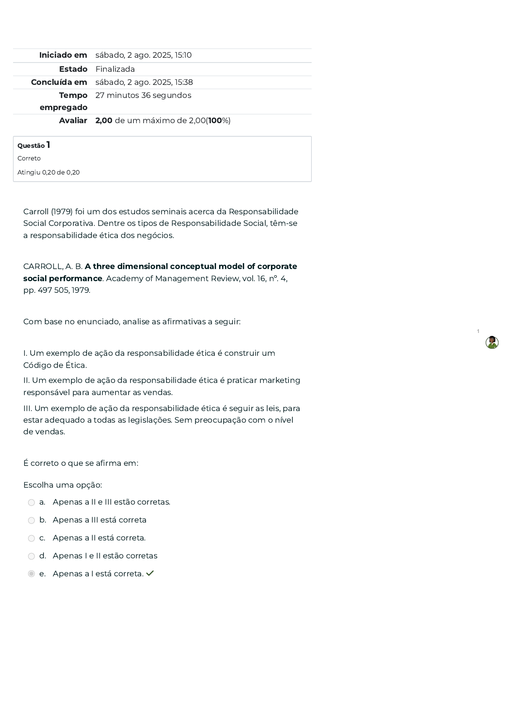 Iniciado em sábado, 2 ago. 2025, 15:10 Estado Finalizada Concluída em sábado, 2 ago. 2025, 15:38 Tempo empregado 27 minutos 36 segundos Avaliar 2,00 de um máximo de 2,00(100%) Questão 1 Correto Atingiu 0,20 de 0,20 Carroll (1979) foi um dos estudos seminais acerca da Responsabilidade Social Corporativa. Dentre os tipos de Responsabilidade Social, têm-se a responsabilidade ética dos negócios. CARROLL, A. B. A three dimensional conceptual model of corporate social performance. Academy of Management Review, vol. 16, nº. 4, pp. 497 505, 1979. Com base no enunciado, analise as afirmativas a seguir: I. Um exemplo de ação da responsabilidade ética é construir um Código de Ética. II. Um exemplo de ação da responsabilidade ética é praticar marketing responsável para aumentar as vendas. III. Um exemplo de ação da responsabilidade ética é seguir as leis, para estar adequado a todas as legislações. Sem preocupação com o nível de vendas. É correto o que se afirma em: Escolha uma opção: a. Apenas a II e III estão corretas. b. Apenas a III está correta c. Apenas a II está correta. d. Apenas I e II estão corretas e. Apenas a I está correta. ✓ 1 Questão 2 Correto Atingiu 0,20 de 0,20 Auditar significa obter evidências de que os fatos contábeis retratam o que se propõe a retratar. Desse modo, a Auditoria aumenta a confiabilidade das informações contábeis. ATTIE, W. Auditoria: conceitos e aplicações. 7. ed. São Paulo: Atlas, 2018. Considerando o enunciado, avalie as asserções I e II a seguir: I. Uma auditoria de um projeto ambiental, precisa realizar uma visita de campo, fazer vistorias, indagações para certificar os impactos negativos. Além disso, é necessário triangular as observações e informações com documentos (outros tipos de evidências). PORQUE II. A Auditoria de um projeto social pode encontrar dificuldades na mensuração dos impactos positivos, visto que quando tratamos de seres humanos, as noções de valor podem se alterar de indivíduo por indivíduo. A respeito das asserções I e II, assinale a alternativa correta: Escolha uma opção: a. As asserções I e II são proposições falsas. b. As asserções I e II são proposições verdadeiras, mas a II não é uma justificativa correta da I. ✓ c. A asserção I é uma proposição verdadeira e a II é uma proposição falsa. d. As asserções I e II são proposições verdadeiras e a II é uma justificativa correta da I. e. A asserção I é uma proposição falsa e a II é uma proposição verdadeira. 1 Questão 3 Correto Atingiu 0,20 de 0,20 Davis (1967), denotou que a Responsabilidade Social Corporativa implica em considerar as consequências éticas relacionadas aos atos organizacionais em toda sociedade, pois, os interesses da organização podem conflitar com objetivos de outros indivíduos. O autor abordou que a Sociedade e as organizações são conectadas (DAVIS, 1967). DAVIS, K. Understanding the social responsibility puzzle: What does the businessman owe to society? Business Horizons, vol. 10, nº. 4, pp. 45 50, 1967. Considerando o exposto assinale a alternativa correta: Escolha uma opção: a. Uma organização que poluiu o rio e efetuou a limpeza do local, pode ser considerada responsável socialmente, visto que assumiu seus erros. ✓ b. Uma organização que demite funcionários antigos para contratar mão de obra barata, pode ser considerada responsável socialmente, visto que busca apenas maximizar as riquezas. c. Uma organização que descarta os resíduos sólidos em torno de uma rodovia de tráfego pequeno é considerada responsável socialmente. d. Uma organização que polui rios e mananciais, e é incapaz de tomar as devidas providências devido negligência da alta administração é considerada responsável socialmente. e. Uma organização que causa desmatamento para aumentar sua lavoura latifundiária de soja sem efetuar o replantio é considerada responsável socialmente. 1 Questão 4 Correto Atingiu 0,20 de 0,20 Elkington (2012), um dos autores renomados da Sustentabilidade. Ganhador de prêmio Nobel. Argumentou que as organizações que atuam no âmbito da Sustentabilidade precisam buscar o “zero” para alcançar o desempenho socioambiental. O autor explique zero significa reduzir constantemente o seu impacto negativo. ELKINGTON, J. (2012). Sustentabilidade, canibais com garfo e faca. São Paulo: M. Books do Brasil Editora Ltda. Assim, com base no enunciado, assinale a alternativa correta: Escolha uma opção: a. Uma organização no âmbito da sustentabilidade visa reduzir gastos com infra-estrutura e aumento na geração do lixo. b. Uma organização no âmbito da sustentabilidade visa reduzir gastos com infra-estrutura e aumento na poluição ambiental. c. Uma organização no âmbito da sustentabilidade visa lixo zero e poluição zero. ✓ d. Uma organização no âmbito da sustentabilidade visa reduzir gastos com pessoal e aumento na poluição ambiental. e. Uma organização no âmbito da sustentabilidade visa aumento no consumo de matéria-prima e aumento na geração do lixo. 1 Questão 5 Correto Atingiu 0,20 de 0,20 As organizações que atuam no âmbito da sustentabilidade, precisam demonstrar aos seus stakeholders como cria valor para eles. O Relato Integrado é uma demonstração voluntária das organizações que demonstra a criação de valor. É elaborado considerando 6 tipos de capitais. Dentre os Capitais, têm-se o __________________, o qual pode ser representado por recursos que são intangíveis organizacionais baseados em conhecimento, entre eles: propriedade intelectual, tais como patentes, direitos autorais, software, direitos e licenças “capital organizacional", tais como conhecimento tácito, sistemas, procedimentos e protocolos. INTERNATIONAL INTEGRATED REPORTING COUNCIL (IIRC) (2014) A Estrutura Internacional para Relato Integrado. Disponível em: http://integratedreporting.org/wp-content/uploads/2015/03/13-12-08- TH