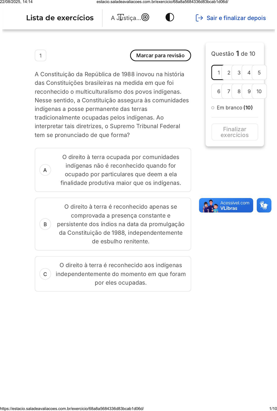 A B C 1 Marcar para revisão A Constituição da República de 1988 inovou na história das Constituições brasileiras na medida em que foi reconhecido o multiculturalismo dos povos indígenas. Nesse sentido, a Constituição assegura às comunidades indígenas a posse permanente das terras tradicionalmente ocupadas pelos indígenas. Ao interpretar tais diretrizes, o Supremo Tribunal Federal tem se pronunciado de que forma? O direito à terra ocupada por comunidades indígenas não é reconhecido quando for ocupado por particulares que deem a ela finalidade produtiva maior que os indígenas. O direito à terra é reconhecido apenas se comprovada a presença constante e persistente dos índios na data da promulgação da Constituição de 1988, independentemente de esbulho renitente. O direito à terra é reconhecido aos indígenas independentemente do momento em que foram por eles ocupadas. Questão 1 de 10 Em branco (10) 1 2 3 4 5 6 7 8 9 10 Finalizar exercícios Lista de exercícios A Justiça… Sair e finalizar depois 22/08/2025, 14:14 estacio.saladeavaliacoes.com.br/exercicio/68a8a5684336d83bcab1d06d/ https://estacio.saladeavaliacoes.com.br/exercicio/68a8a5684336d83bcab1d06d/ 1/10 D E A B C O direito à terra é reconhecido aos indígenas desde que se comprove sua presença constante e persistente após cinco anos contados da promulgação da Constituição de 1988. As terras tradicionalmente ocupadas pelos indígenas têm como marco temporal a promulgação da Constituição, o que não impede que terras em disputa decorrente de esbulho renitente anterior ao marco temporal também sejam reconhecidas. 2 Marcar para revisão Sobre os direitos indígenas, assinale a alternativa incorreta: As terras tradicionalmente ocupadas pelos índios destinam-se a sua posse permanente, cabendo-lhes o usufruto exclusivo das riquezas do solo, dos rios e dos lagos nelas existentes. São reconhecidos aos índios sua organização social, seus costumes, suas línguas, crenças e tradições, e os direitos originários sobre as terras que tradicionalmente ocupam, competindo à União demarcá-las, proteger e fazer respeitar todos os seus bens. São terras tradicionalmente ocupadas pelos índios as por eles habitadas em caráter provisório, as utilizadas para suas atividades produtivas, as imprescindíveis à preservação dos recursos ambientais necessários a seu bem-estar e as necessárias a sua reprodução física e cultural, segundo seus usos, seus costumes e suas tradições. 22/08/2025, 14:14 estacio.saladeavaliacoes.com.br/exercicio/68a8a5684336d83bcab1d06d/ https://estacio.saladeavaliacoes.com.br/exercicio/68a8a5684336d83bcab1d06d/ 2/10 D E A B C Os índios, suas comunidades e organizações são partes legítimas para ingressar em juízo em defesa de seus direitos e interesses, intervindo o Ministério Público em todos os atos do processo. Os indígenas são grupos que merecem tutela constitucional, assim como outros grupos de indivíduos. 3 Marcar para revisão "A maioria da primeira turma do STF (Supremo Tribunal Federal) firmou o entendimento, nesta terça-feira (29), de que praticar aborto nos três primeiros meses de gestação não é crime". http://www1.folha.uol.com.br/cotidiano/2016/11/1836895- aborto-ate-oterceiro-mes-nao-e-crime-decide-turma- do-supremo.shtml Com relação ao aborto, assinale a alternativa que traz uma informação correta. Segundo a lei brasileira, o aborto ainda não é permitido em nenhuma circunstância. O caso julgado não altera diretamente a legislação, que continua considerando crime o aborto, salvo em alguns casos específicos. Em relação a legislações de outros países da América, o Brasil é o único que aceita aborto nos casos de estupro. 22/08/2025, 14:14 estacio.saladeavaliacoes.com.br/exercicio/68a8a5684336d83bcab1d06d/ https://estacio.saladeavaliacoes.com.br/exercicio/68a8a5684336d83bcab1d06d/ 3/10 D E A B C Não há nenhuma relação entre o Código Penal e o aborto, já que é uma questão puramente Constitucional. Como o julgamento do STF tem força de lei, alteram-se automaticamente os artigos do Código Penal. 4 Marcar para revisão Maria, pessoa com identificação psicossexual oposta a seus órgãos genitais externos e com forte desejo de viver e ser aceita como do sexo oposto, move ação de modificação de seu assento de nascimento para mudar prenome, bem como gênero ao qual pertence. Consegue, em primeira instância, apenas a mudança do nome. No atendimento, o defensor deve orientá-la que: Cabe recurso da decisão, uma vez que a procedência parcial viola a Constituição Federal e o entendimento do Supremo Tribunal Federal no que diz respeito à proteção da dignidade humana, à proibição de discriminação e ao direito à identidade. Cabe recurso da decisão, mas, muito provavelmente, esta será mantida, já que a proibição de discriminação de sexo contida na Constituição diz respeito tão somente ao sexo biológico das pessoas. A decisão já foi uma grande vitória, pois a Constituição não menciona discriminação de gênero, mas sim discriminação de sexo, e, portanto, modificar o registro do sexo seria inconstitucional. 22/08/2025, 14:14 estacio.saladeavaliacoes.com.br/exercicio/68a8a5684336d83bcab1d06d/ https://estacio.saladeavaliacoes.com.br/exercicio/68a8a5684336d83bcab1d06d/ 4/10 D E A B C Para a mudança de sexo no assento de nascimento, seria necessária cirurgia de transgenitalização externa e interna, bem como modificação de caracteres sexuais secundários da pessoa. No caso, somente foi feita a mastectomia. Assim, é melhor aguardar esses outros passos e, depois, pedir a modificação do sexo no registro. Não é necessário ou mesmo recomendável recorrer da decisão, pois o que realmente causa constrangimento, expõe ao ridículo e viola a Constituição é o nome em desacordo com sua aparência e psique, o que foi obtido com a decisão judicial. Nessas circunstâncias, recorrer somente prolon
