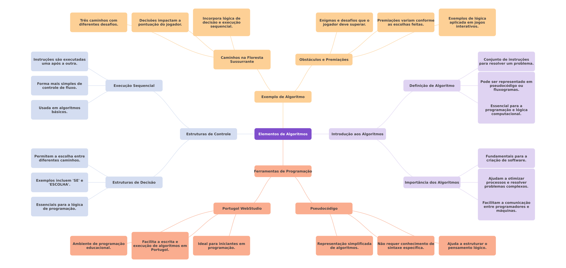 Três caminhos com Decisões impactam a Incorpora lógica de decisão e execução Enigmas e desafios que Premiações variam conforme Exemplos de lógica diferentes desafios. pontuação do jogador. jogador deve superar. as escolhas feitas. aplicada em jogos sequencial. interativos. Caminhos na Floresta Instruções são executadas Sussurrante Obstáculos e Premiações Conjunto de instruções uma após a outra. para resolver um problema. Pode ser representado em Forma mais simples de controle de fluxo. Execução Sequencial Definição de Algoritmo pseudocódigo ou fluxogramas. Exemplo de Algoritmo Usada em algoritmos Essencial para a básicos. programação e lógica computacional. Estruturas de Controle Elementos de Algoritmos Introdução aos Algoritmos Permitem a escolha entre Fundamentais para a diferentes caminhos. criação de software. Ferramentas de Programação Exemplos incluem 'SE' e Ajudam a otimizar Estruturas de Decisão Importância dos Algoritmos processos e resolver problemas complexos. Facilitam a comunicação Essenciais para a lógica de programação. Portugol WebStudio Pseudocódigo entre programadores e máquinas. Facilita a escrita e Ambiente de programação educacional. execução de algoritmos em Ideal para iniciantes em Representação simplificada Não requer conhecimento de Ajuda a estruturar Portugol. programação. de algoritmos. sintaxe específica. pensamento lógico.