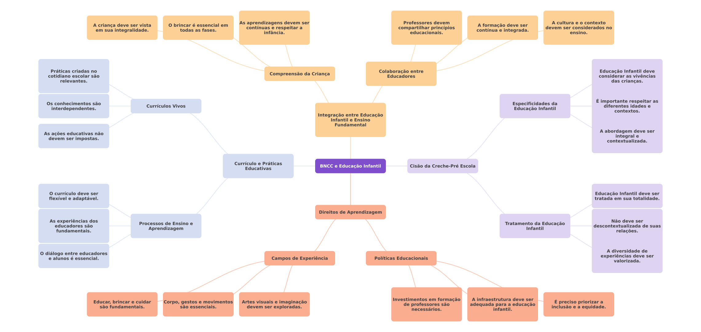 As aprendizagens devem ser Professores devem A cultura e contexto A criança deve ser vista brincar é essencial em A formação deve ser em sua integralidade. todas as fases. contínuas e respeitar a compartilhar princípios devem ser considerados no infância. educacionais. contínua e integrada. ensino. Práticas criadas no Compreensão da Criança Colaboração entre Educação Infantil deve cotidiano escolar são Educadores considerar as vivências relevantes. das crianças. Os conhecimentos são Currículos Vivos Especificidades da É importante respeitar as diferentes idades e interdependentes. Educação Infantil contextos. Integração entre Educação Infantil e Ensino Fundamental A abordagem deve ser As ações educativas não integral e devem ser impostas. contextualizada. Currículo e Práticas Educativas BNCC e Educação Infantil Cisão da Creche-Pré Escola currículo deve ser Educação Infantil deve ser flexível e adaptável. tratada em sua totalidade. Direitos de Aprendizagem As experiências dos Não deve ser Processos de Ensino e educadores são Tratamento da Educação descontextualizada de suas Aprendizagem Infantil fundamentais. relações. A diversidade de diálogo entre educadores e alunos é essencial. Campos de Experiência Políticas Educacionais experiências deve ser valorizada. Educar, brincar e cuidar Corpo, gestos e movimentos Artes visuais e imaginação Investimentos em formação A infraestrutura deve ser são fundamentais. são essenciais. de professores são adequada para a educação É preciso priorizar a devem ser exploradas. necessários. infantil. inclusão e a equidade.
