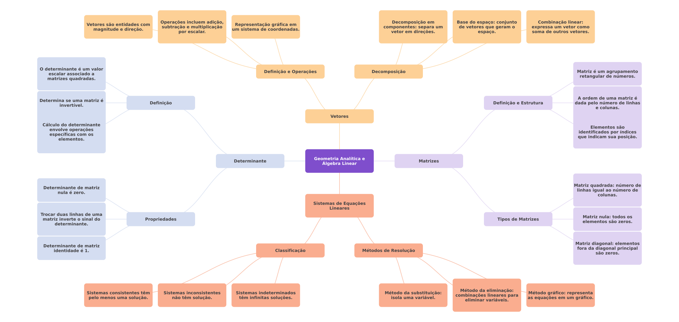 Vetores são entidades com Operações incluem adição, Representação gráfica em Decomposição em Base do espaço: conjunto Combinação linear: magnitude e direção. subtração e multiplicação um sistema de coordenadas. componentes: separa um de vetores que geram expressa um vetor como por escalar. vetor em direções. espaço. soma de outros vetores. determinante é um valor escalar associado a Definição e Operações Decomposição Matriz é um agrupamento matrizes quadradas. retangular de números. A ordem de uma matriz é Determina se uma matriz é invertível. Definição Definição e Estrutura dada pelo número de linhas e colunas. Vetores Cálculo do determinante Elementos são envolve operações específicas com os identificados por índices elementos. que indicam sua posição. Geometria Analítica e Determinante Matrizes Álgebra Linear Determinante de matriz Matriz quadrada: número de nula é zero. linhas igual ao número de colunas. Sistemas de Equações Lineares Trocar duas linhas de uma Matriz nula: todos os matriz inverte sinal do Propriedades Tipos de Matrizes elementos são zeros. determinante. Determinante de matriz Matriz diagonal: elementos identidade é 1. Classificação Métodos de Resolução fora da diagonal principal são zeros. Sistemas consistentes têm Sistemas inconsistentes Sistemas indeterminados Método da substituição: Método da eliminação: pelo menos uma solução. não têm solução. têm infinitas soluções. isola uma variável. combinações lineares para Método gráfico: representa eliminar variáveis. as equações em um gráfico.