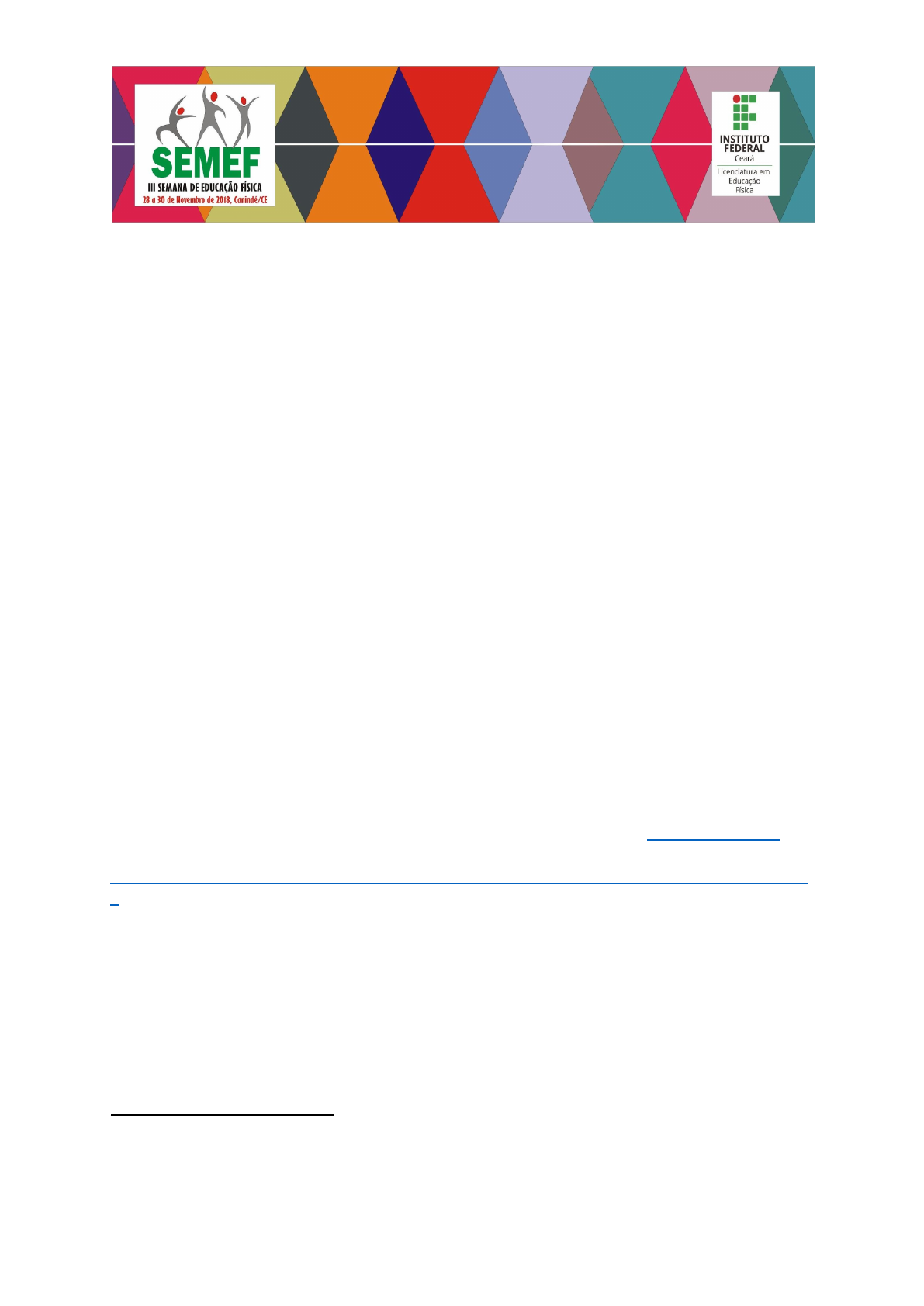 MODELO PARA ELABORAÇÃO DO RESUMO EXPANDIDO Nome Completo do Autor1 Nome Completo do Coautor2 Nome Completo do Coautor3 Nome Completo do Coautor4 RESUMO: Este documento contém as normas para a confecção de resumos expandidos para serem submetidos na III Semana de Educação Física do Instituto Federal de Educação, Ciência e Tecnologia do Ceará (IFCE), campus Canindé. O resumo expandido deverá ser constituído pelas seguintes partes: título, autores, resumo, palavras-chave, introdução, metodologia, resultados e discussão (ou revisão de literatura), conclusões (ou considerações finais), referências e agradecimentos. Essa modalidade de trabalho destina-se a apresentação de pesquisa realizada ou em andamento com resultados preliminares, sendo comunicada unicamente no formato de apresentação oral. O resumo deverá ser escrito em um único parágrafo e possuir no máximo 250 palavras, contendo um texto integralmente autoral, preferencialmente, sem a citação de outras fontes. O uso de siglas deve ser evitado no texto, mas quando imprescindível ao trabalho a mesma deverá ser escrita por extenso na primeira vez que for usada. Quando a sigla for escrita por extenso uma vez no resumo, deverá ser constar uma segunda vez a sua grafia completa no corpo do trabalho. Palavras–chave: Devem ser registradas até cinco palavras-chave, organizadas em ordem de importância no trabalho e separadas por vírgulas. Para fins de padronização, sugere-se definir as palavras-chave segundo os Descritores da Saúde disponível em http://decs.bvs.br/, ou segundo o Thesaurus da Educação disponível em http://pergamum.inep.gov.br/pergamum/biblioteca/pesquisa_thesauro.php?resolution2=1024_ 1. 1 INTRODUÇÃO O resumo expandido deverá conter, no mínimo, 4 páginas, no máximo, 6 páginas, considerando a introdução, desenvolvimento do texto, conclusão e referências. Cada trabalho submetido deverá conter no máximo 4 participações, uma das quais deve ser, obrigatoriamente, o professor da instituição que orientou a produção. A seção Introdução deve apresentar problemática (breve discussão do tema), problema (em formato de pergunta), objetivo(s) específico(s) (no máximo dois) e justificativa. 4Professor do curso de Licenciatura em Educação Física do IFCE. E-mail: fulanodetal@ifce.edu.br. 3Estudante do curso de Licenciatura em Educação Física do IFCE. E-mail: fulanodetal@ifce.edu.br. 2Estudante do curso de Licenciatura em Educação Física do IFCE. E-mail: fulanodetal@ifce.edu.br. 1Estudante do curso de Licenciatura em Educação Física do IFCE. E-mail: fulanodetal@ifce.edu.br. http://decs.bvs.br/ http://pergamum.inep.gov.br/pergamum/biblioteca/pesquisa_thesauro.php?resolution2=1024_1 http://pergamum.inep.gov.br/pergamum/biblioteca/pesquisa_thesauro.php?resolution2=1024_1 2 METODOLOGIA A Metodologia deve conter a explicitação da abordagem utilizada (quantitativa, qualitativa ou mista) e/ou tipo de pesquisa (experimental, descritiva, transversal, longitudinal, etc), método (estudo de caso, pesquisa-ação, estatístico, experimental, etc), população e amostra (ou sujeitos de pesquisa), técnicas de coleta e análise de dados e questões éticas. 3 RESULTADOS E DISCUSSÃO (REVISÃO DE LITERATURA) Essa seção deve apresentar os resultados da pesquisa de campo ou do estudo teórico. No primeiro caso, os dados empíricos coletados devem ser comparados com a literatura científica, indicando sua relevância, vantagens e possíveis limitações. Os estudos teóricos devem apresentar e discutir conceitos, categorias e teorias do trabalho. Os objetos (tabelas, quadros, gráficos, imagem) devem ser indicados no texto, devendo possuir título numerados sequencialmente com algarismos arábicos, conforme exemplificado no quadro 1. Quadro 1: Formatação dos títulos até o terceiro nível Nível Formatação Nível 1 1 NEGRITO E MAIÚSCULO Nível 2 1.1 MAIÚSCULO E SEM NEGRITO Nível 3 1.1.1 Apenas a primeira letra maiúscula e com negrito O gráfico 1 constitui um outro exemplo da inserção de objetos no trabalho. Gráfico 1: Conteúdos mais estudados nas aulas de Educação Física ao longo do ano letivo. Deve-se evitar a apresentação dos mesmos dados em objetos diferentes. 4 CONCLUSÕES (OU CONSIDERAÇÕES FINAIS) Apresentar as principais conclusões em frases curtas, separadas por parágrafos. Não usar esta seção para sumarizar os resultados (o que já foi feito no Resumo), mas destacar o progresso e as aplicações que o trabalho propicia. Enfatizar as limitações que persistem, apresentando, sempre que apropriado, sugestões para trabalhos futuros. REFERÊNCIAS Apresentar as Referências em ordem alfabética, seguindo as normas 6023:2002 da Associação Brasileira de Normas Técnicas (ABNT). O material coletado na Internet deve ser baseado nos modelos anteriores e constar no final: Disponível em: . Acesso em: dd mmm. aaaa. Veja abaixo os exemplos para referenciar: norma da ABNT, Legislação, artigo publicado em anais de evento, trabalho de conclusão de curso (monografias, teses e dissertações), parte de um livro com vários autores, livro e documento da Internet. Atenção, esse texto introdutório não deve constar em seu trabalho, o qual deve apresentar diretamente as referências. ASSOCIAÇÃO BRASILEIRA DE NORMAS TÉCNICAS. NBR 6023: Informação e documentação: Referências: Elaboração. Rio de Janeiro, 2002. BRASIL. Lei 8.078, de 11 de setembro de 1990. Dispõe sobre a proteção do consumidor e dá outras providências. Diário Oficial da União, Brasília, v. 138, n. 87, p. 8065, 12 set. 1990. PINTO, C. A. S. Ensaios sobre tecnologia. Conex. Ci. e Tecnol. Fortaleza/CE, v. 5, n. 3, p. 48-60, nov. 2011. PINTO, C. A. S. Esporte educacional: uma possibilidade... In: Encontro de Pesquisa e Pós-graduação, 3., 2011, Maracanaú. Anais eletrônicos... Maracanaú/CE: IFCE, 2011. PINTO, C. A. S. O conceito de esporte: da pré-história aos dias atuais. 