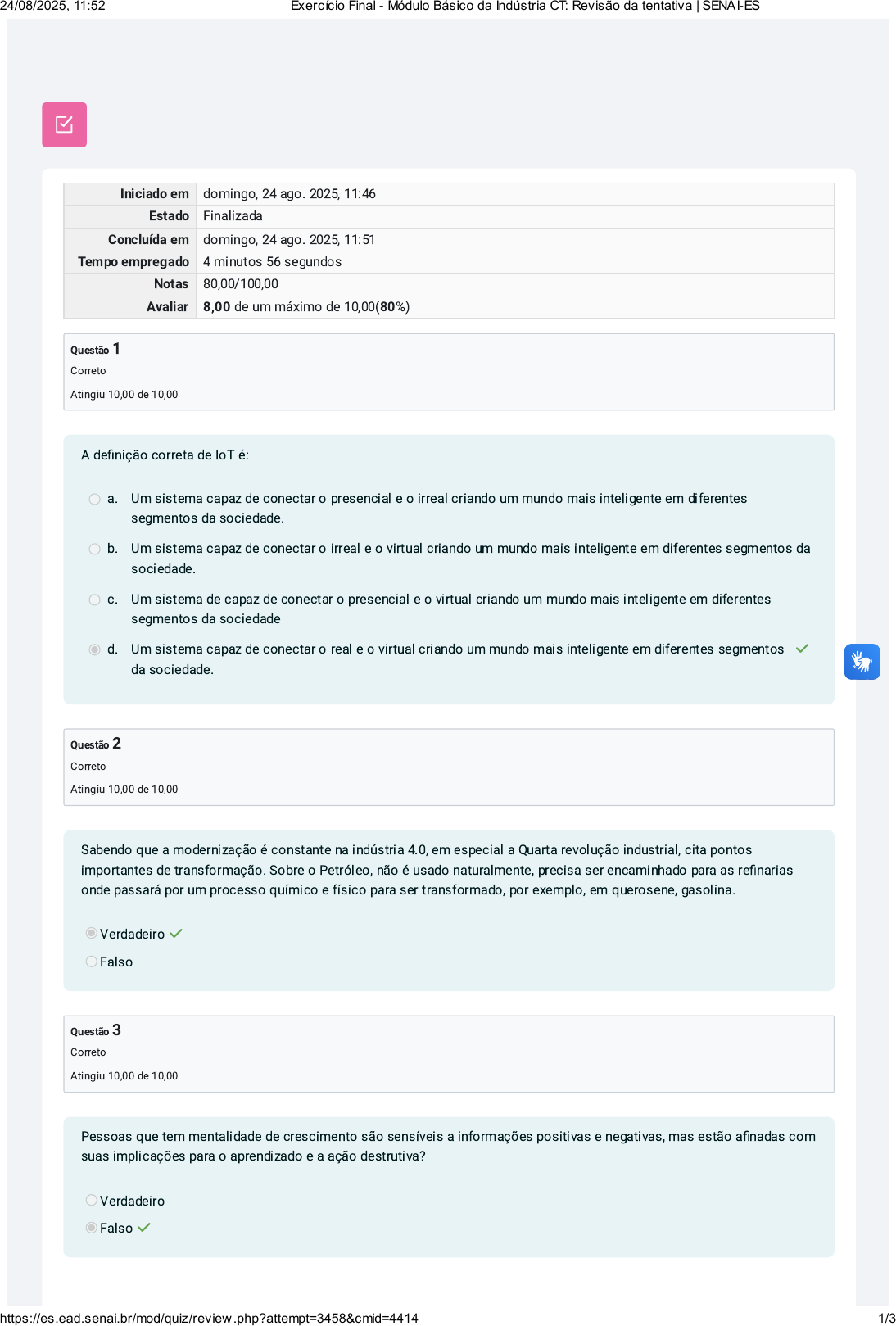Iniciado em domingo, 24 ago. 2025, 11:46 Estado Finalizada Concluída em domingo, 24 ago. 2025, 11:51 Tempo empregado 4 minutos 56 segundos Notas 80,00/100,00 Avaliar 8,00 de um máximo de 10,00(80%) Questão 1 Correto Atingiu 10,00 de 10,00 Questão 2 Correto Atingiu 10,00 de 10,00 Questão 3 Correto Atingiu 10,00 de 10,00 A definição correta de IoT é: a. Um sistema capaz de conectar o presencial e o irreal criando um mundo mais inteligente em diferentes segmentos da sociedade. b. Um sistema capaz de conectar o irreal e o virtual criando um mundo mais inteligente em diferentes segmentos da sociedade. c. Um sistema de capaz de conectar o presencial e o virtual criando um mundo mais inteligente em diferentes segmentos da sociedade d. Um sistema capaz de conectar o real e o virtual criando um mundo mais inteligente em diferentes segmentos da sociedade. ✓ Sabendo que a modernização é constante na indústria 4.0, em especial a Quarta revolução industrial, cita pontos importantes de transformação. Sobre o Petróleo, não é usado naturalmente, precisa ser encaminhado para as refinarias onde passará por um processo químico e físico para ser transformado, por exemplo, em querosene, gasolina. Verdadeiro ✓ Falso Pessoas que tem mentalidade de crescimento são sensíveis a informações positivas e negativas, mas estão afinadas com suas implicações para o aprendizado e a ação destrutiva? Verdadeiro Falso ✓ 24/08/2025, 11:52 Exercício Final - Módulo Básico da Indústria CT: Revisão da tentativa | SENAI-ES https://es.ead.senai.br/mod/quiz/review.php?attempt=3458&cmid=4414 1/3 Questão 4 Correto Atingiu 10,00 de 10,00 Questão 5 Correto Atingiu 10,00 de 10,00 Questão 6 Correto Atingiu 10,00 de 10,00 Questão 7 Correto Atingiu 10,00 de 10,00 As tecnologias de adição e material possibilitam a fabricação de peças mais complexas e com MAIOR desperdício de matéria-prima. Pode-se dizer que ainda é uma tecnologia cara, porém promissora. Verdadeiro Falso ✓ A digitalização da informação permite que os dados sejam utilizados somente de forma limitada? Verdadeiro Falso ✓ Nas Organizações, a ________ precisa ser encarada como forma de ________ o funcionário, que deve se sentir parte integrante da empresa e não simplesmente um seguidor de regras. É preciso motivar as pessoas, pois quando motivadas elas trabalham mais _______ e satisfeitas e desta forma garantindo um aumento em sua ________ levando-a a obter um grande sucesso. Avalie as palavras e as organize corretamente no texto acima: a. Produtividade, valorizar, motivação, alegres b. Motivação, valorizar, alegres, produtividade ✓ c. Alegres, produtividade, motivação, valorizar d. Nenhuma das alternativas acima está correta e. Motivação, valorizar, produtividade, alegres O método DEDUTIVO, aborda, a partir de uma situação geral ou genérica, para uma situação particular, seguindo o raciocínio descendente e partindo de uma análise geral até um particular para chegar a uma conclusão. Verdadeiro ✓ Falso 24/08/2025, 11:52 Exercício Final - Módulo Básico da Indústria CT: Revisão da tentativa | SENAI-ES https://es.ead.senai.br/mod/quiz/review.php?attempt=3458&cmid=4414 2/3 Questão 8 Correto Atingiu 10,00 de 10,00 Questão 9 Incorreto Atingiu 0,00 de 10,00 Questão 10 Incorreto Atingiu 0,00 de 10,00 Sabendo que o pensamento sistêmico lança seu olhar não somente para o indivíduo isoladamente, considera também seu contexto e as relações aí estabelecidas, podemos dizer que ele faz sentido por meio de três conceitos. Assinale os conceitos que estão relacionados: a. Limites, controle emocional e inter-relação b. Inter-relação, perspectivas e limites ✓ c. Perspectivas, Limites e afinidades d. Perspectivas, limites e autoconhecimento e. Inter-relação, perspectivas e inovação É possível afirmar que a terceira Revolução Industrial foi marcada pela flexibilização da produção e pela reestruturação do trabalho? Verdadeiro × Falso A segunda revolução industrial trouxe 3 fatores marcantes. Podemos dizer que estão relacionados a: a. Eletricidade, petróleo. × b. Diminuição dos custos de produção, aumento da qualidade do produto, aumento na forma de comunicação. c. Reestruturação do trabalho, flexibilização da produção. d. Deslocamento do emprego, aumento da produtividade, aumento da circulação. 24/08/2025, 11:52 Exercício Final - Módulo Básico da Indústria CT: Revisão da tentativa | SENAI-ES https://es.ead.senai.br/mod/quiz/review.php?attempt=3458&cmid=4414 3/3