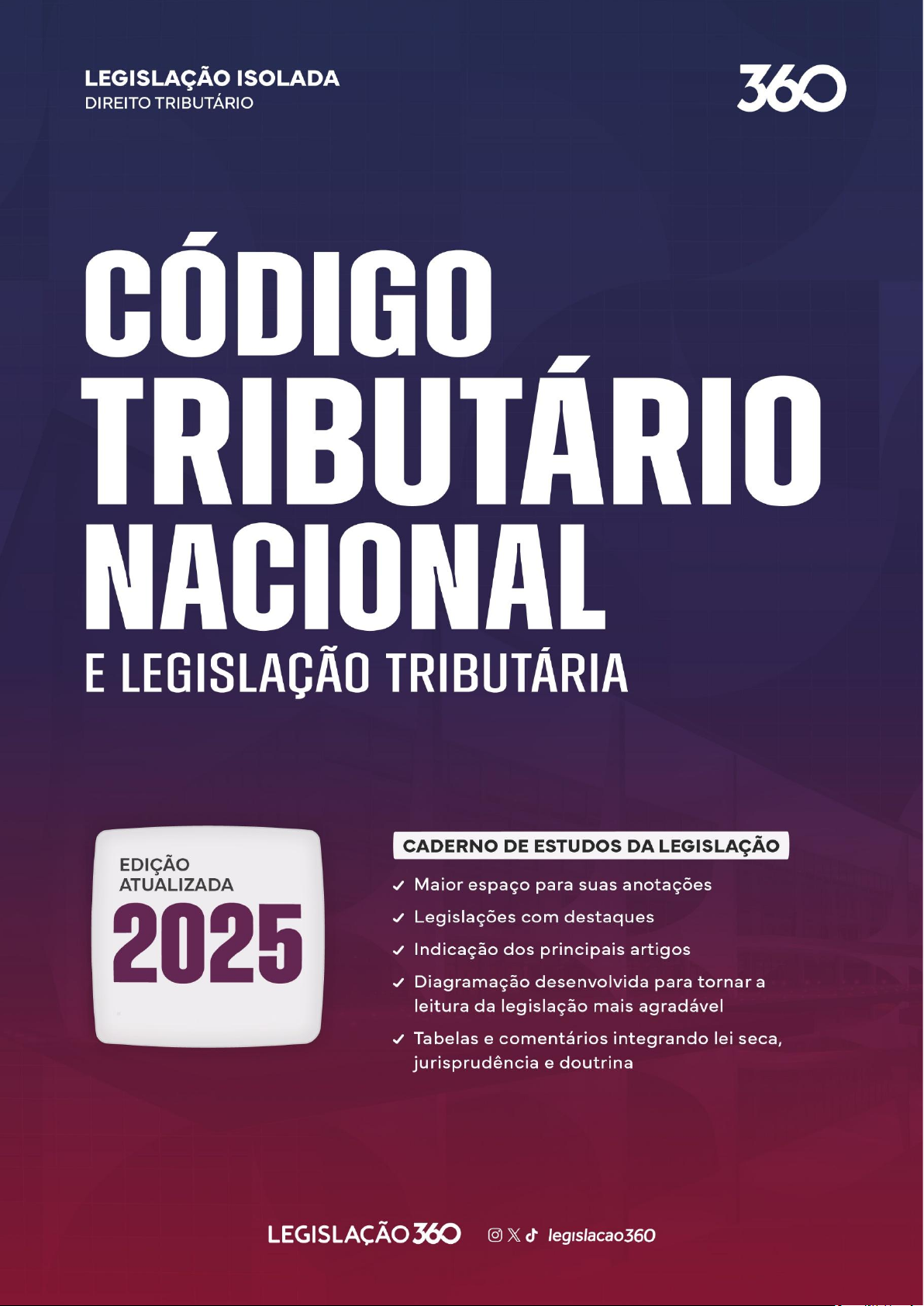 1 2025.1 2 2025.1, 16.01.2025 3 INDICAÇÃO DOS PRINCIPAIS ARTIGOS TABELAS E JURISPRUDÊNCIA REDAÇÃO SIMPLIFICADA LEGISLAÇÃO COM DESTAQUES NAVEGAÇÃO POR MARCADORES Avance no estudo das legislações e organize todas as suas anotações em um só lugar. Criamos este formato de CADERNO DE ESTUDOS em 2018, combinando a letra da lei, jurisprudência, tabelas e o espaço dedicado para anotações que se tornou marca da Legislação 360. Além de todas as demais marcações, destacamos com uma estrela os artigos com maior incidência em provas e que merecem atenção especial. Para aprofundar seus estudos, incluímos a jurisprudência relacionada aos dispositivos e tabelas esquematizando a doutrina. Desenvolvemos uma diagramação especial para as legislações, facilitando muito a sua leitura. Além disso, também simplificamos a redação dos dispositivos, especialmente nos números. NEGRITO › ROXO › LARANJA › CINZA SUBLINHADO › Utilizado para realçar termos importantes. Aplicado para destacar números, incluindo datas, prazos, percentuais e outros valores numéricos. Expressões que denotam negação, ressalva ou exceção. Indica vetos e revogações. Dispositivos cuja eficácia está prejudicada, mas não estão revogados expressamente. Uma ferramenta adicional para leitores digitais. Nossos materiais foram desenvolvidos para garantir uma leitura confortável quando impressos, mas se você prefere ler em dispositivos eletrônicos, conheça esta funcionalidade. Implementamos em todos os nossos conteúdos o recurso de navegação por marcadores, um componente interativo do leitor de PDF (cujo nome pode variar de acordo com o programa utilizado). Nesta ferramenta, títulos, capítulos, seções e artigos das legislações, assim como súmulas e outros textos relevantes de jurisprudência, são organizados na barra de marcadores do leitor de PDF. Isso permite que você localize cada item de forma mais rápida. Além disso, a funcionalidade VOLTAR, presente em alguns leitores de PDF, facilita o retorno ao ponto de leitura onde você parou, sem a necessidade de ficar rolando páginas. ESPAÇO PARA ANOTAÇÕES CINZA TACHADO › 4 GUIA DE ESTUDOS Se você está começando a se preparar para concursos ou busca uma melhor organização e planejamento, este guia será de grande ajuda em sua jornada. Disponibilizamos o conteúdo gratuitamente em nosso site: www.legislacao360.com.br CONTROLE DE LEITURA DAS LEGISLAÇÕES Incluído no Guia de Estudos, o PLANNER METAS DA LEGISLAÇÃO é uma planilha desenvolvida para ajudar você a organizar suas leituras e revisões. Este material é gratuito e está disponível para download em nosso site. No guia você encontrará também sugestões de como utilizar a planilha. Veja algumas das características principais: BIBLIOGRAFIA PARA CONCURSOS PÚBLICOS E OAB ORIENTAÇÕES PARA ESTUDAR JURISPRUDÊNCIA COMO OTIMIZAR A RESOLUÇÃO DE QUESTÕES MODELO DE CICLO DE ESTUDOS PLANNER PARA A LEITURA DE INFORMATIVOS (STF E STJ) PLANNER PARA O ESTUDO DAS LEGISLAÇÕES Desenvolvimento editorial e todos os direitos reservados a 360 EDITORA JURÍDICA LTDA. Material protegido por direitos autorais. É proibida a reprodução ou distribuição deste material, ainda que sem fins lucrativos, sem a expressa autorização da 360 Editora Jurídica Ltda. Lei 9.610/98 – Lei de Direitos Autorais. www.legislacao360.com.br – editora@360.ltda – CNPJ 51.278.476/0001-20 5 SUMÁRIO ÍNDICE DAS TABELAS ...................................................................................................................................................................................... 6 Lei 5.172/66 - Código Tributário Nacional ............................................................................................................................................ 8 LC 87/96 - Lei Kandir (ICMS) ..................................................................................................................................................................... 82 LC 24/75 - Convênios do ICMS ................................................................................................................................................................. 97 LC 160/17 - Remissão de Créditos Tributários .............................................................................................................................. 101 LC 116/03 - ISSQN ....................................................................................................................................................................................... 105 Lei 6.830/80 - Lei de Execução Fiscal (LEF) ...................................................................................................................................... 120 Lei 8.397/92 - Lei de Medida Cautelar Fiscal ................................................................................................................................... 133 Lei 8.137/90 - Lei de Crimes Tributários ........................................................................................................................................... 137 6 ÍNDICE DAS TABELAS Lei 5.172/66 - Código Tributário Nacional ........................................................................................ 8 Competências tributárias............................................................................................................................. 9 Conceito de tributo ....................................................................................................................................... 10 Espécies tributárias ...................................................................................................................................... 11 Classificação dos Tributos *....................................................................................................................... 12 Sujeitos da relação tributár