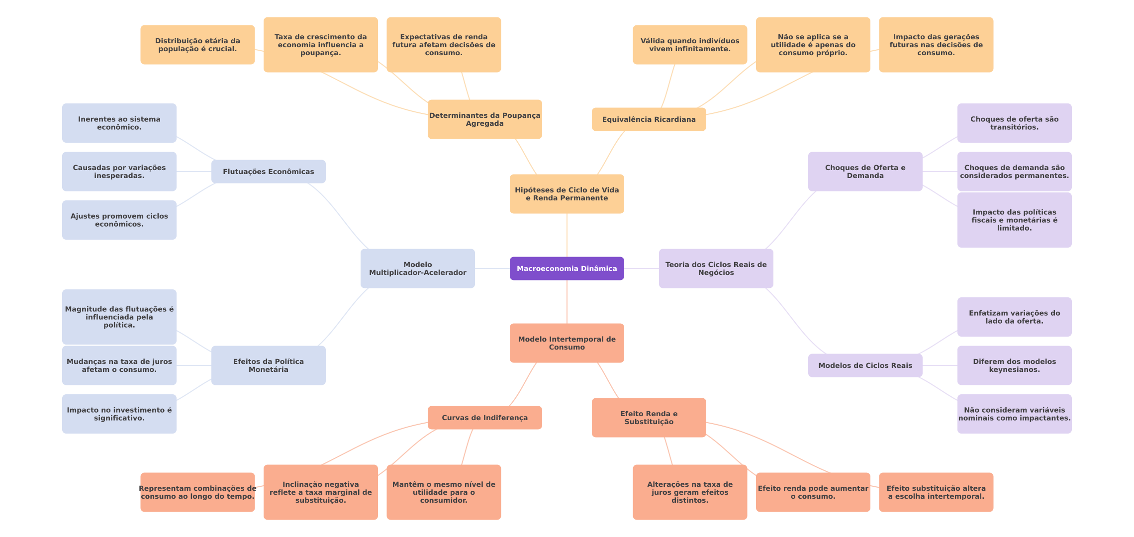 Taxa de crescimento da Distribuição etária da Expectativas de renda economia influencia a futura afetam decisões de Válida quando indivíduos Não se aplica se a Impacto das gerações população é crucial. vivem infinitamente. utilidade é apenas do futuras nas decisões de poupança. consumo. consumo próprio. consumo. Inerentes ao sistema Determinantes da Poupança Equivalência Ricardiana Choques de oferta são econômico. Agregada transitórios. Causadas por variações Flutuações Econômicas Choques de Oferta e Choques de demanda são inesperadas. Demanda considerados permanentes. Hipóteses de Ciclo de Vida e Renda Permanente Ajustes promovem ciclos Impacto das políticas fiscais e monetárias é econômicos. limitado. Modelo Teoria dos Ciclos Reais de Macroeconomia Dinâmica Multiplicador-Acelerador Negócios Magnitude das flutuações é Enfatizam variações do influenciada pela lado da oferta. política. Modelo Intertemporal de Consumo Mudanças na taxa de juros Efeitos da Política Diferem dos modelos Modelos de Ciclos Reais afetam consumo. Monetária keynesianos. Impacto no investimento é Não consideram variáveis Efeito Renda e significativo. Curvas de Indiferença Substituição nominais como impactantes. Representam combinações de Inclinação negativa Mantêm mesmo nível de Alterações na taxa de reflete a taxa marginal de utilidade para juros geram efeitos Efeito renda pode aumentar Efeito substituição altera consumo ao longo do tempo. substituição. distintos. consumo. consumidor. a escolha intertemporal.