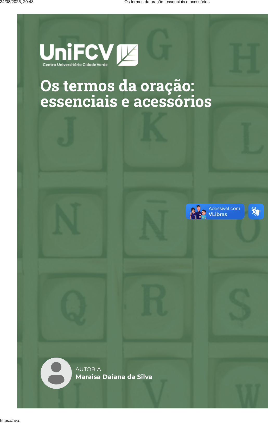 Os termos da oração: essenciais e acessórios AUTORIA Maraisa Daiana da Silva 24/08/2025, 20:48 Os termos da oração: essenciais e acessórios https://ava.graduacaoead.unicv.edu.br/pluginfile.php/2573774/mod_resource/content/2/unidade-3/os-termos-da-oracao-essenciais-e-acessorios.h… 1/7 Assim como na morfologia, em que temos unidades morfológicas, na sintaxe também temos unidades sintáticas, as quais chamamos de termos da oração, que podem ser formadas por uma ou por um conjunto de palavras que desempenham determinada função sintática. Podemos classificar os termos da oração de duas formas, a primeira, apresentada por Cegalla (2004), considera os termos da oração o sujeito e o predicado. Uma segunda alternativa, a mais utilizada pelos gramáticos, divide os termos da oração em: Termos essenciais Sujeito; Predicado; Termos integrantes Complementos verbais: objeto direto e indireto; Complemento nominal; Agente da passiva. Termos acessórios Adjunto adnominal; Adjunto adverbial; Aposto; Vocativo. Nesta unidade, vamos nos deter nos termos essenciais. Vamos lá? O primeiro termo essencial é o sujeito, que é o termo da oração que expressa o ser de quem se fala ou de que se declara alguma coisa. Para encontrá-lo podemos fazer duas perguntinhas básicas para a oração: - Quem é que (verbo)? - O que é que (verbo)? Utilizamos essas duas perguntinhas porque devemos considerar que o sujeito pode se referir à pessoa (quem) ou a qualquer outra coisa (que). Por exemplo: 24/08/2025, 20:48 Os termos da oração: essenciais e acessórios https://ava.graduacaoead.unicv.edu.br/pluginfile.php/2573774/mod_resource/content/2/unidade-3/os-termos-da-oracao-essenciais-e-acessorios.h… 2/7 Nessa direção, como dito anteriormente, na estrutura das orações, as palavras e expressões formam unidades sintáticas (pequenos conjuntos), os quais denominamos termos. Ainda que esses termos possam ser formados por uma única palavra, o mais comum é que tenha um agrupamento de elementos em volta do núcleo, o qual é a palavra principal. Assim, tomando o exemplo anterior, temos: O preço do feijão não cabe no poema. Sujeito Núcleo do sujeito Podemos observar que em volta do núcleo temos palavras secundárias que o caracterizam, como o “o”, “do” e “feijão”. Sobre o núcleo do sujeito é preciso evidenciar que ele pode se manifestar de duas formas: 1ª – Quando o sujeito está em primeira ou segunda pessoa do discurso, comumente os núcleos se apresentam como pronomes substantivos. Assim, usa-se os pronomes pessoais eu e tu, no singular e nós e vós, no plural, lembrando que as combinações equivalentes de nós e vós também valem, como, por exemplo: eu e tu = nós. 2ª – Se estiver na terceira pessoa do discurso, pode ter como núcleo: a. Um substantivo; b. Os pronomes pessoais ele(s), ela(s); c. Um pronome demonstrativo, relativo, interrogativo ou indefinido; 24/08/2025, 20:48 Os termos da oração: essenciais e acessórios https://ava.graduacaoead.unicv.edu.br/pluginfile.php/2573774/mod_resource/content/2/unidade-3/os-termos-da-oracao-essenciais-e-acessorios.h… 3/7 d. Um numeral; e. Uma palavra ou uma expressão substantivada; f. Uma oração. Diante disso podemos classificar os sujeitos em: Sujeito simples: quando tem apenas um núcleo. Exemplo: Ninguém compra os elementos elegíveis. Sujeito composto: quando a dois ou mais núcleos. Exemplo: Ele e você são os responsáveis. Sujeito oculto: é aquele que não está grafado, marcado, mas é possível encontrá-lo a partir da conjugação do verbo. Exemplo: Conheço aquelas pessoas. Sujeito indeterminado: quando não conseguimos determinar qual é o sujeito, isso porque o verbo se apresenta conjugado na terceira pessoa do plural (eles), ou ainda na terceira pessoa do singular quando acompanhado do pronome se. Exemplo: marcaram os lugares. Não se falou sobre o projeto. Oração sem sujeito: orações que contêm apenas o predicado, as quais não podemos confundir com as orações com sujeitos indeterminados, as quais têm um sujeito, ainda que indeterminado. Na maioria das vezes a oração sem sujeito ocorre quando estamos falando de fenômenos da natureza ou usando verbos impessoais. Exemplo: Ontem choveu aqui. Faz calor em pleno junho. O segundo termo essencial da oração é o predicado, que é constituído por um conjunto de enunciados que engendram o que se diz a respeito do sujeito. Segundo Lima (2011), responsável pelas informações mais importantes sobre o sujeito, além de centrar a significação da oração, já que é ele que traz o verbo ou a locução verbal. Nesse sentido, de acordo com as teorias gramaticais, o verbo tem duas funções dentro da sintaxe e assim podem ser classificados em verbos significativos e verbos de ligação. Isso é importante porque vai determinar a intenção e o sentido das orações. O verbo de ligação tem a função de expressar estados, sentimentos, além de ligar o sujeito a uma característica. Exemplo: 24/08/2025, 20:48 Os termos da oração: essenciais e acessórios https://ava.graduacaoead.unicv.edu.br/pluginfile.php/2573774/mod_resource/content/2/unidade-3/os-termos-da-oracao-essenciais-e-acessorios.h… 4/7 Marcos é magro. Sujeito CaracterísticaVerbo de ligação O verbo “é” está, no exemplo acima, apenas ligando o sujeito à sua característica, por isso assume a função de verbo de ligação. Há verbos que têm essa característica, ou seja, normalmente funcionam como verbo de ligação, são eles: continuar, andar, ficar, fazer, estar, ser, parecer e permanecer. Dois desses verbos citados, os quais funcionam normalmente como de ligação, exigem cuidado, visto que podem ter o sentido de ação, são eles: andar e ficar. Observe: Eu ando no parque. Ando cansada. Verbo de ação Verbo de ligação Na primeira frase nós temos o verbo andar, conjugado na primeira pessoa expressando a ação de andar, uma ação que o sujeito pratica. Já, na segund