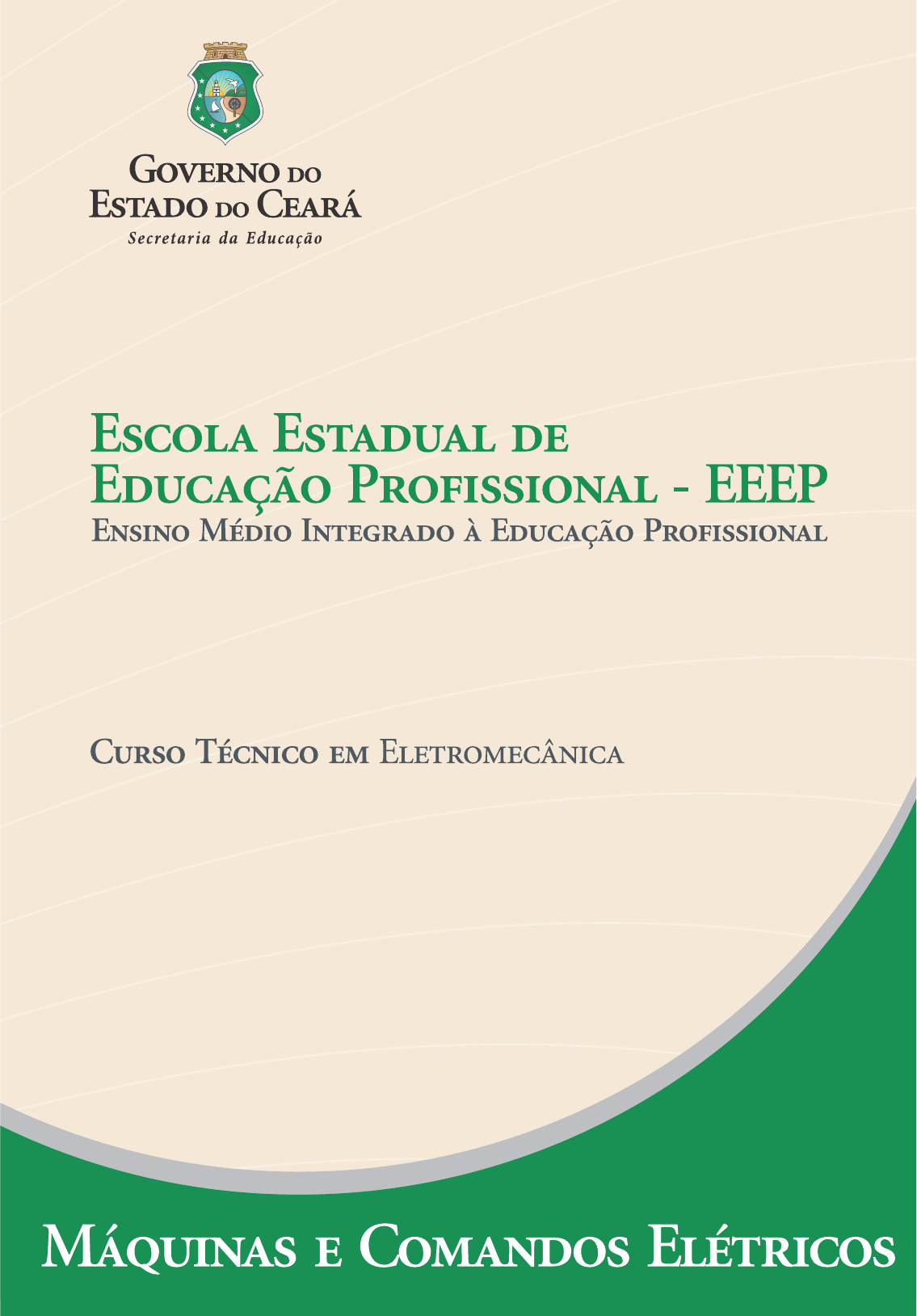 Governador Vice Governador Secretária da Educação Secretário Adjunto Secretário Executivo Assessora Institucional do Gabinete da Seduc Coordenadora da Educação Profissional – SEDUC Cid Ferreira Gomes Domingos Gomes de Aguiar Filho Maria Izolda Cela de Arruda Coelho Maurício Holanda Maia Antônio Idilvan de Lima Alencar Cristiane Carvalho Holanda Andréa Araújo Rocha Escola Estadual de Educação Profissional [EEEP] Ensino Médio Integrado à Educação Profissional Eletromecânica – Máquinas e Comandos Elétricos. 1 Material parcialmente baseado em apostila gentilmente cedida pela Associação Brasileira de Manutenção – Ceará – ABRAMAN-CE Escola Estadual de Educação Profissional [EEEP] Ensino Médio Integrado à Educação Profissional Eletromecânica – Máquinas e Comandos Elétricos. 2 Índice Capitulo 1 – Máquinas Elétricas Rotativas 3 Capitulo 2 – Motores de Corrente Alternadas 6 Capitulo 3 – Defeitos Internos nos Motores de C.A. Assíncrono 15 Capitulo 4 – Alternadores 19 Capitulo 5 – Gerador de Corrente Contínua 24 Capitulo 6 – Motor de Corrente Contínua 28 Capitulo 7 – Instalações de Motores de Corrente Contínua 35 Capitulo 8 – Defeito nas Ligações dos Motores de Corrente Contínua 38 Capitulo 9 – Transformadores em Geral 42 Capitulo 10 – Acessórios do Transformador 55 Capitulo 11 – Comandos Elétricos 66 Capitulo 12 – Identificação de Dispositivos Utilizados em Chaves Magnéticas 67 Capitulo 13 – Interpretação de Circuitos de Chaves Magnéticas 95 Capitulo 14 – Manual de Práticas 125 Bibliografia 134 Escola Estadual de Educação Profissional [EEEP] Ensino Médio Integrado à Educação Profissional Eletromecânica – Máquinas e Comandos Elétricos. 3 Capitulo 1 Máquinas Elétricas e Rotativas Noções Gerais Sobre Motores Elétricos Os motores elétricos são máquinas que transformam energia elétrica em energia mecânica; assim, ao ligarmos um motor à rede, ele irá absorver uma dada quantidade de energia elétrica, e em troca aciona uma carga, por exemplo, um bonde. Este processo de conversão da forma de energia é análogo ao que se verifica num motor a gasolina. Neste motor, também dito motor a explosão, aproveita-se a energia proveniente da queima de combustível para movimentar o veículo. Num motor elétrico o combustível é a energia elétrica. Os motores elétricos em geral se compõem de duas partes: o rotor que é a parte móvel e o estator ou carcaça que é a parte fixa. Estator ou Carcaça Rotor Podemos classificar os motores, quanto à energia elétrica absorvida, da seguinte maneira: monofasico De CA trifasico Motores elétricos De CC Os motores elétricos de corrente alternada funcionam quando ligados à uma rede de tensão alternada; são monofásicos ou trifásicos se necessitam de tensão monofásica ou de tensão trifásica. Os motores elétricos de corrente contínua funcionam quando ligados à uma rede de tensão contínua. Os motores de CA são hoje os mais utilizados; podemos encontrá-los em refrigeradores domésticos. em máquinas ferramentas etc. Os motores de CC são de emprego mais restrito, sendo encontrados na tração elétrica, grandes laminadores etc. Vamos estudar com maior profundidade os motores de CA. Eles podem se classificar, segundo o sistema elétrico de alimentação e o princípio de funcionamento ou arranque, em: Escola Estadual de Educação Profissional [EEEP] Ensino Médio Integrado à Educação Profissional Eletromecânica – Máquinas e Comandos Elétricos. 4 de indução ou assíncrono de rotor em curto ou gaiola de esquilo Motores trifásicos de rotor bobinado síncrono de arranque capacitativo de indução ou assíncrono e marcha indutiva (fase dividida) Motores monofásicos de arranque por reputação de polo dividido série Existem outros tipos de motores de CA, que se encontram mais raramente. Os motores de indução (tanto trifásicos como monofásicos) possuem no estator um jogo de bobinas que produzem um campo magnético. No interior do motor, apoiando-se sobre mancais, encontra-se a parte móvel, ou rotor. Este rotor dispõe de um enrolamento constituído por simples condutores ou barras postas em curto-circuito entre si (rotor em curto ou em gaiola de esquilo) ou podem também possuir um outro tipo de enrolamento, cujos extremos são levados a anéis coletores eletricamente isolados do eixo e entre si e sobre os quais se apoiam escovas de carvão, fixas ao estator, que nos permitem ligar o motor a um circuito externo. Rotor Gaiola Rotor Bobinado O motor de indução possui velocidade praticamente constante. Os motores de indução de pequena potência são, na maioria das vezes, monofásicos, com rotor em curto; para a partida necessitam de dispositivos especiais, uma vez que não tem arranque próprio. Já os motores trifásicos de indução são de maior potência e tem arranque próprio. Como exigem grande corrente da rede, no instante de partida, usam-se dispositivos especiais para diminuí-la. No motor monofásico série ou universal o enrolamento do rotor é levado às escovas, por intermédio de um comutador (coletor constituído por lâminas isoladas entre si), e ligado ao estator. Escola Estadual de Educação Profissional [EEEP] Ensino Médio Integrado à Educação Profissional Eletromecânica – Máquinas e Comandos Elétricos. 5 Este tipo de motor funciona tanto com CC como com CA. Possui velocidade variável. No motor à repulsão o enrolamento do rotor é levado às escovas que estão ligadas em curto circuito. Possui velocidade variável, sendo usualmente empregado como motor repulsão indução. Na partida funciona como motor de repulsão (que tem arranque próprio) e, posteriormente, por um dispositivo centrífugo, as lâminas do coletor são colocadas em curtocircuito, passando a funcionar como motor de indução monofásico. Os motores de corrente contínua podem ser classificados segundo o modo de excitação em: auto 