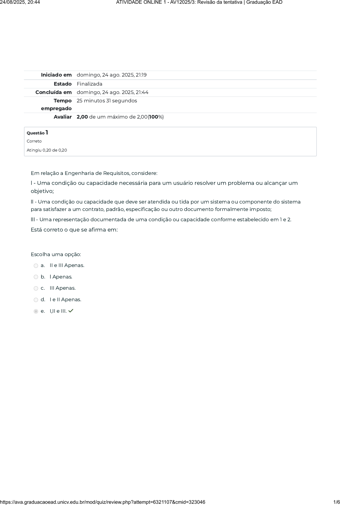 Iniciado em domingo, 24 ago. 2025, 21:19 Estado Finalizada Concluída em domingo, 24 ago. 2025, 21:44 Tempo empregado 25 minutos 31 segundos Avaliar 2,00 de um máximo de 2,00(100%) Questão 1 Correto Atingiu 0,20 de 0,20 Em relação a Engenharia de Requisitos, considere: l - Uma condição ou capacidade necessária para um usuário resolver um problema ou alcançar um objetivo; ll - Uma condição ou capacidade que deve ser atendida ou tida por um sistema ou componente do sistema para satisfazer a um contrato, padrão, especificação ou outro documento formalmente imposto; lll - Uma representação documentada de uma condição ou capacidade conforme estabelecido em 1 e 2. Está correto o que se afirma em: Escolha uma opção: a. II e III Apenas. b. l Apenas. c. III Apenas. d. I e II Apenas. e. I,II e III. ✓ 24/08/2025, 20:44 ATIVIDADE ONLINE 1 - AV12025/3: Revisão da tentativa | Graduação EAD https://ava.graduacaoead.unicv.edu.br/mod/quiz/review.php?attempt=6321107&cmid=323046 1/6 Questão 2 Correto Atingiu 0,20 de 0,20 Questão 3 Correto Atingiu 0,20 de 0,20 A Realidade Aumentada é uma tecnologia advinda da Realidade Virtual, nas quais fazem parte do processo da Indústria 4.0. Seu funcionamento envolve a sobreposição de objetos virtuais no mundo real, proporcionando o enriquecimento do ambiente real com objetos virtuais em tempo real. Diante dessa afirmação, assinale a alternativa correta. Escolha uma opção: a. Neste contexto, pode-se afirmar que IoT, Big Data, Computação em Nuvem e Realidade Aumentada, não contém uma solução ideal para desempenho de armazenamento e interação, bem como o gerenciamento de informações. b. A RV (Realidade aumentada), não é capaz de suportar nem processar e analisar grandes fluxos de informações em tempo real. c. Esta interação precisa ser feita de maneira direta (com a mão ou com o corpo do usuário) ou indireta (auxiliada por algum dispositivo de interação). Enquanto a RV tem como objetivo a imersão do usuário em um ambiente virtual. d. O objetivo é que o usuário não tenha tanta interação com o mundo e os elementos virtuais, de maneira mais natural e intuitiva sem necessidade de treinamento ou adaptação. e. Neste contexto, pode-se afirmar que IoT, Big Data, Computação em Nuvem e Realidade Aumentada, constituem uma solução ideal para desempenho de armazenamento e interação, bem como o gerenciamento de informações, o que torna tais ferramentas essenciais para o desenvolvimento tecnológico. ✓ Os problemas associados aos requisitos podem ser advindos de distintos fatores, entre eles, podem-se destacar. () O requisito estar em um nível de detalhamento insuficiente para as etapas seguintes do ciclo de desenvolvimento () O requisito pode conter ambiguidades ou imprecisões que levem os membros da equipe a interpretá-lo de maneira diferente do que o esperado, gerando erros em fases e etapas subsequentes do ciclo de desenvolvimento. () O requisito pode estar completo. () O requisito pode ser compatível com outro requisito. () O requisito pode ser difícil de testar e validar. Sobre as aplicações da IoT, Assinale Verdadeiro (V) ou Falso (F). Escolha uma opção: a. V-V-F-F-V. ✓ b. V-V-V-F-V. c. V-V-V-V-V. d. V-F-V-V-F. e. F-F-F-V-F. 24/08/2025, 20:44 ATIVIDADE ONLINE 1 - AV12025/3: Revisão da tentativa | Graduação EAD https://ava.graduacaoead.unicv.edu.br/mod/quiz/review.php?attempt=6321107&cmid=323046 2/6 Questão 4 Correto Atingiu 0,20 de 0,20 Questão 5 Correto Atingiu 0,20 de 0,20 Sobre modelos de interação, responda: Escolha uma opção: a. A modelagem de sistema, é o processo de modelos abstratos do sistema que apresenta uma única visão. b. A modelagem de interação destaca os eventuais problemas de comunicação que podem surgir, tal ampara a compreensão da estrutura proposta para o sistema, a fim de produzir o desempenho e confiança requerida do sistema. ✓ c. A modelagem de interação está preocupado com a compreensão de como um sistema deve ser organizado e com uma única estrutura do sistema. d. A modelagem de interação do usuário não se considera importante, pois não tem identificação dos requisitos de usuário. e. A modelagem de interação é o último estágio no projeto de software. Sobre Design de interação, responda: Escolha uma opção: a. Pode-se dizer que o design de interação foi projetado para dificultar espaços para comunicação e interação humana. b. O Design de interação visa desenvolver aplicações não interativas e intuitivas, requer preocupação em quem irá utilizá-las e onde serão utilizadas. c. Design de interação é responsável por projetar o comportamento de artefatos interativos em sistemas e aplicações, significa gerar experiências que aperfeiçoam a maneira como os usuários se comunicam e interagem com a aplicação. ✓ d. O Design de interação tem por finalidade não desenvolver aplicações interativas, intuitivas e eficazes para uso. e. Uma preocupação central do design de interação é desenvolver produtos interativos que não sejam utilizáveis. 24/08/2025, 20:44 ATIVIDADE ONLINE 1 - AV12025/3: Revisão da tentativa | Graduação EAD https://ava.graduacaoead.unicv.edu.br/mod/quiz/review.php?attempt=6321107&cmid=323046 3/6 Questão 6 Correto Atingiu 0,20 de 0,20 Questão 7 Correto Atingiu 0,20 de 0,20 O documento de requisitos de sistema, também denominado de Especificação de Requisitos de Software, é documento concreto referente aquilo que os envolvidos (desenvolvedores) deverão implementar. Diante disso, responda. Escolha uma opção: a. Requisitos de domínio são declarações, em uma linguagem natural, de quais serviços são esperados do sistema. b. Os encontros e reuniões com os envolvidos, tem o intuito de não gerar requisitos. c. O analista de requisitos é inserido na rotina de trabalho a fim de entender as necessidades, atividades e problemas que podem ser otimizados. ✓ d. A entrevista realizad