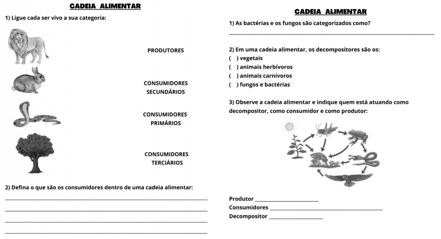 CADEIA ALIMENTAR CADEIA ALIMENTAR 1) Ligue cada ser vivo a sua categoria: 1) As bactérias e os fungos são categorizados como? PRODUTORES 2) Em uma cadeia alimentar, os decompositores são os: vegetais ( ) animais herbívoros animais carnívoros CONSUMIDORES fungos e bactérias SECUNDÁRIOS 3) Observe a cadeia alimentar e indique quem está atuando como decompositor, como consumidor e como produtor: CONSUMIDORES PRIMÁRIOS CONSUMIDORES TERCIÁRIOS 2) Defina que são os consumidores dentro de uma cadeia alimentar: Produtor Consumidores DecompositorTEIA ALIMENTAR 1) Observe a teia alimentar abaixo e responda as questões: CADEIA ALIMENTAR 1) Marque V para verdadeiro e F para Falso. Os componentes da cadeia alimentar são somente os produtores. Consumidores são os seres que dependem de outros seres para se alimentarem. Produtores são os seres que fabricam seu próprio alimento. Os consumidores são os fungos e bactérias que se alimentam dos os restos de todos os seres vivos 1) Quem são os consumidores primários? 1) Quem são os consumidores secundários? 2) Faça a relação da 1° coluna com a 2° coluna. c) Quem são os consumidores terciários? 1 Consumidores Sequência de seres vivos que dependem uns dos outros 2 Decompositores Rato, cobra, gavião 3 Produtores Bactérias e fungos 4 Cadeia alimentar Plantas e vegetaisCADEIA ALIMENTAR PIRÂMIDE ALIMENTAR 1) Complete a cadeia alimentar abaixo com os seguintes seres: 1) Observe a pirâmide alimentar abaixo e defina os componentes da cadeia em: produtores, decompositores e consumidores primários, secundários, GAFANHOTO - FOTOSSÍNTESE - FOLHAS - SAPO - COBRA - MATÉRIA ORGÂNICA etc... As bactérias e fungos se alimentam de As plantas se alimentam da FUNGOSE BACTÉRIAS gafanhoto se alimenta de GAVIÕES sapo se alimenta do . A cobra se alimenta do COBRAS A águia se alimenta da . SAPOS INSETOS GRAMÍNEAS 2) Na cadeia alimentar, como se chamam os seres que não produzem seus próprios alimentos?