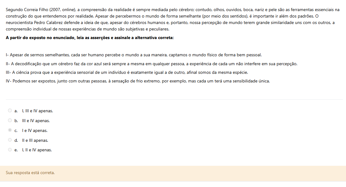Segundo Correia Filho (2007, online), a compreensão da realidade é sempre mediada pelo cérebro; contudo, olhos, ouvidos, boca, nariz e pele são as ferramentas essenciais na construção do que entendemos por realidade. Apesar de percebermos mundo de forma semelhante (por meio dos sentidos), é importante ir além dos padrões. O neurocientista Pedro Calabrez defende a ideia de que, apesar do cérebros humanos e, portanto, nossa percepção de mundo terem grande similaridade uns com os outros, a compreensão individual de nossas experiências de mundo são subjetivas e peculiares. A partir do exposto no enunciado, leia as asserções e assinale a alternativa correta: I- Apesar de sermos semelhantes, cada ser humano percebe O mundo a sua maneira, captamos O mundo físico de forma bem pessoal. II- A decodificação que um cérebro faz da cor azul será sempre a mesma em qualquer pessoa, a experiência de cada um não interfere em sua percepção. III- A ciência prova que a experiência sensorial de um indivíduo é exatamente igual a de outro, afinal somos da mesma espécie. IV- Podemos ser expostos, junto com outras pessoas, à sensação de frio extremo, por exemplo, mas cada um terá uma sensibilidade a. I, III e IV apenas. b. III e IV apenas. C. IV apenas. d. II e III apenas. e. I, II e IV apenas. Sua resposta está correta.
