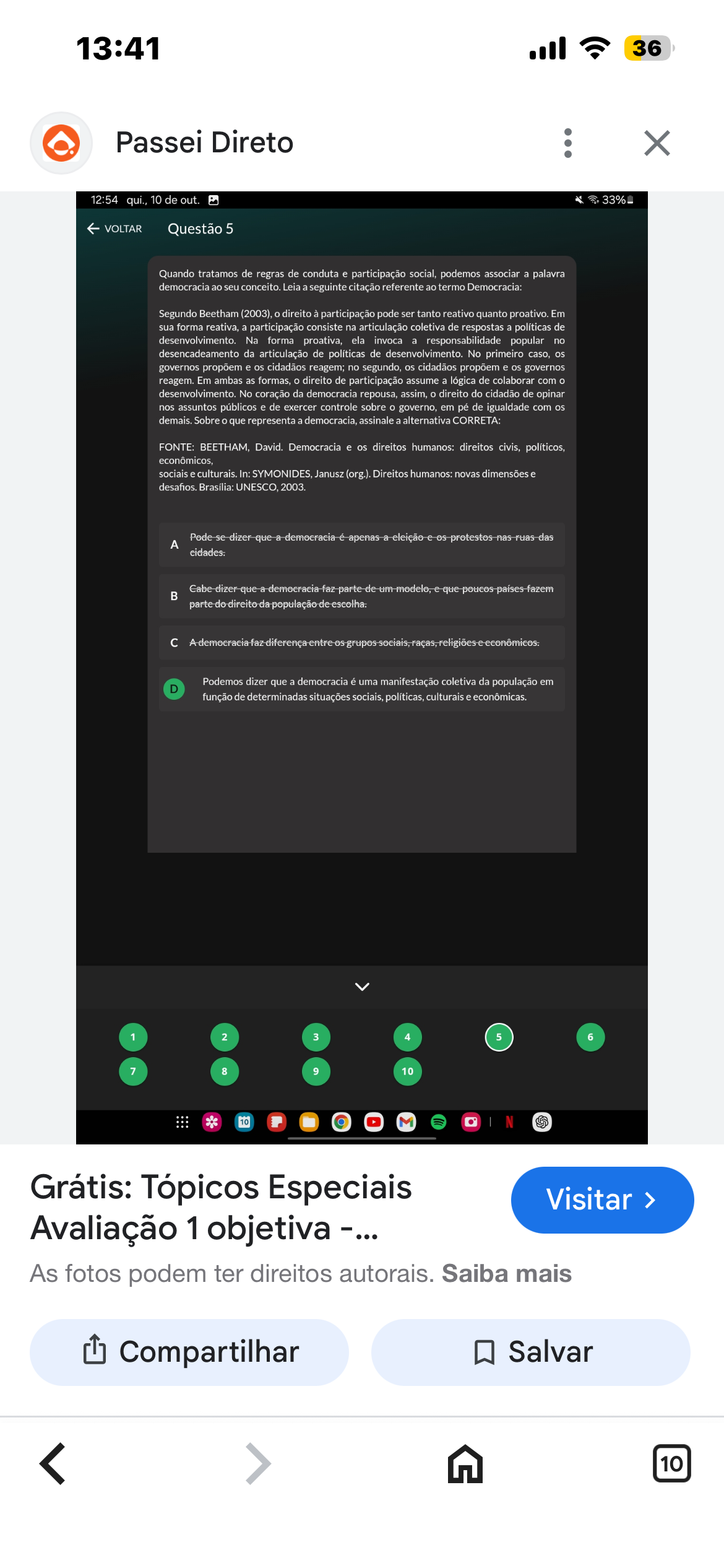 13:41 36 Passei Direto X 12:54 qui., 10 de out. VOLTAR Questão 5 Quando tratamos de regras de conduta e participação social, podemos associar a palavra democracia ao seu conceito. Leia a seguinte citação referente ao termo Democracia: Segundo Beetham (2003), direito à participação pode ser tanto reativo quanto proativo. Em sua forma reativa, a participação consiste na articulação coletiva de respostas a políticas de desenvolvimento. Na forma proativa, ela invoca a responsabilidade popular no desencadeamento da articulação de políticas de desenvolvimento. No primeiro caso, os governos propõem e os cidadãos reagem; no segundo, os cidadãos propõem e os governos reagem. Em ambas as formas, direito de participação assume a lógica de colaborar com desenvolvimento. No coração da democracia repousa, assim, direito do cidadão de opinar nos assuntos públicos e de exercer controle sobre governo, em pé de igualdade com os demais. Sobre que representa a democracia, assinale a alternativa CORRETA: FONTE: BEETHAM, David. Democracia e os direitos humanos: direitos civis, políticos, econômicos, sociais e culturais. In: SYMONIDES, Janusz (org.). Direitos humanos: novas dimensões e desafios. Brasília: UNESCO, 2003. Pode se dizer que a democracia é apenas eleição protestos nas ruas das A Cabe dizer que democracia faz parte de um modelo, que poucos países fazem B parte do direito da população de escolha. c A democracia faz diferença entre grupos sociais, raças, religiões e econômicos. Podemos dizer que a democracia é uma manifestação coletiva da população em D função de determinadas situações sociais, políticas, culturais e econômicas. 1 2 3 4 5 6 7 8 9 10 10 Grátis: Tópicos Especiais Visitar > Avaliação 1 objetiva -... As fotos podem ter direitos autorais. Saiba mais Compartilhar Salvar 10