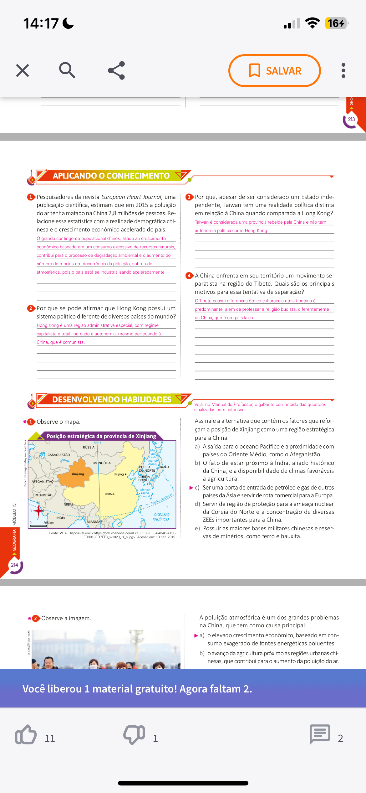 14:17 164 X SALVAR GEO 213 APLICANDO CONHECIMENTO 1 Pesquisadores da revista European Heart Journal, uma 3 Por que, apesar de ser considerado um Estado inde- publicação científica, estimam que em 2015 a poluição pendente, Taiwan tem uma realidade política distinta do an tenha matado na China 2,8 milhões de pessoas. Re- em relação à China quando comparada a Hong Kong? lacione essa estatística com a realidade demográfica chi- Taiwan é considerada uma província rebelde pela China e não tem nesa e crescimento econômico acelerado do país. autonomia política como Hong Kong. grande contingente populacional chinês, aliado ao crescimento econômico baseado em um consumo excessivo de recursos naturais, contribui para processo de degradação ambiental e aumento do número de mortes em decorrência da poluição, sobretudo atmosférica, pois país está se industrializando aceleradamente 4 A China enfrenta em seu território um movimento se- paratista na região do Tibete. Quais são os principais motivos para essa tentativa de separação? Tibete possui diferenças étnico-culturais: a etnia tibetana é 2 Por que se pode afirmar que Hong Kong possui um predominante, além de professar a religião budista, diferentemente sistema político diferente de diversos países do mundo? da China, que é um país laico Hong Kong é uma região administrativa especial, com regime capitalista e total liberdade e autonomia, mesmo pertecendo à China, que é DESENVOLVENDO HABILIDADES Veja, no Manual do Professor, gabarito comentado das questões sinalizadas com asterisco. 1 Observe mapa. Assinale a alternativa que contém os fatores que refor- çam a posição de Xinjiang como uma região estratégica Posição estratégica da província de Xinjiang para China. RUSSIA a) A saída para oceano Pacífico e a proximidade com magens/Arquivo editora CASAQUISTÃO países do Oriente Médio, como Afeganistão. MONGÓLIA b) fato de estar próximo à aliado histórico COREIA JAPÃO da China, e a disponibilidade de climas favoráveis Xinjiang COREIA à agricultura. c) Ser uma porta de entrada de petróleo e gás de outros CHINA China PAQUISTÃO países da Ásia e servir de rota comercial para a Europa. d) Servir de região de proteção para a ameaça nuclear MÓDULO GEOGRAFIA 15 OCEANO da Coreia do Norte e a concentração de diversas INDIA PACIFICO 0 MIANMAR ZEEs importantes para a China. e) Possuir as maiores bases militares chinesas e reser- VOA. Disponível em: //gdb voanews EEF4-484D-A13F ED3019ED7EF3 Acesso dez 2019 vas de minérios, como ferro e bauxita. 214 2 Observe a imagem. A poluição atmosférica é um dos grandes problemas na China, que tem como causa principal: testing/Shutterstock a) elevado crescimento econômico, baseado em con- sumo exagerado de fontes energéticas b) avanço da agricultura próximo às regiões urbanas chi- nesas, que contribui para aumento da poluição do ar. Você liberou 1 material gratuito! Agora faltam 2. 11 1 2