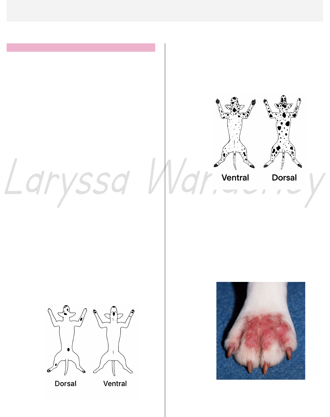 @laryssawanderley Clínica de pequenos animais dermatologia DEMODICICOSE CANINA v O que é e como acontece? Ø Ácaros do gênero Demodex são parasitas obrigatórios da pele canina, vivendo nos folículos pilosos e ocasionalmente em glândulas sebáceas. Em condições normais, o hospedeiro controla a população. Quando há defeito de imunidade celular (linfócitos T) ou predisposição hereditária, ocorre a multiplicação exacerbada desse ácaro na pele causando a doença e as lesões. Ø Não é contagiosa, a transmissão dos ácaros ocorre sobretudo durante a amamentação Ø É importante evitar a reprodução de animais afetados. Ø Mais comum em animais com predisposição, fêmeas, cães de raça pura, pelo curto. Em animais jovens 18 meses. Ø Na forma adulta sempre investigar imunossupressão (neoplasias, endocrinopatias, doenças autoimunes, infecciosas). Alguns fatores que agravam, como a desnutrição, estro/gestação, estresse, endoparasitoses, quimioterapia/corticoterapia. v Formas clínicas: Ø Localizada: (1–5 lesões): comum em jovens; pode regredir sozinha. Prurido e piodermite são raros. (Localizada) Ø Generalizada: (>5 lesões, podal, periocular/otodemodicidose), causa alopecia/hipotricose, pápulas, pústulas, escamas, crostas, eritema, piodermite secundária é frequente, prurido variável. (Generalizada) v Classificação: Ø Pododemodicicose: Ocorre nas regiões palmoplantar, digital e interdigital. Seus sinais clínicos incluem alopecia, eritema, espessamento da pele interdigital, pústulas, crostas, fissuras, e geralmente dolorosa, podendo causar claudicação . (Pododemodicicose) @laryssawanderley Ø Demodicicose periocular: Ocorre na pele ao redor dos olhos. Apresenta alopecia localizada em região periocular, eritema discreto, descamação, crostas finas. O prurido geralmente é leve ou ausente (só aparece se houver piodermite). No diagnóstico, o raspado profundo pode ser incômodo, preferir fita adesiva para coleta. § Muitas vezes pode regredir espontaneamente, se for localizada em animais jovens, caso evolua para a forma generalizada, tratar com isoxazolinas. (Demodicicose periocular) Ø Otodemodicidose: Ocorre no conduto auditivo externo (orelhas). Pode apresentar alopecia e descamação em pavilhão auricular; otite externa com eritema e crostas, podendo ser confundida com otite por sarna otodécica (Otodectes cynotis). § Tratamento: sistêmico (isoxazolinas). Não adianta usar só gotas auriculares, pois o ácaro está em folículos pilosos. v Diagnóstico: Ø Anamnese: Descrição temporal (início do quadro, local que iniciou, escala de prurido 0-10, local das lesões, se piora em determinado período, por exemplo no verão), checar antecedentes (pais e irmãos com atopia), checar medicações prévias (tópicas como shampoos e sistêmicas como ATB ou corticoides) e se há melhora ou piora com o uso. Ø Raspado cutâneo profundo: (várias áreas, pele íntegra, evitar ulcerações). Ótima sensibilidade e baixo custo. Em Shar-Pei, pododemodicidose crônica e infecção bacteriana, o exame pode complicar/ser menos fácil. Ø Fita adesiva (imprint): boa sensibilidade (≈75–100%), menos traumático, útil em periocular, peribucal, interdigital. Ø Tricograma: baixa sensibilidade; não usar para decidir suspensão de terapia. Ø Histopatologia: raramente. Útil nos suspeitos com exames negativos (p.ex., Shar-Pei). Ø Dica prática: conte estágios (larvas/ninfas/adultos/ovos). Na evolução boa, você deve ver queda progressiva da carga e ausência de imaturos nas reavaliações (sinal de que o ciclo foi quebrado). v Diagnósticos diferenciais: Ø HAC (hiperadrenocorticismo) tem que ser descartado quando a sarna aparece em animal adulto. Ø A Leishmaniose causa lesões parecidas. Ø Dermatofitose por infecção fúngica também faz lesões alopecicas e circulares que não coçam igual a demodex. Ø Piodermites tem manifestações clinicas semelhantes, pode ser a causa primária ou estar associada a demodex. @laryssawanderley v Tratamento: Ø Objetivos: controlar ácaros, tratar complicações secundárias (piodermite/malassezia/seborreia), e buscar doente de base quando houver. A remissão clínica vem antes da “cura parasitológica”. + de 3 meses. Ø Isoxazolinas: fluralaner (BRAVECTO), sarolaner (SIMPARIC), afoxolaner (NEXGARD) 1ª opção atual na demodicidose generalizada. Excelente eficácia e adesão. Ø Lactonas macrocíclicas (ivermectina 0,4– 0,6 mg/kg SID VO; mínimo 2 meses). Atenção para raças sensíveis (Collies/Shelties/Spitz/PAustraliano, etc) pois pode atravessar BHE (neurotoxicidade). Nestes casos, preferir selamectina. Ø Seborreia: Shampoos (Sebotrat S para seborreia seca e Sebotrat O para seborreia oleosa). Ø Piodermite e Malassezioze: Micodine (Shampoo), Cloresten (Shampoo antifúngicoo e antibacteriano) Ø Antibióticos para piodermite grave: cefalexina 30 mg/kg BID VO ou enrofloxacina 5 mg/kg BID VO, mínimo 3 semanas. Ø Controle do prurido: clemastina 0,05–0,1 mg/kg BID VO, evitar corticoide sempre que possível (imunossupressão). Ø Uso tópico: Semanalmente. Ø Observações: Não é alergia, portanto não tratar com corticoide, pois piora o estado do animal. Sempre realizar raspado antes de iniciar a terapêutica. v Quando parar o tratamento? Ø Fazer 3 raspados de pele negativos consecutivos com intervalos de 15 dias. O primeiro controle após 8 semanas do início do tratamento. (Atenção: cura clínica ≠ cura parasitológica). v Prevenção/recorrência: Ø Evitar reprodução e considerar castração, principalmente em fêmeas portadoras, pois piora no estro, evitar imunossupressão desnecessária.