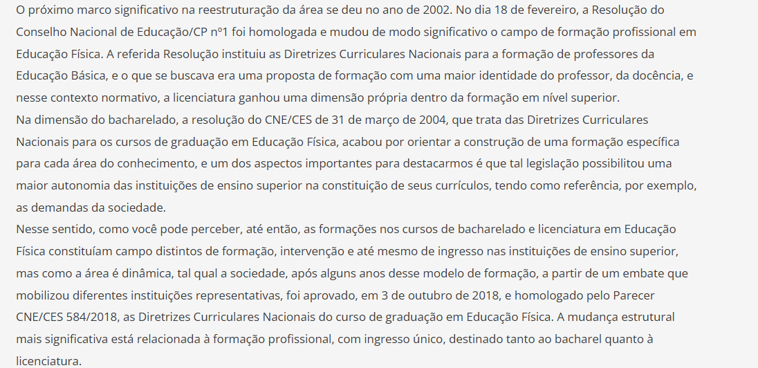 O próximo marco significativo na reestruturação da área se deu no ano de 2002. No dia 18 de fevereiro, a Resolução do Conselho Nacional de Educação/CP n°1 foi homologada e mudou de modo significativo campo de formação profissional em Educação Física. A referida Resolução instituiu as Diretrizes Curriculares Nacionais para a formação de professores da Educação Básica, eo que se buscava era uma proposta de formação com uma maior identidade do professor, da docência, e nesse contexto normativo, a licenciatura ganhou uma dimensão própria dentro da formação em nível superior. Na dimensão do bacharelado, a resolução do CNE/CES de 31 de março de 2004, que trata das Diretrizes Curriculares Nacionais para cursos de graduação em Educação Física, acabou por orientar a construção de uma formação específica para cada área do conhecimento, e um dos aspectos importantes para destacarmos é que tal legislação possibilitou uma maior autonomia das instituições de ensino superior na constituição de seus currículos, tendo como referência, por exemplo, as demandas da sociedade. Nesse sentido, como você pode perceber, até então, as formações nos cursos de bacharelado e licenciatura em Educação Física constituíam campo distintos de formação, intervenção e até mesmo de ingresso nas instituições de ensino superior, mas como a área é dinâmica, tal qual a sociedade, após alguns anos desse modelo de formação, a partir de um embate que mobilizou diferentes instituições representativas, foi aprovado, em 3 de outubro de 2018, e homologado pelo Parecer CNE/CES 584/2018, as Diretrizes Curriculares Nacionais do curso de graduação em Educação Física. A mudança estrutural mais significativa está relacionada à formação profissional, com ingresso único, destinado tanto ao bacharel quanto à licenciatura.