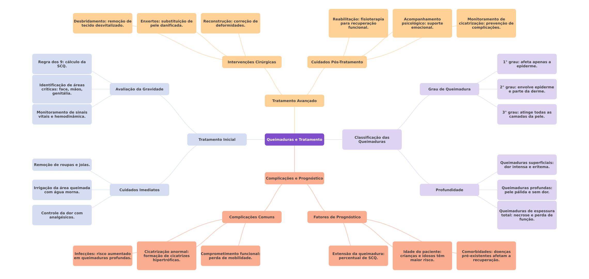 Desbridamento: remoção de Enxertos: substituição de Reconstrução: correção de Reabilitação: fisioterapia Acompanhamento Monitoramento de tecido desvitalizado. pele danificada. deformidades. para recuperação psicológico: suporte cicatrização: prevenção de funcional. emocional. complicações. Regra dos 9: cálculo da Intervenções Cirúrgicas Cuidados Pós-Tratamento 1° grau: afeta apenas a SCQ. epiderme. Identificação de áreas críticas: face, mãos, Avaliação da Gravidade Grau de Queimadura 2° grau: envolve epiderme genitália. e parte da derme. Tratamento Avançado Monitoramento de sinais 3° grau: atinge todas as vitais e hemodinâmica. camadas da pele. Tratamento Inicial Queimaduras e Tratamento Classificação das Queimaduras Remoção de roupas e joias. Queimaduras superficiais: dor intensa e eritema. Complicações e Prognóstico Irrigação da área queimada Cuidados Imediatos Profundidade Queimaduras profundas: com água morna. pele pálida e sem dor. Controle da dor com Queimaduras de espessura analgésicos. Complicações Comuns Fatores de Prognóstico total: necrose e perda de função. Infecções: risco aumentado Cicatrização anormal: Comprometimento funcional: Idade do paciente: Comorbidades: doenças formação de cicatrizes Extensão da queimadura: em queimaduras profundas. hipertróficas. perda de mobilidade. percentual de SCQ. crianças e idosos têm pré-existentes afetam a maior risco. recuperação.