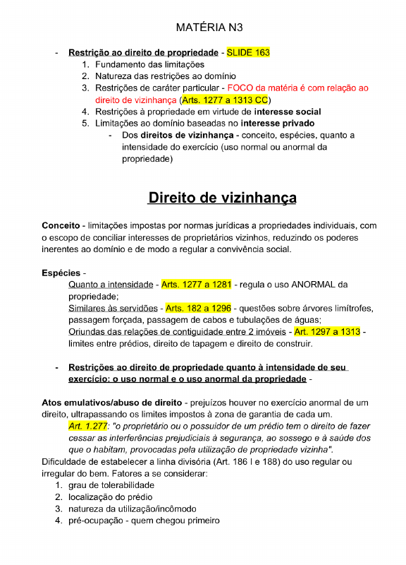 MATÉRIA N3 Restrição ao direito de propriedade SLIDE 163 1. Fundamento das limitações 2. Natureza das restrições ao domínio 3. Restrições de caráter particular FOCO da matéria é com relação ao direito de vizinhança (Arts. 1277 a 1313 CC) 4. Restrições à propriedade em virtude de interesse social 5. Limitações ao domínio baseadas no interesse privado Dos direitos de vizinhança conceito, espécies, quanto a intensidade do exercício (uso normal ou anormal da propriedade) Direito de vizinhança Conceito limitações impostas por normas jurídicas a propriedades individuais, com o escopo de conciliar interesses de proprietários vizinhos, reduzindo os poderes inerentes ao domínio e de modo a regular a convivência social. Espécies Quanto a intensidade Arts. 1277 a 1281 regula o uso ANORMAL da propriedade; Similares às servidões Arts. 182 a 1296 questões sobre árvores limítrofes, passagem forçada, passagem de cabos e tubulações de águas; Oriundas das relações de contiguidade entre 2 imóveis Art. 1297 a 1313 limites entre prédios, direito de tapagem e direito de construir. Restrições ao direito de propriedade quanto à intensidade de seu exercício: uso normal e o uso anormal da propriedade Atos emulativos/abuso de direito prejuízos houver no exercício anormal de um direito, ultrapassando os limites impostos à zona de garantia de cada um. Art. 1.277: proprietário ou o possuidor de um prédio tem direito de fazer cessar as interferências prejudiciais à segurança, ao sossego e à saúde dos que habitam, provocadas pela utilização de propriedade vizinha". Dificuldade de estabelecer a linha divisória (Art. 186 e 188) do uso regular ou irregular do bem. Fatores a se considerar: 1. grau de tolerabilidade 2. localização do prédio 3. natureza da utilização/incômodo 4. pré-ocupação quem chegou primeiroAção de dano infecto Art. 1280 Limitação legal à propriedade similar as servidões Árvores limítrofes cria condomínio necessário Art. 1282 presunção juris tantum *Prazo para reclamação 10 anos Colheita de frutos Art. 1284 Os pendentes pertencem ao dono da árvore Os que caírem em VIA PÚBLICA pertencem ao dono da árvore Os que caírem em PROPRIEDADE PRIVADA pertencem ao dono do solo onde caiu Raízes e Ramos Art. 1283 fato da raíz entrar no meu terreno ja me dá o direito de cortar a raiz, sem aviso ou indenização ao dono da árvore. Essa árvore NÃO é a da divisa dos terrenos, está em terreno alheio. *Tribunais entendem que as concessionárias de energia tem direito de poda livre!! Passagem forçada Art. 1285 caput SLIDE 174 É o direito do proprietário de prédio (rústico ou urbano), que não tem acesso a via pública, nascente ou porto, mediante pagamento de cabal indenização, reclamar do vizinho que lhe deixe passagem, com fixado judicialmente o rumo se não haver acordo. Modo menos oneroso e mais cômodo para ambas as partes. Preciso indenizar o vizinho pela passagem, e tem que ser um rumo que menos o prejudique!!!! Ação de direito de passagem, necessário provar a necessidade da passagem, e o local da passagem (menos gravoso), e ainda o montante da indenização Passagem particular sem se dirigirem a via pública NÃO é servidão!!! São atos de mera tolerância (Art. 1208). direito de passagem forçada funda-se no princípio da solidariedade social nas relações de vizinhança e o fato da sociedade ter função econômicasocial. Recebe proteção possessória (Súmula 415 STF). NÃO tem nada haver com servidão de passagem!!!! Requisitos: 1. imóvel encravado se ache, realmente, sem acesso a via pública, nascente ou porto; (*Enunciado 88 do Conselho da Justiça Federal também é garantido direito nos casos que acesso for insuficiente ou inadequado, consideradas inclusive as necessidades de exploração econômica); 2. Que o prédio esteja naturalmente encravado. seu encravamento, para efeito de passagem forçada, não pode ter sido provocado por um fato imputável, culposamente, ao proprietário encravado 3. Que proprietário do prédio receba indenização cabal (Art. 1285) cálculo deve ser feito com base na desvalorização. *O não-uso por 10 anos pode acarretar a perda (Art. 1389 III) 4. Direito deve ser exercido por um titular legítimo, ou seja, pelo proprietário, usufrutuário ou enfiteuta Art. em caso de alienação parcial do prédio, de modo que uma das partes perca o acesso a via pública, nascente ou porto, o proprietário deve tolerar a passagem" Art. se antes da alienação havia passagem através de imóvel vizinho, o proprietário deste não está constrangido, depois, a dar uma outra. Cabe ao órgão judicante decidir sobre o direito à passagem, a vista das necessidades e interesses de ambos, procurando adotar modo menos oneroso para quem concede 1.285. É uma restrição legal e NÃO uma servidão!!!!! Extingue-se quando cessarem as circunstâncias que caracterizam o encravamento. Passagem de cabos e tubulações Art. 1286 Mediante indenização proprietário é obrigado a tolerar a passagem por seu imóvel, de cabos aéreos de energia elétrica, de telefonia ou de processamento de dados ou tubulações subterrâneas de água, gás e esgoto e outros condutos subterrâneos, quando de outro modo for impossível ou excessivamente onerosa. quantum indenizatório é proporcional à desvalorização do imóvel ou ao prejuízo sofrido pela limitação do jus fruendi.proprietário pode exigir que a instalação seja feita de modo menos gravoso e é possível remoção e obras de segurança Art. 1287. Trata-se de servidões legais administrativas, são ônus reais de uso, impostos pela Administração Pública com escopo de obras e serviços públicos. Posso modificar a localização dos cabos e tubulações, desde que eu arque com os custos. Das águas Arts. 1288 a 1296 CC e Código de Águas (Decreto 24.643/34) Por relevância social o proprietário é obrigado a tolerar a passagem através de se