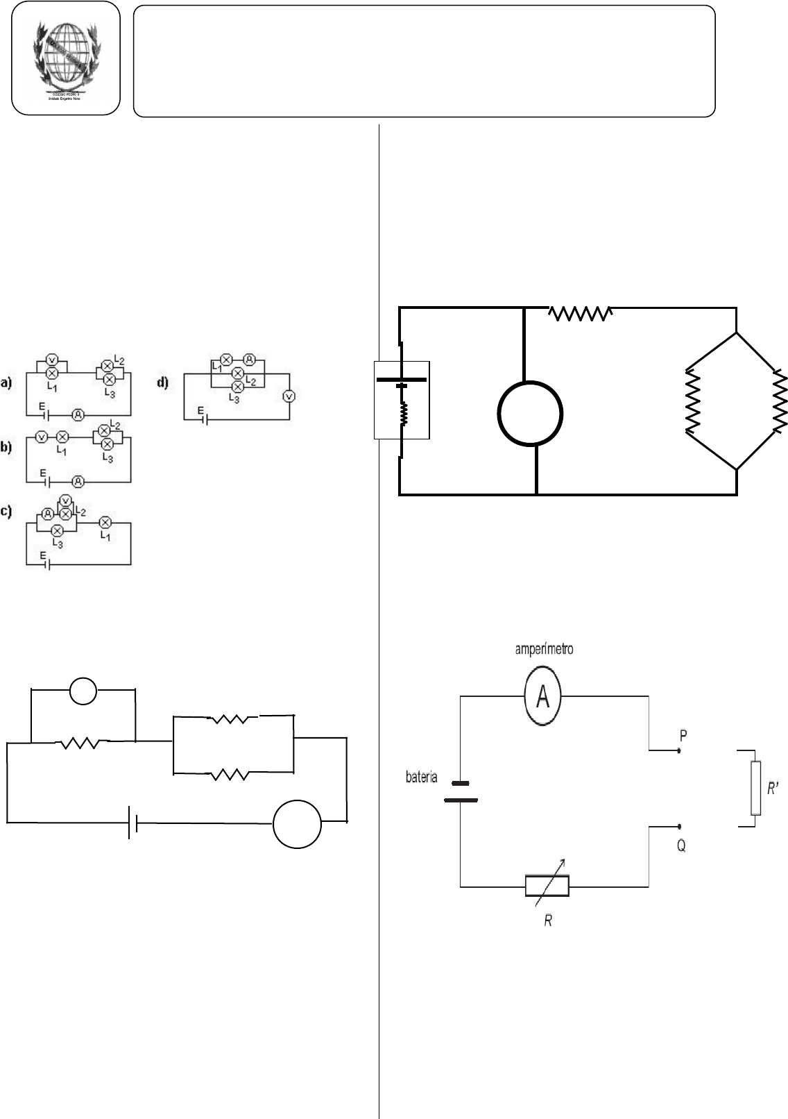 COLÉGIO PEDRO II - CAMPUS CENTRO Lista de Exercícios de Medidas Elétricas 3a. Série 2017 d.C Coordenador: Prof. Sérgio F. Lima Professores: Bianca & Sérgio F. Lima 01. (PUC/SP-2002) Um determinado circuito elétrico contém 3 lâmpadas L1, L2 e L3, uma bateria de força eletromotriz E e resistência interna desprezível, um amperímetro (A) e um voltímetro (V) ideais. As lâmpadas L2 e L3 estão ligadas em paralelo entre si e em série com a lâmpada L1 e a bateria. O voltímetro e o amperímetro estão conectados no circuito de forma a indicar, respectivamente, a tensão elétrica e a corrente elétrica na lâmpada L1. O esquema que representa corretamente a situação apresentada é 02. Observe atentamente o circuito abaixo. Cada círculo representa um aparelho ideal de medida elétrica, ligado corretamente. a) Diga qual aparelho é um amperímetro e qual é um voltímetro. JUSTIFIQUE. b) Determine as leituras (valores marcados) pelos aparelhos. 03. No circuito abaixo, a leitura do Voltímetro é 8,0V. CALCULE a resistência interna do gerador. 04. (UFMG/2006) Um amperímetro ideal pode ser utilizado para medir a resistência elétrica de resistores. Para isso, monta-se o circuito mostrado nesta figura: Nesse circuito, o amperímetro é ligado a uma bateria ideal de 1,50 V e a uma resistência variável R. Inicialmente, os terminais P e Q - indicados na figura - são conectados um ao outro. Nessa situação, a resistência variável é ajustada de forma que a corrente no circuito seja de 1,0 x 10.- 3 A. Guilherme utiliza esse circuito para medir a resistência R’ de um certo componente. Para tanto, ele conecta esse componente aos terminais P e Q e mede uma corrente de 0,30 x 10.- 3 A. 30 20 8 100 V Vr ε = 10V 2 Ω 3 Ω 6 Ω Com base nessas informações, DETERMINE o valor da resistência R’. 05. (UFMG/95) Neste circuito existem duas lâmpadas iguais, indicadas por L, ligadas a uma pilha , a um amperímetro A, a um voltímetro V e a uma chave C inicialmente aberta. Considere os medidores ideais e despreze a resistência interna da pilha. Fechando-se a chave C, é correto afirmar que : a) a leitura do amperímetro aumenta e do voltímetro diminui. b) a leitura do amperímetro não se altera e do voltímetro diminui. c) a leitura do amperímetro diminui e do voltímetro aumenta. d) a leitura do amperímetro aumenta e do voltímetro não se altera. 06. (PUC-Camp/98-modificado) No circuito representado no esquema a seguir, os resistores R1, R2 e R3 têm valores iguais a 12 ohms. De acordo com o esquema, CALCULE qual seria a leitura do amperímetro A, em amperes, e a leitura do voltímetro V, em volts. 07. Ao medir-se a corrente no circuito da figura 1 com um miliamperímetro de fundo de escala 100mA, obtém-se uma indicação de 90mA. Sendo os resistores de absoluta precisão, calcule a referida corrente e explique o porquê da diferença entre a calculada e a medida. Figura 1: 08. Observe atentamente o circuito elétrico abaixo. Considerando que todos os componentes estão ligados corretamente, qual deles poderia ser um amperímetro? a) 1. b) 2. c) 3. d) 4. 1 2 3 4 Gabarito: 01: A 02: a) O círculo menor é um voltímetro, ligado em paralelo, e o maior um amperímetro, visto que está em série. b) Req = 8 + (20 em paralelo com 30) ⇒ Req = 20 Ω 1 / X = 1/20 + 1 / 30 ⇒ x = 12 Ω i = V / R = 100 / 20 = 5A. A leitura do amperímetro é 5A. V = R i = 8.5 = 40 V A leitura do voltímetro é 40V. 03: a) 1,0 b) 225 W 04:3500 05: D 06: 2,0 A e 12 V 07: 0,1 A Como a corrente medida é menor que a teórica o amperímetro tem resistência diferente de zero, em particular, 10 Ω 08: B