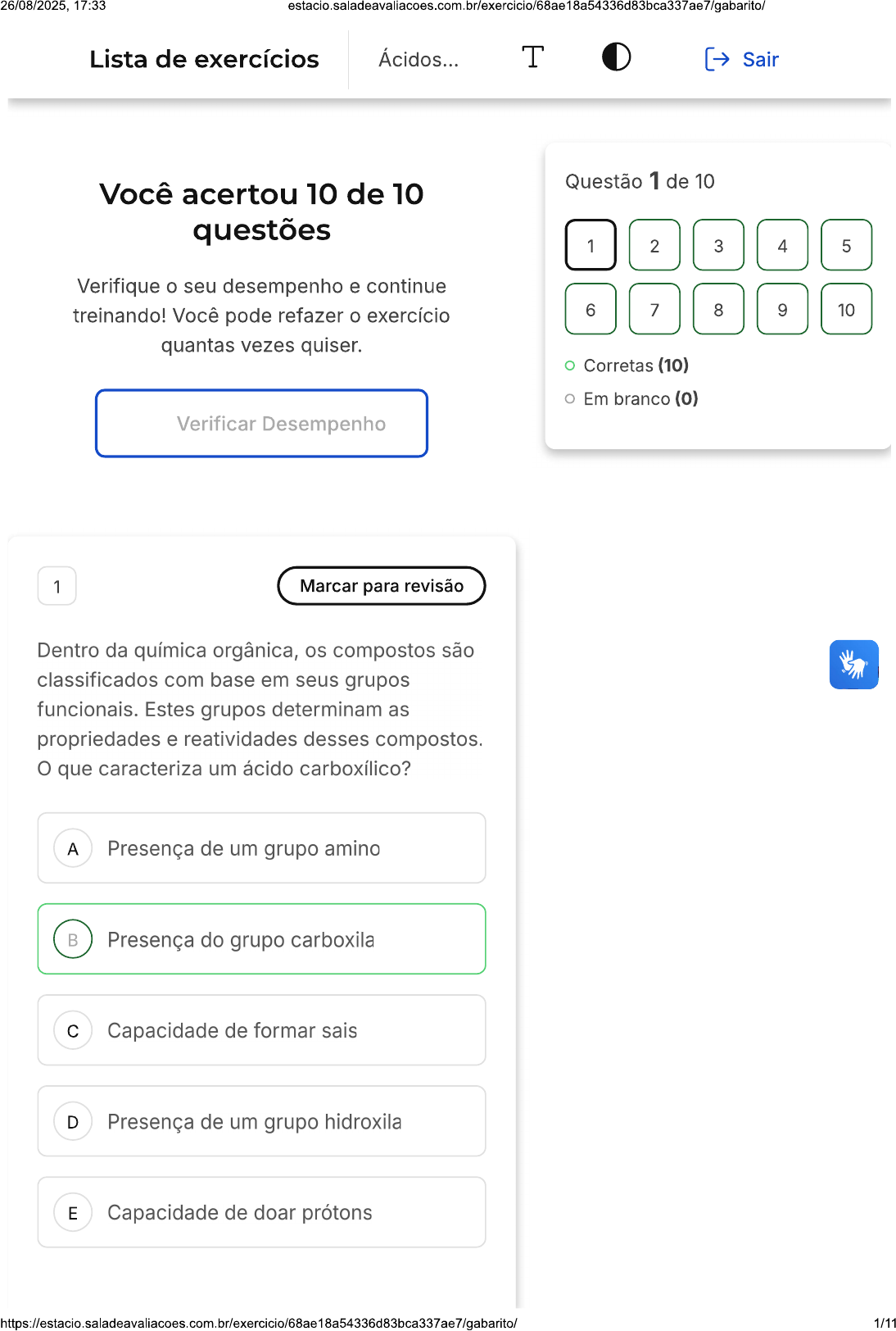 26/08/2025, 17:33 Lista de exercícios Ácidos... T Sair Questão 1 de 10 Você acertou 10 de 10 questões 1 2 3 4 5 Verifique seu desempenho e continue treinando! Você pode refazer exercício 6 7 8 9 10 quantas vezes quiser. Corretas (10) Em branco (0) Verificar Desempenho 1 Marcar para revisão Dentro da química orgânica, os compostos são classificados com base em seus grupos funcionais. Estes grupos determinam as propriedades e reatividades desses compostos. O que caracteriza um ácido carboxílico? A Presença de um grupo amino Presença do grupo carboxila c Capacidade de formar sais D Presença de um grupo hidroxila E Capacidade de doar prótons 1/1126/08/2025, 17:33 Resposta correta Parabéns, você selecionou a alternativa correta. Confira gabarito comentado! Gabarito Comentado Os ácidos carboxílicos são caracterizados pela presença do grupo carboxila em sua estrutura. Esse grupo confere a eles suas propriedades ácidas e a capacidade de formar sais ao reagir com bases. 2 Marcar para revisão Uma indústria farmacêutica desenvolve novos medicamentos utilizando ésteres derivados de ácidos carboxílicos, explorando suas propriedades físicas e químicas para fins terapêuticos. Qual é uma das principais aplicações dos ésteres derivados de ácidos carboxílicos na indústria farmacêutica? A Como catalisadores em reações. B Como agentes de sabor em alimentos. Como solventes em processos c químicos. 2/1126/08/2025, 17:33 estacio.saladeavaliacoes.com.br/exercicio/68ae18a54336d83bca337ae7/gabarito/ Como ingredientes ativos em D medicamentos. E Como conservantes em alimentos. Resposta correta Parabéns, você selecionou a alternativa correta. Confira gabarito comentado! Gabarito Comentado Na indústria farmacêutica, uma das principais aplicações dos ésteres derivados de ácidos carboxílicos é como ingredientes ativos em medicamentos. Esses compostos podem ser utilizados para modificar as propriedades físicas e químicas de fármacos, melhorando sua eficácia e biodisponibilidade. 3 Marcar para revisão Os derivados de ácidos carboxílicos têm uma vasta gama de reatividades. Estes compostos são essenciais em muitas reações químicas na indústria e na pesquisa, levando à síntese de novos materiais e produtos. Por que a reatividade dos derivados de ácidos carboxílicos é importante? 3/1126/08/2025, 17:33 A Aumenta a acidez do composto Determina ponto de fusão do composto Permite a formação de sais c inorgânicos D Reduz a solubilidade em água Possibilita a síntese de diversos E compostos úteis Resposta correta Parabéns, você selecionou a alternativa correta. Confira gabarito comentado! Gabarito Comentado A reatividade dos derivados de ácidos carboxílicos é fundamental porque permite a síntese de uma ampla variedade de compostos úteis. Estes derivados podem participar de muitas reações químicas, produzindo materiais valiosos para várias aplicações. 4 Marcar para revisão Ao estudar a síntese de amidas, um químico utiliza um cloreto de ácido como reagente inicial. A reação é um exemplo de como os 4/1126/08/2025, 17:33 derivados de ácidos carboxílicos são importantes na síntese orgânica. Qual é papel do cloreto de ácido na síntese de uma amida? A Catalisador. Solvente. c Fonte de hidrogênio. D Reagente. E Estabilizador. Resposta correta Parabéns, você selecionou a alternativa correta. Confira gabarito comentado! Gabarito Comentado Na síntese de amidas, cloreto de ácido atua como reagente. Ele reage com um composto amina para formar a amida. Esta é uma estratégia comum na química orgânica para a formação de amidas, utilizando cloretos de ácido devido à sua alta reatividade. 5 Marcar para revisão https://estacio.saladeavaliacoes.com.br/exercicio/68ae18a54336d83bca337ae7/gabarito/ 5/1126/08/2025, 17:33 estacio.saladeavaliacoes.com.br/exercicio/68ae18a54336d83bca337ae7/gabarito/ Identifique os compostos A e da reação abaixo: 0 0 1. 1. 50% refluxo OEt OEt 2. H2SO4 diluído reflluxo CH₃ A = cloreto de n-pentila / = ácido 2- A metil-hexanóico. A = 1-bromobutano / = hexanoato de etila. A = cloreto de n-butila / = hexanoato c de etila. A = ácido butanoico / B = ácido D haxanóico. A = 1-bromobutano / = ácido E hexanóico. Resposta correta Parabéns, você selecionou a alternativa correta. Confira gabarito comentado! Gabarito Comentado A resposta correta é: A = 1-bromobutano / = ácido hexanóico. 6 Marcar para revisão composto abaixo pode ser encontrado nas abelhas, formigas, urtigas e alguns frutos com a 6/1126/08/2025, 17:33 finalidade de ataque e defesa. 0 H OH A função química e nome oficial IUPAC desse composto, respectivamente, são: A Éster; éster metílico. Ácido carboxílico; metanal. c Cloreto de ácido; cloreto de metanoíla. D Ácido carboxílico; ácido metanóico. E Éster; éster etílico. Resposta correta Parabéns, você selecionou a alternativa correta. Confira o gabarito comentado! Gabarito Comentado A resposta correta é: Ácido carboxílico; ácido metanóico. 7 Marcar para revisão Os compostos orgânicos desempenham papéis cruciais em muitos processos industriais. Sua reatividade e a capacidade de interagir com 7/1126/08/2025, 17:33 estacio.saladeavaliacoes.com.br/exercicio/68ae18a54336d83bca337ae7/gabarito/ outras moléculas os tornam valiosos para a síntese de novos compostos. Qual a função das aminas na síntese de amidas a partir de ácidos carboxílicos? A Neutralizam pH da solução Convertem ácidos em aldeídos c Atuam como catalisadores D Aceleram a reação Transformam os ácidos em ânions E carboxilatos não reativos Resposta correta Parabéns, você selecionou a alternativa correta. Confira gabarito comentado! Gabarito Comentado As aminas são essenciais na síntese de amidas porque transformam os ácidos carboxílicos em ânions carboxilatos, que são menos reativos. Isso facilita a formação de amidas a partir desses ácidos. 8 Marcar para revisão Um grupo de pe