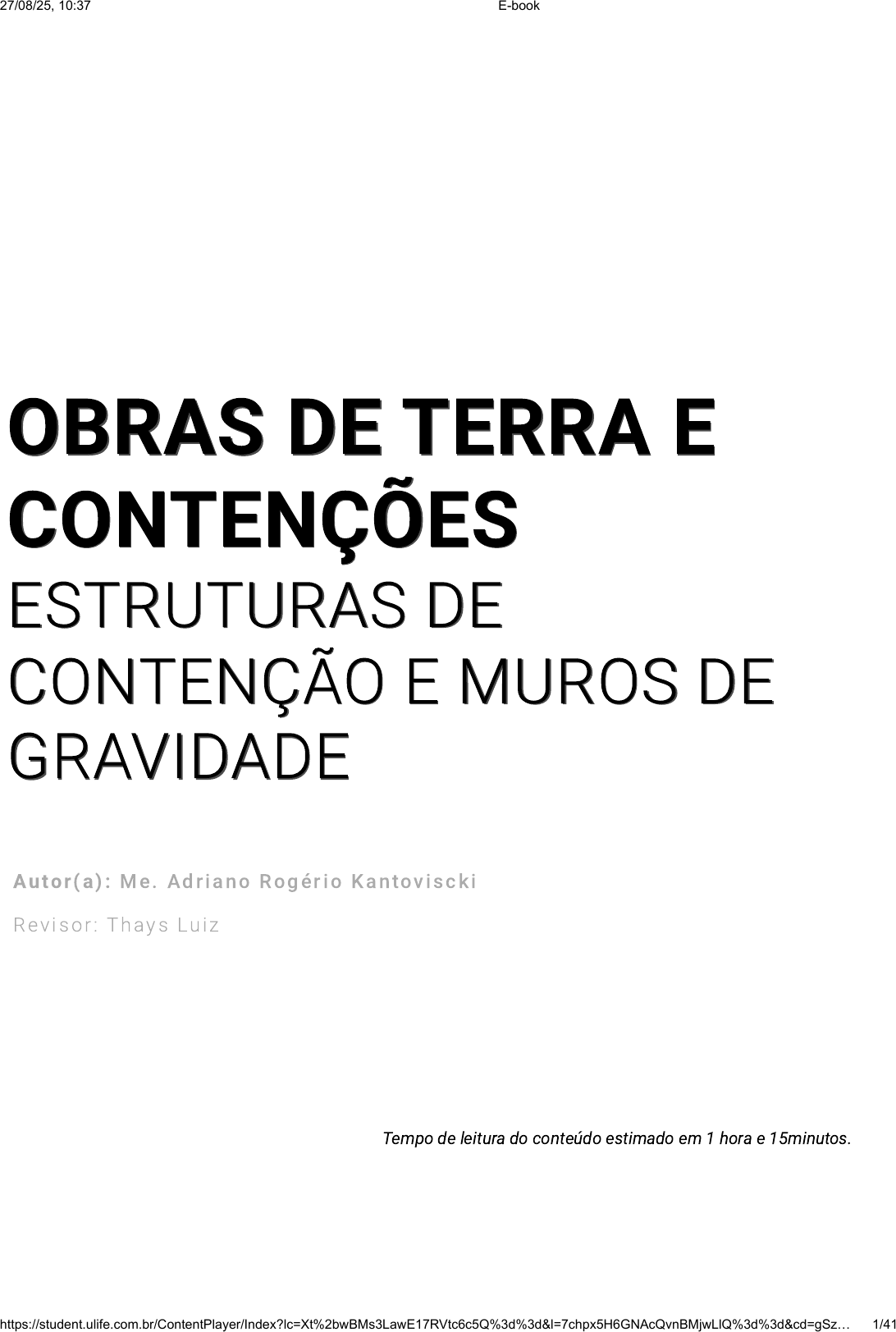 OBRAS DE TERRA EOBRAS DE TERRA E CONTENÇÕESCONTENÇÕES ESTRUTURAS DEESTRUTURAS DE CONTENÇÃO E MUROS DECONTENÇÃO E MUROS DE GRAVIDADEGRAVIDADE Au to r ( a ) : M e . A d r i a n o R o g é r i o K a n tov i s c k i R ev i s o r : T h ay s Lu i z Tempo de leitura do conteúdo estimado em 1 hora e 15minutos. 27/08/25, 10:37 E-book https://student.ulife.com.br/ContentPlayer/Index?lc=Xt%2bwBMs3LawE17RVtc6c5Q%3d%3d&l=7chpx5H6GNAcQvnBMjwLlQ%3d%3d&cd=gSz… 1/41 Introdução Olá, seja bem-vindo(a) a este estudo! Caro(a) estudante, dentro das mais variadas áreas de engenharia, temos os chamados elementos ou estruturas de contenção. Como o próprio nome já diz, essas estruturas possuem a função de conter o movimento de maciços de solo ou de rocha, evitando que ele sofra deslizamentos ou rompimentos. Nesse caso, essas estruturas devem ser dimensionadas de forma a suportar o empuxo provocado por terra e pressões que podem ser provocadas pela água. Existem situações que o próprio solo pode ser utilizado como elemento estrutural de contenção e, em outras, diferentes elementos estruturais podem ser especificados para promover a devida contenção necessária e garantir a estabilidade das massas de solo. A partir desse contexto inicial, nesta unidade, faremos uma introdução a respeito dos principais tipos de contenção que podem ser utilizados. Então, estudaremos algumas das características fundamentais desses elementos e, também, os fatores mais importantes associados ao processo de escolha do tipo de contenção, tais como o tipo de solo que será contido e o espaço disponível para a construção da estrutura de contenção, a avaliação da presença de lençol freático, a sobrecarga na estrutura e no solo, a capacidade do solo de fundação em termos de cargas e o material disponível para a execução da estrutura de contenção. Perceba que serão conhecimentos de grande valia dentro da sua vida profissional. Vamos nos aprofundar nesta jornada de conhecimento?! Bons estudos! 27/08/25, 10:37 E-book https://student.ulife.com.br/ContentPlayer/Index?lc=Xt%2bwBMs3LawE17RVtc6c5Q%3d%3d&l=7chpx5H6GNAcQvnBMjwLlQ%3d%3d&cd=gSz… 2/41 Caro(a) estudante, as estruturas de contenção são, normalmente, estruturas lineares e verticais construídas como uma parede como um elemento rígido, para suportar encostas íngremes de massas de solo e rochas em maciços fraturados, ou na estiva de materiais heterogêneos, entre outras soluções estruturais. Na prática, dentro da engenharia civil, a construção de estruturas de contenção é muito influenciada pelas leis da natureza, que atuam de forma bastante perceptível quando são feitas modificações geológicas no terreno e ele se mostra instável. Esses movimentos e deformações são ocorrentes em função, entre outros fatores, da retirada da capa de vegetação original local já que as raízes das vegetações em geral geram uma maior consistência nas encostas e ajudam a absorver parte da água que aumenta a pressão interna dentro do solo (COELHO, 1986). Você sabia que a água pode ser considerada como o principal fator de alteração da estabilidade do solo? Iremos entender isso melhor! Estruturas de contenção 27/08/25, 10:37 E-book https://student.ulife.com.br/ContentPlayer/Index?lc=Xt%2bwBMs3LawE17RVtc6c5Q%3d%3d&l=7chpx5H6GNAcQvnBMjwLlQ%3d%3d&cd=gSz… 3/41 O objetivo principal da etapa de contenção em uma obra de qualquer natureza é cessar as alterações e movimentos ocasionados pelas ações e pelas interferências que desestabilizaram o solo. O correto direcionamento destas estruturas normalmente requer a determinação da pressão lateral da massa de terra, que é uma função de fatores como tipo e magnitude de movimentos dinâmicos e pressões estáticas que a parede deve suportar, dos parâmetros de resistência ao cisalhamento nos materiais de enchimento, a partir do peso unitário do material contido e condições de drenagem no aterro. Assim, o princípio de funcionamento de todas as estruturas de contenção é o mesmo, ou seja, de forma ativa ou passiva, promover resistência ao efetivo deslocamento e ruptura da massa de terra considerada, deslocamento esse causado pelas possíveis interferências no terreno. Na Figura 2.1, a seguir, temos um exemplo de uma estrutura de contenção de uma encosta que objetiva promover a estabilidade da massa de solo neste local da rodovia, observe: 27/08/25, 10:37 E-book https://student.ulife.com.br/ContentPlayer/Index?lc=Xt%2bwBMs3LawE17RVtc6c5Q%3d%3d&l=7chpx5H6GNAcQvnBMjwLlQ%3d%3d&cd=gSz… 4/41 Alguns métodos de contenção utilizam-se somente das forças gravitacionais associadas com o elemento de contenção, já outros utilizam-se da massa do próprio solo para ajudar na estabilização. Independentemente do método utilizado, devem ser utilizados métodos de drenagem adequados, efetiva proteção superficial e impermeabilização da estrutura. Definições e princípios físicos Veja, estudante, que as estruturas de contenção são estruturas geotécnicas que se destinam à realização de escavações verticais que devem suportar a resistência do terreno que sustenta, as possíveis resistências externas Figura 2.1 – Estrutura de contenção de uma encosta Fonte: R. Williams / 123RF. #PraCegoVer : na figura, temos uma fotografia da estrutura de contenção utilizada para conter o movimento de uma encosta localizada próxima de uma estrada e de um túnel. 27/08/25, 10:37 E-book https://student.ulife.com.br/ContentPlayer/Index?lc=Xt%2bwBMs3LawE17RVtc6c5Q%3d%3d&l=7chpx5H6GNAcQvnBMjwLlQ%3d%3d&cd=gSz… 5/41 (sobrecargas) e o seu próprio peso, pelo que essa estrutura deve ser concebida para suportar essas estruturas. Para o projeto de estruturas de contenção, perceba que é necessário conhecer as teorias da pressão da terra. Conforme vimos na unidade anterior, as teorias mais aceitas são as de Coulomb e Rankine . A pressão lateral que atua sobre uma pared