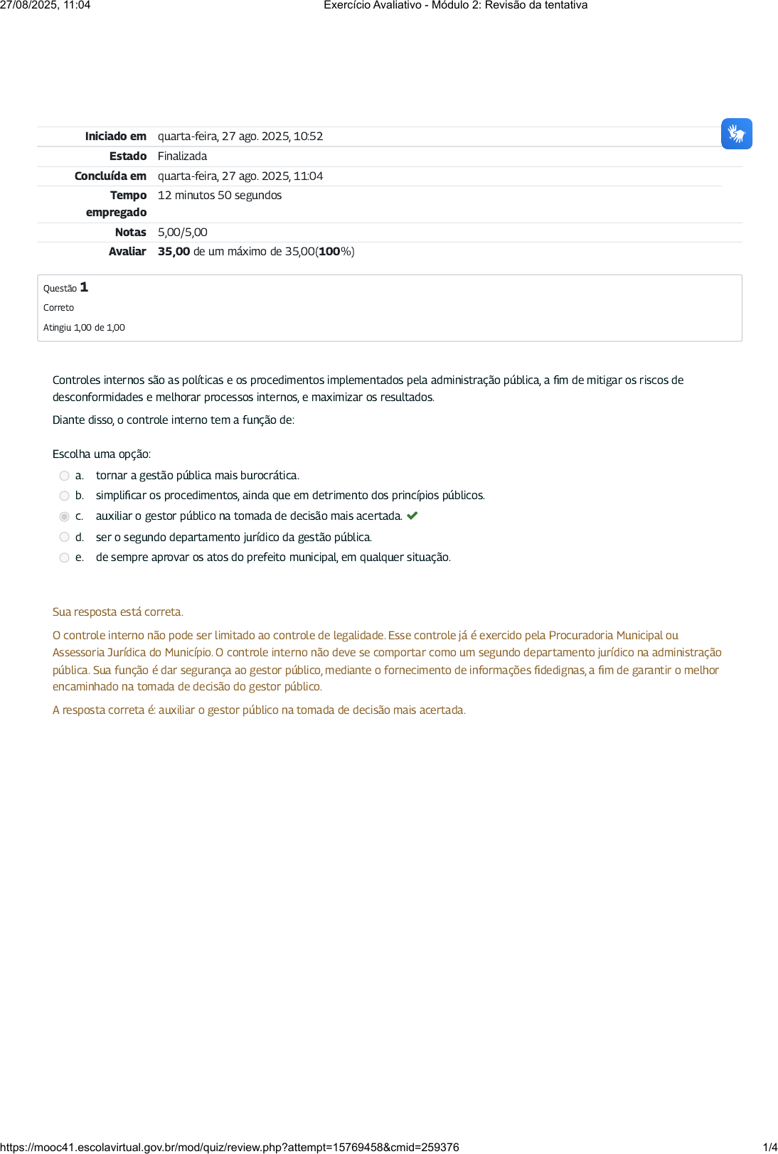 Iniciado em quarta-feira, 27 ago. 2025, 10:52 Estado Finalizada Concluída em quarta-feira, 27 ago. 2025, 11:04 Tempo empregado 12 minutos 50 segundos Notas 5,00/5,00 Avaliar 35,00 de um máximo de 35,00(100%) Questão 1 Correto Atingiu 1,00 de 1,00 Controles internos são as políticas e os procedimentos implementados pela administração pública, a fim de mitigar os riscos de desconformidades e melhorar processos internos, e maximizar os resultados. Diante disso, o controle interno tem a função de: Escolha uma opção: a. tornar a gestão pública mais burocrática. b. simplificar os procedimentos, ainda que em detrimento dos princípios públicos. c. auxiliar o gestor público na tomada de decisão mais acertada. d. ser o segundo departamento jurídico da gestão pública. e. de sempre aprovar os atos do prefeito municipal, em qualquer situação. Sua resposta está correta. O controle interno não pode ser limitado ao controle de legalidade. Esse controle já é exercido pela Procuradoria Municipal ou Assessoria Jurídica do Município. O controle interno não deve se comportar como um segundo departamento jurídico na administração pública. Sua função é dar segurança ao gestor público, mediante o fornecimento de informações fidedignas, a fim de garantir o melhor encaminhado na tomada de decisão do gestor público. A resposta correta é: auxiliar o gestor público na tomada de decisão mais acertada. 27/08/2025, 11:04 Exercício Avaliativo - Módulo 2: Revisão da tentativa https://mooc41.escolavirtual.gov.br/mod/quiz/review.php?attempt=15769458&cmid=259376 1/4 Questão 2 Correto Atingiu 1,00 de 1,00 Questão 3 Correto Atingiu 1,00 de 1,00 O controle interno deve ser estruturado, de forma a assegurar que os gestores públicos pratiquem seus atos de acordo com os princípios e leis, com foco no regular funcionamento da administração pública e orientado para a avaliação de boas práticas da gestão pública. O processo de gestão é, basicamente, composto por três fases, quais sejam: Escolha uma opção: a. controle, avaliação e auditoria. b. auditoria, corregedoria e controladoria. c. preventivo, concomitante e posterior. d. planejamento, execução e controle. e. preventivo, detectivo e repressivo. Sua resposta está correta. O gestor público deve planejar suas ações para que não seja uma gestão de improvisos; deve executar, de acordo com o planejado, e o controle terá o papel de verificação e correção da execução, sugerindo, ciclicamente, aprimoramentos. A resposta correta é: planejamento, execução e controle. A classificação dos controles na administração pública é importante para identificar a função, o órgão executor, o foco, o momento de aplicação e o nível de abrangência. Com relação ao momento do exercício do controle, assinale a opção correta. Escolha uma opção: a. Prévio é o controle que antecede a prática do ato e visa dar segurança ao gestor público que praticará e se responsabilizará por ele. b. Detectivo é o controle que detecta a materialização de eventos de risco, mas não o impede de ocorrer. c. Corretivo é o controle que acompanha, simultaneamente, a execução da atividade, a fim de verificar a regularidade de sua atuação. d. Tem por objetivo verificar a conformação do ato com as normas legais. e. É aquele realizado mediante provocação do cidadão. Sua resposta está correta. Quanto ao momento da aplicação (do exercício) do controle: (i) prévio ou preventivo: é aquele que antecede a prática ou operatividade do ato. É aplicado antes da execução da atividade, e constitui-se um requisito para sua eficácia. Tem como principais aspectos as funções autorizativas e orientadoras. Visa dar segurança àquele que pratica o ato ou por ele se responsabiliza; (ii) concomitante: é aquele que acompanha, simultaneamente, a execução da atividade, a fim de verificar a regularidade de sua formação. É exercido durante a execução da atividade controlada e visa garantir a execução da ação; (iii) posterior, corretivo ou subsequente: é aquele que se efetiva após a conclusão do ato praticado, e corrige eventuais defeitos. Visa avaliar a conformidade das ações. Ocorre após a realização da atividade e, geralmente, tem caráter corretivo, mediante auditoria. A resposta correta é: Prévio é o controle que antecede a prática do ato e visa dar segurança ao gestor público que praticará e se responsabilizará por ele. 27/08/2025, 11:04 Exercício Avaliativo - Módulo 2: Revisão da tentativa https://mooc41.escolavirtual.gov.br/mod/quiz/review.php?attempt=15769458&cmid=259376 2/4 Questão 4 Correto Atingiu 1,00 de 1,00 O controle interno não se presta, apenas, a controlar a legalidade dos atos; porquanto, essa atribuição está mais vinculada à Procuradoria Municipal. O controle interno possui outras funções, dentre as quais denominadas macrofunções do controle interno que são: Escolha uma opção: a. jurídica, compliance, política e técnica. b. auditoria, corregedoria, jurídica e curadoria. c. controle interno, corregedoria, transparência, auditoria e ouvidoria. d. julgadora, punitiva, política e jurídica. e. ouvidoria, transparência e compliance. Sua resposta está correta. Via de regra, o controle interno é estruturado, de modo a comportar com as funções do próprio controle interno, de ouvidoria, corregedoria, transparência, auditoria e corregedoria. (i) Controle interno: tem como função normatizar/padronizar as exigências regulamentares, gerenciar os riscos e estabelecer os mecanismos de defesa da administração pública. (ii) Auditoria interna: tem por função avaliar, periodicamente, os mecanismos de controles internos existentes. (iii) Transparência: como consequência do dever de publicidade dos atos oficiais, a gestão pública deve disponibilizar, por meio de sites ou portais, as informações públicas constantes da Lei de Acesso à Informação (Lei