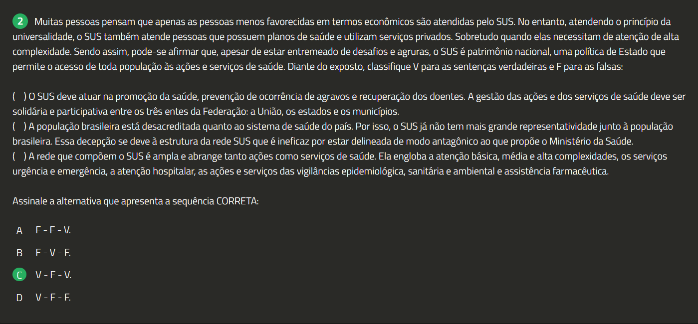 2 Muitas pessoas pensam que apenas as pessoas menos favorecidas em termos econômicos são atendidas pelo SUS. No entanto, atendendo 0 princípio da universalidade, 0 SUS também atende pessoas que possuem planos de saúde e utilizam serviços privados. Sobretudo quando elas necessitam de atenção de alta complexidade. Sendo assim, pode-se afirmar que, apesar de estar entremeado de desafios e agruras, 0 SUS é patrimônio nacional, uma política de Estado que permite acesso de toda população às ações e serviços de saúde. Diante do exposto, classifique V para as sentenças verdadeiras e F para as falsas: ( ) 0 SUS deve atuar na promoção da saúde, prevenção de ocorrência de agravos e recuperação dos doentes. A gestão das ações e dos serviços de saúde deve ser solidária e participativa entre três entes da Federação: a União, estados e municípios. ( ) A população brasileira está desacreditada quanto ao sistema de saúde do país. Por isso, 0 SUS já não tem mais grande representatividade junto à população brasileira. Essa decepção se deve à estrutura da rede SUS que é ineficaz por estar delineada de modo antagônico ao que propõe 0 Ministério da Saúde. A rede que compõem SUS é ampla e abrange tanto ações como serviços de saúde. Ela engloba a atenção básica, média e alta complexidades, serviços urgência e emergência, a atenção hospitalar, as ações e serviços das vigilâncias epidemiológica, sanitária e ambiental e assistência farmacêutica. Assinale a alternativa que apresenta a sequência CORRETA: A B D V-F-F.