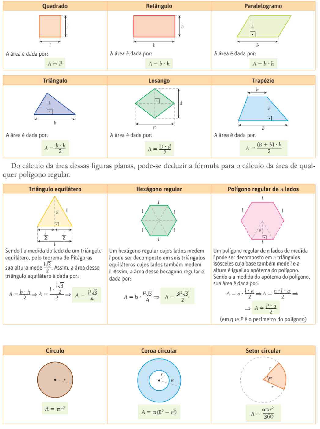 RESUMO DE ÁREAS DE FIGURAS GEOMÉTRICAS PLANAS Área de polígonos: Área do círculo ÁREA DAS FIGURAS GEOMÉTRICAS PLANAS 01) Feito o levantamento de um terreno, foram determinados os dados indicados na figura abaixo. Nessas condições, qual é a área do terreno? 02) Na figura abaixo, 𝐷𝑀̅̅ ̅̅ ̅ = 𝑀𝑁̅̅ ̅̅ ̅ = 𝑁𝐶̅̅ ̅̅ . Calcule a área da região colorida dessa figura 03) Um terreno tem a forma de um trapézio de bases 20 m e 14 m, e altura 11 m. Nesse terreno, construiu- se uma piscina retangular de 8 m por 5 m. No restante do terreno foram colocadas pedras mineiras. Qual foi a área onde se colocou pedra? 04) Mostre que a fórmula 𝐴 = (𝐵+𝑏)𝑎 2 pode ser obtida decompondo-se a região limitada pelo trapézio como na figura abaixo. 05) O perímetro de um triângulo equilátero é 30 cm. Calcule a área desse triângulo. 06) De uma placa de alumínio foi recortada uma região triangular equilátera de lado 20 cm. Qual é a área dessa região que foi recortada? 07) Qual é a área do material usado para fazer as quatro bandeirinhas abaixo? 08) Qual é a área de toda a parte colorida da figura ao lado? Qual é a área da região não colorida? 09) (Unicamp-SP) Alguns jornais calculam o número de pessoas presentes em atos públicos considerando que cada metro quadrado é ocupado por 4 pessoas. Qual a estimativa do número de pessoas presentes numa praça de 4000 m2 que tenha ficado lotada para um comício, segundo essa avaliação? 10) Um disco de cobre tem 20 cm de diâmetro. Qual é a área desse disco? 11) O piso (fundo) de uma piscina circular tem 2,80 m de diâmetro (internamente). Qual é a área do piso dessa piscina? 12) Um terreno tem a forma da figura abaixo. Na figura estão registrados alguns dados do terreno, que nos permitem calcular a sua área. Calcule, então, a área desse terreno. 13) Uma cesta de lixo tem por faces laterais trapézios isósceles e por fundo um quadrado de 19 cm de lado. Desprezando a espessura da madeira, quantos metros quadrados de madeira foram necessários para fabricar essa cesta de lixo? 14) O perímetro do quadrado ABCD da figura é 32 cm. Calcule a área da região colorida da figura. 15) Quantos centímetros quadrados de alumínio são necessários para fazer uma arruela cujas dimensões estão na figura? 16) (UCS-RS) A avaliação do número de pessoas em eventos públicos costuma ser feita considerando a concentração de um número máximo de quatro pessoas por 𝑚2. Segundo esse critério, em uma área ao ar livre, com a forma da figura abaixo, em que A, B e C são quadrados e os perímetros de A e B são, respectivamente, 16 𝑚 e 40 𝑚, e somente a região D é destinada ao público, o número máximo de pessoas que poderão participar do evento é: a) 2 560 c) 3 248 e) 3 456 b) 4 656 d) 4 800 17) (UFMG) O octógono regular de vértices ABCDEFGH, cujos lados medem 1 dm cada um, está inscrito no quadrado de vértices PQRS, conforme mostrado nesta figura: Então, é correto afirmar que a área do quadrado PQRS é: a) 1 + 2√2 𝑑𝑚2 c) 3 + 2√2 𝑑𝑚2 b) 1 + √2 𝑑𝑚2 d) 3 + √2 𝑑𝑚2 18) (FGV-SP) Em um mesmo plano estão contidos um quadrado de 9 𝑐𝑚 de lado e um círculo de 6 𝑐𝑚 de raio, com centro em um dos vértices do quadrado. A área da região do quadrado não interceptada pelo círculo, em 𝑐𝑚², é igual a: a) 9(9 − 𝜋) d) 3(9 − 2𝜋) b) 9(4𝜋 − 9) e) 6(3𝜋 − 9) c) 9(9 − 2𝜋) 19) (PUC-SP) Um retângulo tem lados 𝑎 e 𝑏 com 𝑎 + 𝑏 = 14. Sabemos que sua diagonal mede 10. Qual a sua área? a) 10 c) 24 e) 48 b) 14 d) 28 20) Calcule a área A de cada uma das figuras planas abaixo. a) b) c) d) e) 21) Determine a área das regiões coloridas (usará conceitos das áreas do círculo, do setor circular ou da coroa circular): a) b) c) d) e) f) g) Quadrado de lado 8 cm: h) i) j)
