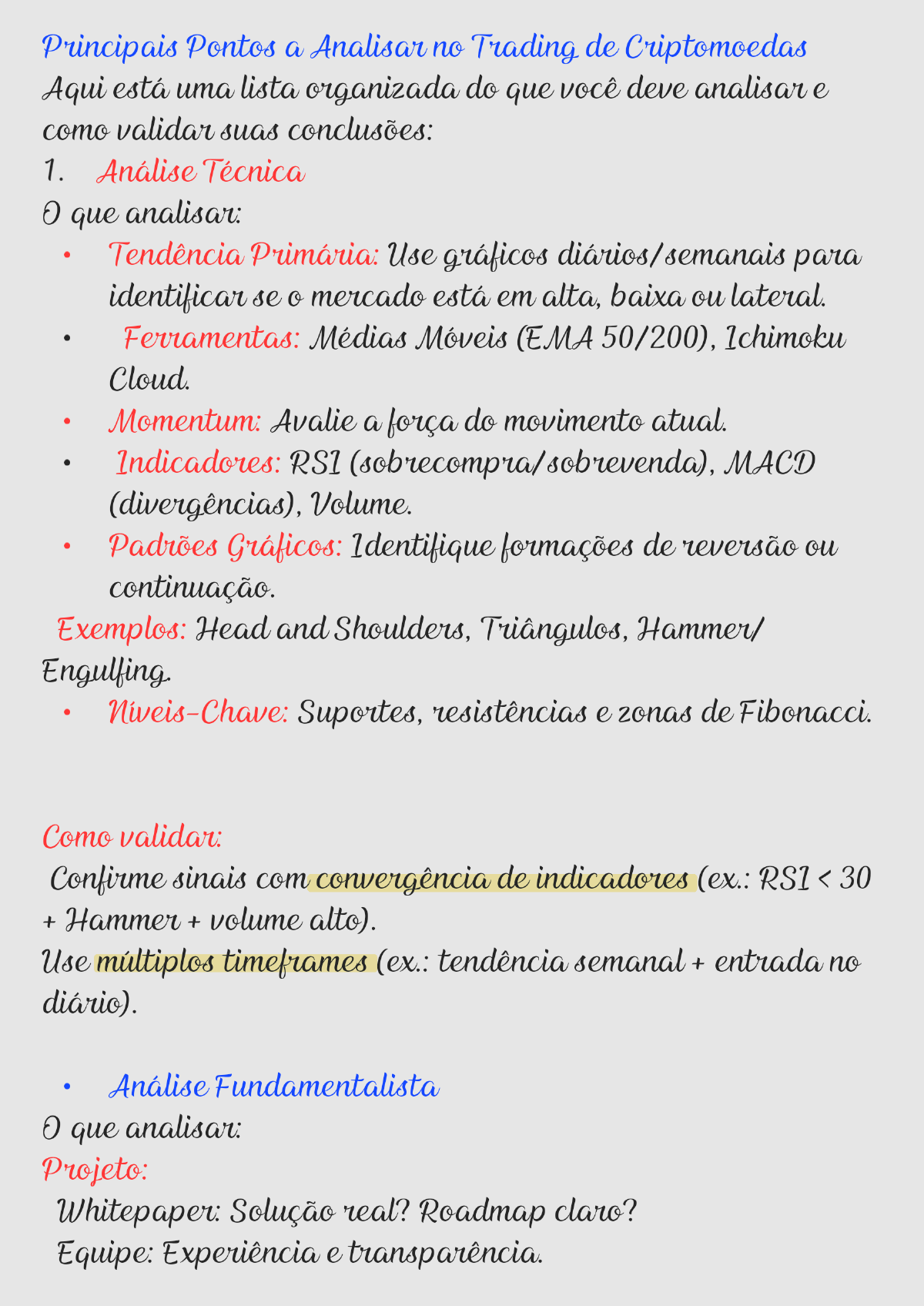 Principais Pontos a Analisar no Trading de Criptomoedas Aqui está uma lista organizada do que você deve analisar e como validar suas conclusões: 1. Análise Técnica que analisar: Tendência Primária: Use gráficos diários/semanais para identificar se o mercado está em alta, baixa ou lateral. Ferramentas: Médias Móveis (EMA 50/200), Ichimoku Cloud. Momentum: Avalie a força do movimento atual. Indicadores: RSI MACD (divergências), Volume. Padrões Gráficos: Identifique formações de reversão ou continuação. Exemplos: Head and Shoulders, Triângulos, Hammer/ Engulfing. Suportes, resistências e zonas de Fibonacci. Como validar: Confirme sinais com convergência de indicadores (ex.: RSIParcerias: Alianças com empresas tradicionais ou outros projetos. Adoção: Número de usuários ativos, TVL (Total Value Locked em DeFi). Integrações (ex.: PayPal aceitando BTC). Eventos Macroeconômicos: Decisões de juros do Fed, regulamentações, halvings. Como validar: Verifique dados em sites como CoinMarketCap, CoinGecko e Messari. Acompanhe notícias em fontes confiáveis (ex.: CoinDesk, The Block). Dados On-Chain que analisar: Supply em Lucro/Prejuízo: Se>70% em lucro, cuidado com superaquecimento. Exchange Netflow: Saída de moedas de exchanges = acumulação (sinal de alta). Atividade de Whales: Transações >$100k indicam movimentos institucionais. Hash Rate (PoW): Quedas bruscas sinalizam risco para redes como Bitcoin. Como validar: Use plataformas como Glassnode, CryptoQuant e Santiment.Sentimento do Mercado que analisar: Fear & Greed Index: Mede emocionalidade do mercado (0-100). Redes Sociais: Volume de menções (Twitter, Reddit) e polaridade (positiva/negativa). Funding Rate (Futuros): Valores extremos indicam superaquecimento (ex.: funding positivo = muitos comprados). Como validar: Ferramentas: Alternative.me (Fear & Greed), LunarCrush (análise de social media). Gestão de Risco que analisar: Position Sizing: Nunca arrisque mais de 1-2% do capital por operação. Stop Loss (SL): Baseado em suportes técnicos ou volatilidade (ATR). Take Profit (TP): Defina alvos realistas (ex.: Fibonacci, resistências). Diversificação: Não concentre em um único ativo ou setor (ex.: 50% BTC/ETH, 30% altcoins, 20% stablecoins). Como validar: Use calculadoras de risco como Position Size Calculator. Teste estratégias em backtesting (TradingView, Python).Psicologia do Trading que analisar: Viéses Cognitivos: FOMO (medo de perder), FUD (medo de perder), overconfidence. Disciplina: Seguir o plano mesmo sob pressão. Como validar: Mantenha um diário de trades para registrar emoções e erros. Pratique técnicas de mindfulness para controle emocional. Checklist para uma Análise Precisa Convergência de Sinais: Exemplo: Tendência de alta (1chimoku) + RSI não sobrecomprado + volume crescente. Contexto Macroeconômico: Exemplo: Fed mantendo juros baixos = ambiente favorável a cripto. Confirmação On-Chain: Exemplo: Whales acumulando BTC exchange netflow negativo. Gestão de Risco Definida: Exemplo: SL 10% abaixo da entrada, TP escalonado. Exemplo Prático: Como Validar uma Oportunidade de Compra Ativo: ETH/USD Análise Técnica: Preço acima da nuvem de Ichimoku no diário. RSI semanal: 45 (neutro). Volume 50% acima da média no rompimento de resistência.Fundamentalista: Upgrade Dencun previsto para reduzir taxas na rede. On-Chain: Exchange Netflow negativo (30k ETH retirados). Sentimento: Fear & Greed Index: 35 (medo). Gestão de Risco: Entrada: $1,800. SL: $1,620 (10%). TP: $2,200 (Fibonacci 161.8%). Conclusão: Setup válido (alta probabilidade de sucesso). Dicas Finais Menos é mais: Foque em 3-5 indicadores-chave. Backteste sempre: Valide estratégias em dados históricos. Atualize-se: Mercado cripto muda rapidamente acompanhe notícias diárias.