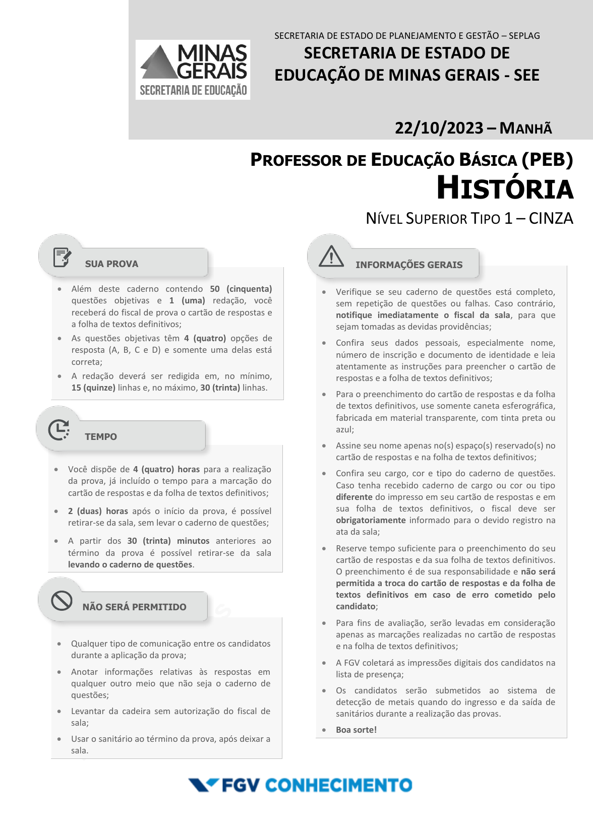 pcimarkpci MDAwMDowMDAwOjAwMDA6MDAwMDowMDAwOmZmZmY6OGZmZjpkMWEx:TW9uLCAyNiBNYXkgMjAyNSAxNTo1Njo1OCAtMDMwMA== www.pciconcursos.com.br SECRETARIA DE ESTADO DE PLANEJAMENTO E GESTÃO – SEPLAG SECRETARIA DE ESTADO DE EDUCAÇÃO DE MINAS GERAIS - SEE 22/10/2023 – MANHÃ PROFESSOR DE EDUCAÇÃO BÁSICA (PEB) HISTÓRIA NÍVEL SUPERIOR TIPO 1 – CINZA Além deste caderno contendo 50 (cinquenta) questões objetivas e 1 (uma) redação, você receberá do fiscal de prova o cartão de respostas e a folha de textos definitivos; As questões objetivas têm 4 (quatro) opções de resposta (A, B, C e D) e somente uma delas está correta; A redação deverá ser redigida em, no mínimo, 15 (quinze) linhas e, no máximo, 30 (trinta) linhas. Verifique se seu caderno de questões está completo, sem repetição de questões ou falhas. Caso contrário, notifique imediatamente o fiscal da sala, para que sejam tomadas as devidas providências; Confira seus dados pessoais, especialmente nome, número de inscrição e documento de identidade e leia atentamente as instruções para preencher o cartão de respostas e a folha de textos definitivos; Para o preenchimento do cartão de respostas e da folha de textos definitivos, use somente caneta esferográfica, fabricada em material transparente, com tinta preta ou azul; Assine seu nome apenas no(s) espaço(s) reservado(s) no cartão de respostas e na folha de textos definitivos; Confira seu cargo, cor e tipo do caderno de questões. Caso tenha recebido caderno de cargo ou cor ou tipo diferente do impresso em seu cartão de respostas e em sua folha de textos definitivos, o fiscal deve ser obrigatoriamente informado para o devido registro na ata da sala; Reserve tempo suficiente para o preenchimento do seu cartão de respostas e da sua folha de textos definitivos. O preenchimento é de sua responsabilidade e não será permitida a troca do cartão de respostas e da folha de textos definitivos em caso de erro cometido pelo candidato; Para fins de avaliação, serão levadas em consideração apenas as marcações realizadas no cartão de respostas e na folha de textos definitivos; A FGV coletará as impressões digitais dos candidatos na lista de presença; Os candidatos serão submetidos ao sistema de detecção de metais quando do ingresso e da saída de sanitários durante a realização das provas. Boa sorte! Você dispõe de 4 (quatro) horas para a realização da prova, já incluído o tempo para a marcação do cartão de respostas e da folha de textos definitivos; 2 (duas) horas após o início da prova, é possível retirar-se da sala, sem levar o caderno de questões; A partir dos 30 (trinta) minutos anteriores ao término da prova é possível retirar-se da sala levando o caderno de questões. Qualquer tipo de comunicação entre os candidatos durante a aplicação da prova; Anotar informações relativas às respostas em qualquer outro meio que não seja o caderno de questões; Levantar da cadeira sem autorização do fiscal de sala; Usar o sanitário ao término da prova, após deixar a sala. SUA PROVA TEMPO NÃO SERÁ PERMITIDO INFORMAÇÕES GERAIS Mobile User pcimarkpci MDAwMDowMDAwOjAwMDA6MDAwMDowMDAwOmZmZmY6OGZmZjpkMWEx:TW9uLCAyNiBNYXkgMjAyNSAxNTo1Njo1OCAtMDMwMA== www.pciconcursos.com.br pcimarkpci MDAwMDowMDAwOjAwMDA6MDAwMDowMDAwOmZmZmY6OGZmZjpkMWEx:TW9uLCAyNiBNYXkgMjAyNSAxNTo1Njo1OCAtMDMwMA== www.pciconcursos.com.br SECRETARIA DE ESTADO DE PLANEJAMENTO E GESTÃO – SEPLAG MG FGV CONHECIMENTO Professor de Educação Básica (PEB) - História Tipo CINZA – Página 3 MÓDULO I - CONHECIMENTOS GERAIS Língua Portuguesa 1 “Meses depois, casavase Moscoso com a pupila do defunto patrão. Chamavase Genoveva e era uma raparigaça de seus vinte e poucos anos, muito tola, de uma gordura desengraçada. Parecia toda feita de almofadas; as carnes da cara tremiamlhe quando ela andava, os olhos tinham uns tons amarelados e mortos; o cabelo vivialhe pregado ao casco da cabeça com suor, por falta de asseio. Era de uma brancura de sebo velho, falava muito descansado e com um hálito azedo; as suas mãos papudas e humidamente macias, davam em quem as tocasse a sensação repulsiva que se experimentava ao pegar na barriga de uma lagartixa”. Sobre esse pequeno texto, assinale a afirmativa correta. (A) Trata-se de um texto narrativo em que o narrador aborda as diversas etapas de um casamento. (B) Exemplifica um texto descritivo, cujo objetivo é a apresentação física de uma personagem. (C) Mostra um texto argumentativo, em que o argumentador mostra as desvantagens de um mau casamento. (D) Trata-se de um texto expositivo, em que o expositor documenta um casamento por conveniência. 2 O adjetivo pode ser substituído por algumas outras palavras ou estruturas de valor equivalente. Assinale a frase em que a adjetivação é realizada por meio de uma preposição mais um advérbio. (A) Os bois ouviam de longe o grito dos boiadeiros. (B) Todos os viajantes vinham de perto. (C) As meninas se posicionaram de lado na carroça. (D) As rodas de trás estavam com os pneus vazios. 3 As opções a seguir apresentam frases de Machado de Assis em que os termos sublinhados pertencem à mesma família de palavras, à exceção de uma. Assinale-a. (A) Cada ministro gosta de deixar, entre outros trabalhos, um que especifique seu nome no catálogo dos administradores. (B) Não há espírito que resista diante da ideia de fazer um testamento, e que, por mais simples que seja um homem, na ocasião de assinar suas últimas disposições testamentárias, torna-se de uma sisudez e uma lucidez admiráveis. (C) Casamento diferido é casamento perdido, perda causada pela indiferença, que é o pior de todos os males. (D) Não há desdouros em crer na verdade, ainda que outros a contestem, pois todas as grandes verdades acham grandes incrédulos. 4 As opções a seguir apresentam frases que foram modificadas para o nível culto de linguagem, com respeito pelas normas gramaticais. Assin