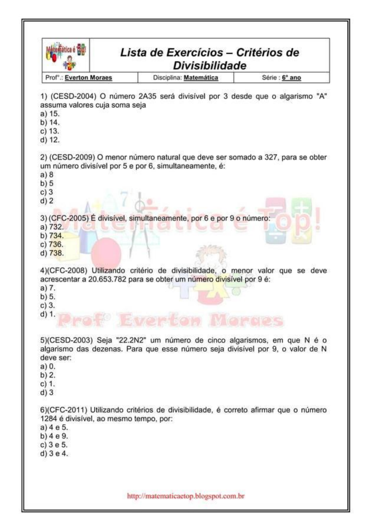 Lista de Exercícios - Critérios de Divisibilidade Everton Moraes Disciplina: Matemática Série : 6° ano 1) (CESD-2004) número 2A35 será divisível por 3 desde que o algarismo "A" assuma valores cuja soma seja a) 15. b) 14. c) 13. d) 12. 2) (CESD-2009) o menor número natural que deve ser somado a 327, para se obter um número divisível por 5 e por 6, simultaneamente, é: a) 8 b) 5 c) 3 d) 2 7 3) (CFC-2005) É divisível, simultaneamente, por 6 e por 9 número: a) 732. b) 734. c) 736. d) 738. 4 Utilizando critério de divisibilidade, menor valor que se deve acrescentar a 20.653.782 para se obter um número divisível por 9 é: a) 7. b) 5. c) 3. d) 1. Everton 5)(CESD-2003) Seja "22.2N2" um número de cinco algarismos, em que N é o algarismo das dezenas. Para que esse número seja divisível por 9, o valor de N deve ser: a) 0. b) 2. c) 1. d) 3 6)(CFC-2011) Utilizando critérios de divisibilidade, é correto afirmar que o número 1284 é divisível, ao mesmo tempo, por: c) 3 e 5. d) 3 e 4.7) Substitua as letras A e B no número 5A38B, para obter um número divisível, ao mesmo tempo, por 5, 9 e 10. 8) Substitua as letras A e no número 4A47B,a fim de obter um número divisível, ao mesmo tempo, por 2, 5, 9 e 10. 9) No número 34n27, qual é o algarismo que substitui n para que esse número seja divisível por 9? 10) Considere os números 540, 1336, 4775, 5313, 6308, 9814 e 10000. Diga quais deles são divisíveis por: a) 3 b) 4 c) 9 Gabarito: 1) a 2) 7 4) 3) 5) d C Matemática é Top! C 6) d 7)A=2eB=0 8)A=3eB=0 9) 2 10) a) 540 e 5313 b) 540, 1336, 6308 e 10000 c) 540 Everton
