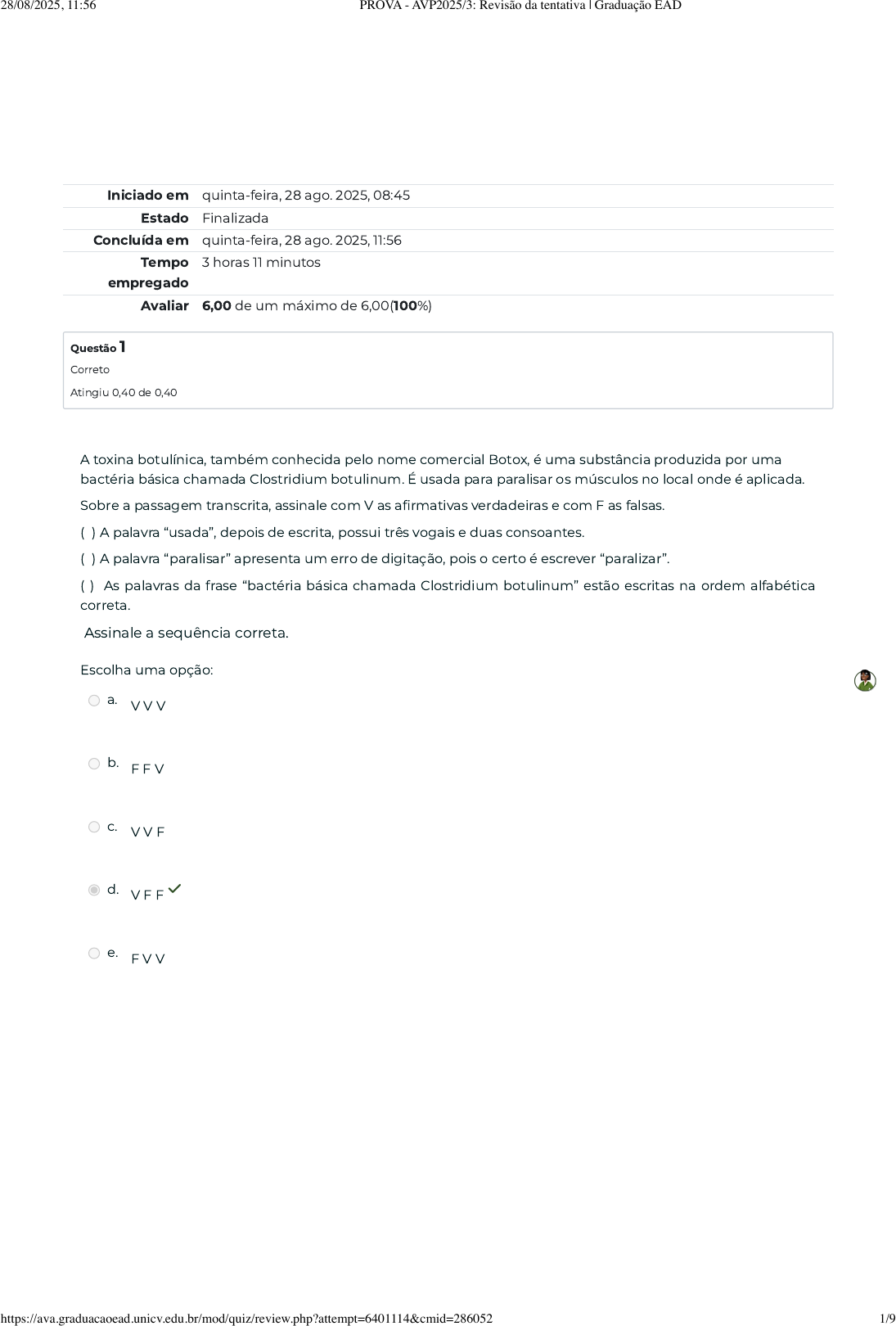 Iniciado em quinta-feira, 28 ago. 2025, 08:45 Estado Finalizada Concluída em quinta-feira, 28 ago. 2025, 11:56 Tempo empregado 3 horas 11 minutos Avaliar 6,00 de um máximo de 6,00(100%) Questão 1 Correto Atingiu 0,40 de 0,40 A toxina botulínica, também conhecida pelo nome comercial Botox, é uma substância produzida por uma bactéria básica chamada Clostridium botulinum. É usada para paralisar os músculos no local onde é aplicada. Sobre a passagem transcrita, assinale com V as afirmativas verdadeiras e com F as falsas. ( ) A palavra “usada”, depois de escrita, possui três vogais e duas consoantes. ( ) A palavra “paralisar” apresenta um erro de digitação, pois o certo é escrever “paralizar”. ( ) As palavras da frase “bactéria básica chamada Clostridium botulinum” estão escritas na ordem alfabética correta. Assinale a sequência correta. Escolha uma opção: a. V V V b. F F V c. V V F d. V F F ✓ e. F V V 28/08/2025, 11:56 PROVA - AVP2025/3: Revisão da tentativa | Graduação EAD https://ava.graduacaoead.unicv.edu.br/mod/quiz/review.php?attempt=6401114&cmid=286052 1/9 Questão 2 Correto Atingiu 0,40 de 0,40 Questão 3 Correto Atingiu 0,40 de 0,40 Em Língua Portuguesa, pode ocorrer de um grupo de duas letras representarem um único som. Assinale a alternativa em que as duas letras destacadas, nas palavras, representam um som somente: Marque a alternativa correta: Escolha uma opção: a. Pasta - letras “st”; b. Sílaba - letras “si”; c. Armação - letras “ar”. d. Passeio - letras “ss”; ✓ e. Carreta - letras “ta”; O tritongo é o encontro de três sons de vogais na mesma sílaba, sendo uma vogal e duas semivogais. Assinale a opção em que se destacou um tritongo nasal. Sabendo disso, assinale a alternativa correta: Escolha uma opção: a. Tuiuti. b. saguões. ✓ c. vem. d. saiam e. arraial. 28/08/2025, 11:56 PROVA - AVP2025/3: Revisão da tentativa | Graduação EAD https://ava.graduacaoead.unicv.edu.br/mod/quiz/review.php?attempt=6401114&cmid=286052 2/9 Questão 4 Correto Atingiu 0,40 de 0,40 Questão 5 Correto Atingiu 0,40 de 0,40 Qual o principal objetivo da fonética? Escolha uma opção: a. Analisar a estrutura gramatical das línguas. b. Analisar a sintaxe e a semântica das línguas. c. Estudar a relação existente entre os sons e seus significados. d. Investigar a produção, transmissão e percepção dos sons da fala. ✓ e. Os fonemas não são objetivos da fonética. Considerando os símbolos do Alfabeto Fonético Internacional são usados para representar os fones do Português do Brasil. Assinale a alternativa em que o símbolo fonético em questão represente corretamente as letras destacadas: Escolha uma opção: a. QUeijo - [ c ]. b. piNHo - [ ɳ ]. ✓ c. CaRRo - [ ʒ ]. d. piLHa - [ ʃ ]. e. CHuva - [ ʎ ]. 28/08/2025, 11:56 PROVA - AVP2025/3: Revisão da tentativa | Graduação EAD https://ava.graduacaoead.unicv.edu.br/mod/quiz/review.php?attempt=6401114&cmid=286052 3/9 Questão 6 Correto Atingiu 0,40 de 0,40 Questão 7 Correto Atingiu 0,40 de 0,40 Dependendo da posição do véu palatino, na hora da produção das vogais, elas poderão ser orais ou nasais. Assinale a opção em que as vogais destacadas sejam nasais. Sabendo disso, assinale a alternativa correta: Escolha uma opção: a. saudade, amamentando. b. apanhar, coração. ✓ c. malandragem, caminhonete. d. ideologia, constrangimento e. sorrindo, pátio. O chamado Estruturalismo surge na Linguística com o Curso de Linguística Geral, lançado na França em 1916, por discípulos de Ferdinand Saussure. Sobre o conceito de “fala” para o Estruturalismo, avalie as afirmações feitas a seguir e marque a que for correta: Escolha uma opção: a. Na produção da fala, o usuário da língua tem liberdade para fazer escolhas pessoais, como é o caso da escolha do vocabulário. ✓ b. A fala é orientada por uma escrita culta que segue os melhores escritores de um idioma. c. O conceito de fala para Saussure refere-se a um conjunto de regras abstratas. d. A fala surge de um certo tipo de acordo entre uma comunidade que quer comunicar-se. e. A fala é um sistema abstrato no qual o falante não tem espaço para fazer escolhas pessoais. 28/08/2025, 11:56 PROVA - AVP2025/3: Revisão da tentativa | Graduação EAD https://ava.graduacaoead.unicv.edu.br/mod/quiz/review.php?attempt=6401114&cmid=286052 4/9 Questão 8 Correto Atingiu 0,40 de 0,40 Questão 9 Correto Atingiu 0,40 de 0,40 Texto para a questão 06: “AMAZÔNIA - Resgatada há 4 anos, onça-pintada passa por adaptação para receber visitas no Bioparque da Amazônia. ‘Fera’ chegou há duas semanas na casa nova; antes o animal vivia no Cetas, do Ibama. Visitas são liberadas em dias alternados.” AMAZÔNIA - Resgatada há 4 anos, onça-pintada passa por adaptação para receber visitas no Bioparque da Amazônia.G1.Globo.com. Rio de Janeiro, 3 de fev. de 2020. Disponível em: https://g1.globo.com/natureza/amazonia/. Acesso em 15 de abril de 2020. Em Língua Portuguesa nem sempre há correspondência exata entre letra e som. Considerando o texto acima, assinale a alternativa correta sobre essa correspondência: Escolha uma opção: a. Na palavra “visitas”, a primeira ocorrência de “s” representa o som [ s ]. b. Na palavra “onça-pintada”, o “ç” representa o mesmo som que as letras “ch”, na palavra “chegou”. c. As letras “ss” da palavra “passa” apresentam um som diferente do que é representado pela letra “ç”, na palavra “adaptação”. d. Na palavra “há”, a letra “h” não representa nenhum som. ✓ e. Na palavra “Bioparque”, as letras “qu” representam dois sons. Na hora da produção das consoantes, caso o ar vibre as cordas vocais por elas estarem fechadas, vai haver a produção de uma consoante vozeada. Mas, se as cordas vocais estiverem abertas, haverá as condições para a articulação de consoantes não vozeadas. Diante disso, assinale a