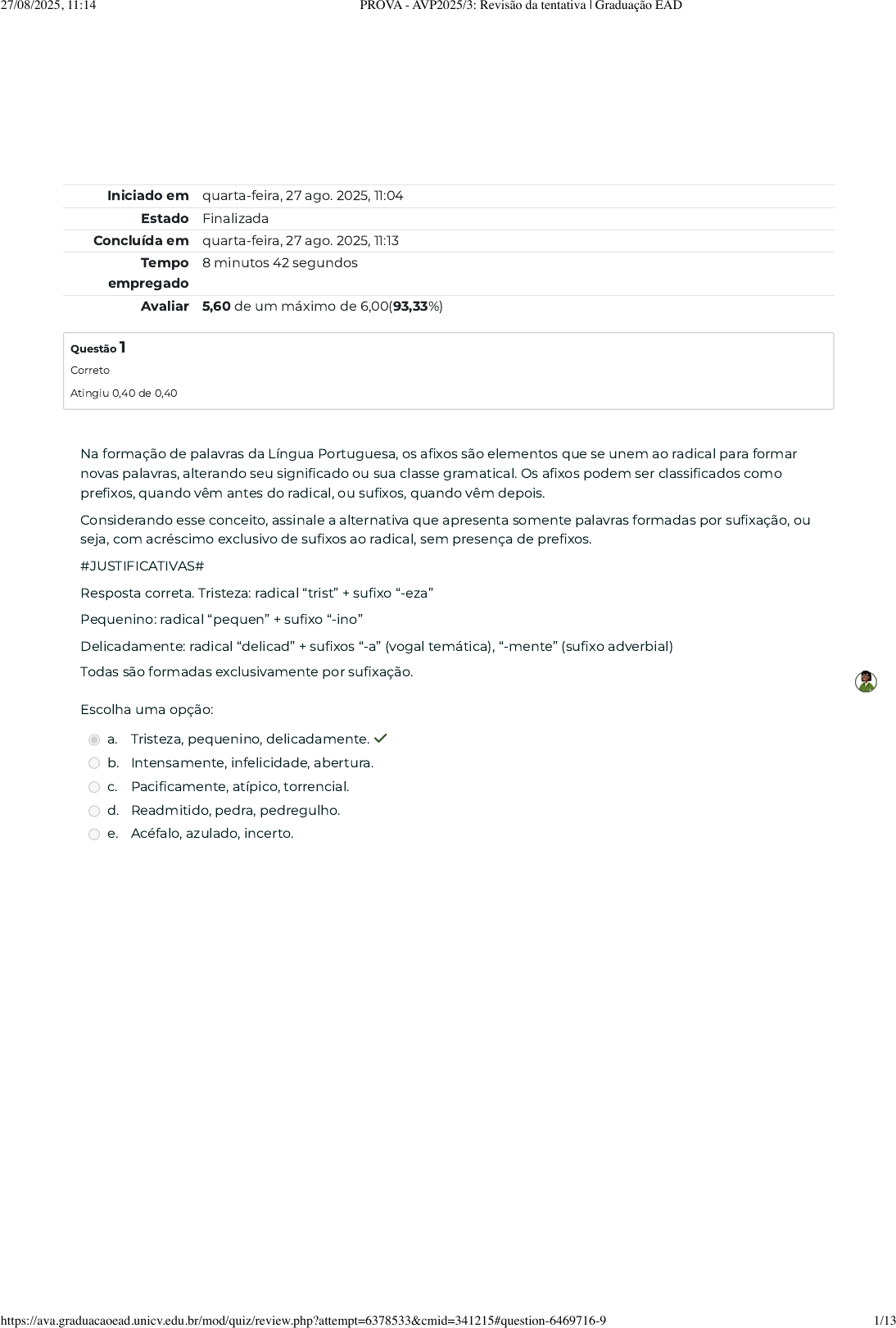 Iniciado em quarta-feira, 27 ago. 2025, 11:04 Estado Finalizada Concluída em quarta-feira, 27 ago. 2025, 11:13 Tempo empregado 8 minutos 42 segundos Avaliar 5,60 de um máximo de 6,00(93,33%) Questão 1 Correto Atingiu 0,40 de 0,40 Na formação de palavras da Língua Portuguesa, os afixos são elementos que se unem ao radical para formar novas palavras, alterando seu significado ou sua classe gramatical. Os afixos podem ser classificados como prefixos, quando vêm antes do radical, ou sufixos, quando vêm depois. Considerando esse conceito, assinale a alternativa que apresenta somente palavras formadas por sufixação, ou seja, com acréscimo exclusivo de sufixos ao radical, sem presença de prefixos. #JUSTIFICATIVAS# Resposta correta. Tristeza: radical “trist” + sufixo “-eza” Pequenino: radical “pequen” + sufixo “-ino” Delicadamente: radical “delicad” + sufixos “-a” (vogal temática), “-mente” (sufixo adverbial) Todas são formadas exclusivamente por sufixação. Escolha uma opção: a. Tristeza, pequenino, delicadamente. ✓ b. Intensamente, infelicidade, abertura. c. Pacificamente, atípico, torrencial. d. Readmitido, pedra, pedregulho. e. Acéfalo, azulado, incerto. 27/08/2025, 11:14 PROVA - AVP2025/3: Revisão da tentativa | Graduação EAD https://ava.graduacaoead.unicv.edu.br/mod/quiz/review.php?attempt=6378533&cmid=341215#question-6469716-9 1/13 Questão 2 Correto Atingiu 0,40 de 0,40 A origem das palavras pode ser compreendida por meio da análise de seus radicais, que revelam significados fundamentais e a influência de línguas clássicas como o grego e o latim. Esses elementos são amplamente utilizados na formação de vocábulos tanto no português cotidiano quanto em campos técnicos e científicos. Com base nessas informações, analise as afirmativas a seguir: I. Os radicais gregos são frequentemente utilizados em áreas como biologia, filosofia e psicologia, estando presentes em palavras técnicas e científicas. II. Radicais de origem latina são comuns na linguagem do dia a dia e em campos como o direito, a política e a religião. III. O uso de um radical grego combinado com um radical latino na mesma palavra é considerado um erro gramatical e deve ser evitado na norma culta. IV. Palavras como “autonomia”, “antropologia” e “hidrografia” exemplificam o uso de radicais gregos na formação de termos modernos. Está correto o que se afirma em: #JUSTIFICATIVAS# Resposta correta. A afirmativa I está correta, pois os radicais gregos são amplamente usados em campos científicos e técnicos. A afirmativa II também está correta, já que os radicais latinos compõem grande parte do vocabulário cotidiano, especialmente nas áreas jurídica, política e administrativa. A afirmativa III está incorreta, pois embora o hibridismo (junção de radicais gregos e latinos) fosse evitado tradicionalmente, hoje é comum e aceito na formação de palavras como “sociologia”. A afirmativa IV está correta, pois todas as palavras citadas são formadas com radicais gregos, demonstrando sua presença no vocabulário técnico moderno. Escolha uma opção: a. I e II, apenas. b. II e III, apenas. c. I, II, III e IV. d. I, II e III, apenas. e. I, II e IV, apenas. ✓ 27/08/2025, 11:14 PROVA - AVP2025/3: Revisão da tentativa | Graduação EAD https://ava.graduacaoead.unicv.edu.br/mod/quiz/review.php?attempt=6378533&cmid=341215#question-6469716-9 2/13 Questão 3 Correto Atingiu 0,40 de 0,40 Qualquer palavra ou vocábulo da língua pode ser analisado sob diferentes perspectivas linguísticas. A seguir, apresentam-se possíveis análises da palavra garoto. Analise as afirmativas: I. Do ponto de vista fonológico, a palavra apresenta 6 fonemas e está dividida em 3 sílabas. Cada uma dessas partes, quando analisada isoladamente, não possui significado próprio. II. Do ponto de vista morfológico, a palavra apresenta duas partes significativas: “garot-” (radical) e “-o” (desinência de gênero masculino). III. Do ponto de vista sintático, a palavra pode exercer diferentes funções na oração, como sujeito, objeto, vocativo, entre outras, dependendo do contexto. IV. Do ponto de vista etimológico, o vocábulo “garoto” tem origem no latim vulgar e foi incorporado ao português com o sentido de “escravo jovem”, mantendo esse significado até os dias atuais. É correto o que se afirma em: #JUSTIFICATIVAS# Resposta correta. A afirmativa I é correta, pois do ponto de vista fonológico, a palavra “garoto” possui 6 fonemas: [g], [a], [r], [o], [t], [o], e está dividida em 3 sílabas: ga-ro-to. Além disso, cada sílaba isoladamente não possui significado, o que é típico da análise fonológica. A afirmativa II é correta, pois na morfologia, o vocábulo é composto por “garot” (radical) e “-o” (desinência de gênero masculino). Trata-se de um substantivo simples, derivado de um único radical. A afirmativa III é correta, uma vez que, sob a ótica sintática, a palavra “garoto” pode exercer diferentes funções em uma oração, como sujeito (“O garoto correu”), objeto direto (“Vi o garoto ontem”), vocativo (“Garoto, venha aqui!”), entre outras. A afirmativa IV é incorreta, pois embora “garoto” tenha raízes no português arcaico e em usos coloniais associados a posições de servidão, o sentido etimológico não é diretamente do latim, nem o significado de “escravo jovem” se mantém até os dias atuais. Atualmente, “garoto” é utilizado majoritariamente como sinônimo de menino, jovem do sexo masculino, e o sentido histórico caiu em desuso e foi ressignificado. Escolha uma opção: a. I, II e III, apenas. ✓ b. I, apenas. c. II e IV, apenas. d. I, II e IV, apenas. e. III e IV, apenas. 27/08/2025, 11:14 PROVA - AVP2025/3: Revisão da tentativa | Graduação EAD https://ava.graduacaoead.unicv.edu.br/mod/quiz/review.php?attempt=6378533&cmid=341215#question-6469716-9 3/13 Questão 4 Correto A