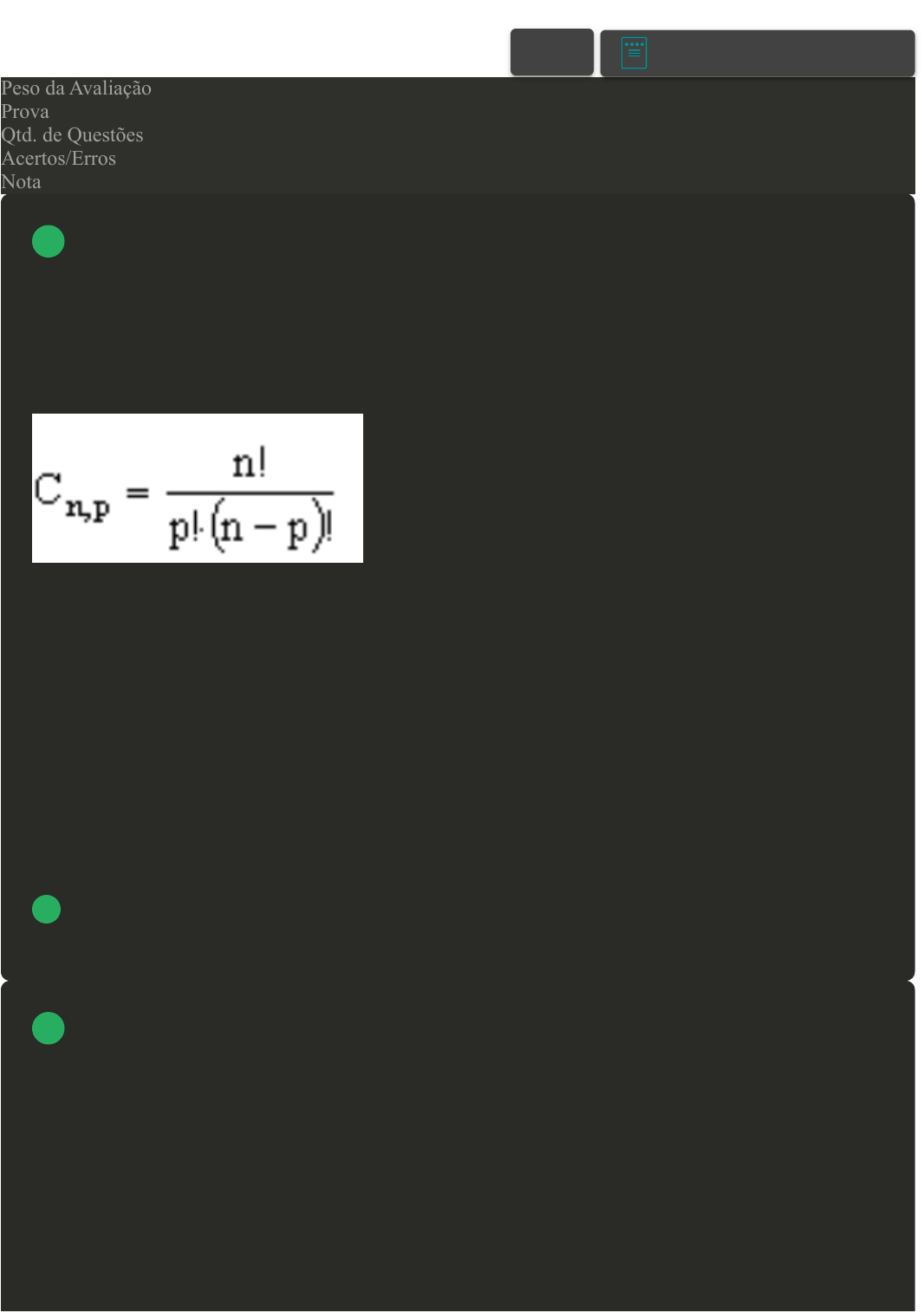 Prova Impressa GABARITO | Avaliação I - Individual (Cod.:1522136) Peso da Avaliação 2,00 Prova 104829037 Qtd. de Questões 10 Acertos/Erros 9/1 Nota 9,00 Denominam-se combinações de n elementos distintos tomados p a p os conjuntos formados por p elementos distintos escolhidos entre os n elementos dados. Quantas são as combinações de 6 elementos tomados 2 a 2? Assinale a alternativa CORRETA: A 60. B 6/8. C 10. D 15. O Teorema de Multiplicação permite calcular a probabilidade da ocorrência simultaneamente de dois eventos a partir das probabilidades condicionais. Qual a probabilidade de ao retirar de forma aleatória duas cartas, uma após a outra e sem reposição da primeira, de um baralho completo, de que as duas cartas retiradas sejam do naipe de copas? Observação: Um baralho completo tem 52 cartas divididas em 4 naipes (Copas, Ouros, Espadas e Paus). VOLTAR A+ Alterar modo de visualização 1 2 Assinale a alternativa CORRETA: A A probabilidade é igual a 5,88%. B A probabilidade é igual a 1,625%. C A probabilidade é igual a 1/15. D A probabilidade é igual a 1/14. O fatorial (!) de um número natural n, representado por n!, é a multiplicação de n por seus antecessores maiores ou iguais a 1. Essa operação é muito comum em análise combinatória. Qual o valor de 7! ? Assinale a alternativa CORRETA: A 5 140. B 5 040. C 5 340. D 5 240. Os dados têm a forma de cubos justamente para que a probabilidade de cada face sair voltada para cima seja a mesma. Sobre a probabilidade de sair um número par no primeiro e um número ímpar no segundo lançamento, em dois lançamentos de um dado honesto, assinale a alternativa CORRETA: A A probabilidade é de 1/3. 3 4 B A probabilidade é de 1/2. C A probabilidade é de 1/4. D A probabilidade é de 1/6. As permutações das letras da palavra AMOR foram listadas em ordem alfabética, formando-se anagramas. Qual a posição do anagrama OMRA? Assinale a alternativa CORRETA: A Décima oitava posição. B Décima sexta posição. C Décima quarta posição. D Vigésima segunda posição. Um suco pode ser preparado com uma ou mais frutas. Se temos à disposição três tipos de frutas, calcule quantos sucos diferentes podem ser preparados. Com base no exposto, assinale a alternativa CORRETA: A Podem ser preparados 14 sucos diferentes. B Podem ser preparados 10 sucos diferentes. 5 6 C Podem ser preparados 7 sucos diferentes. D Podem ser preparados 21 sucos diferentes. A ida de Indaial a Gaspar se dá em duas etapas: a primeira, de Indaial a Blumenau, pode ser realizada de duas maneiras, e para cada uma delas a segunda etapa, de Blumenau a Gaspar, pode ser realizada de três maneiras. Sendo assim, a realização das duas etapas pode ser feita de 2 · 3 modos, que correspondem a seis caminhos de Indaial a Gaspar. Essa constante pode ser observada a partir do Princípio Fundamental da Contagem. Acerca da definição de Princípio Fundamental da Contagem, assinale a alternativa CORRETA: A Se uma ação é composta de duas etapas sucessivas, sendo que a primeira pode ser feita de m modos e, para cada um destes, a segunda pode ser feita de n modos, então o número de modos de realizar a ação é m·n. Este princípio pode ser generalizado para ações compostas por, no máximo, duas etapas. B Se uma ação é composta de duas etapas sucessivas, sendo que a primeira pode ser feita de m modos e, para cada um destes, a segunda pode ser feita de n modos, então o número de modos de realizar a ação é m·n. Este princípio pode ser generalizado para ações compostas por mais de duas etapas. C Se uma ação é composta de três etapas sucessivas, sendo que a primeira pode ser feita de m modos e, para cada um destes, a segunda pode ser feita de n modos, e a terceira é nula, então o número de modos de realizar a ação é m·n. Este princípio pode ser generalizado para ações compostas por mais de duas etapas. D Se uma ação é composta de duas etapas sucessivas, sendo que a primeira pode ser feita de m modos e, para cada um destes, a segunda pode ser feita de n modos, então o número de modos de realizar a ação é p·n. Este princípio pode ser generalizado para ações compostas por mais de duas etapas. O fatorial (!) de um número natural n, representado por n!, é a multiplicação de n por seus antecessores maiores ou iguais a 1. Essa operação é muito comum em análise combinatória. Qual o valor correspondente a 4! ? Assinale a alternativa CORRETA: 7 Revisar Conteúdo do Livro 8 A 20. B 24. C 16. D 8. Considere a probabilidade de sair o às de ouros quando retiramos uma carta de um baralho de 52 cartas. Acerca do resultado, assinale a alternativa CORRETA: A 1/13. B 1/54. C 1/52. D 1/26. Um gerente de uma determinada empresa deve escolher cinco colaboradores, num grupo de dez colaboradores para um treinamento. O número de maneiras que ele pode realizar a escolha, pode ser calculado através de qual das opções abaixo? Assinale a alternativa CORRETA: A C10. B P10. 9 10 C A10,5. D C10,5. Imprimir