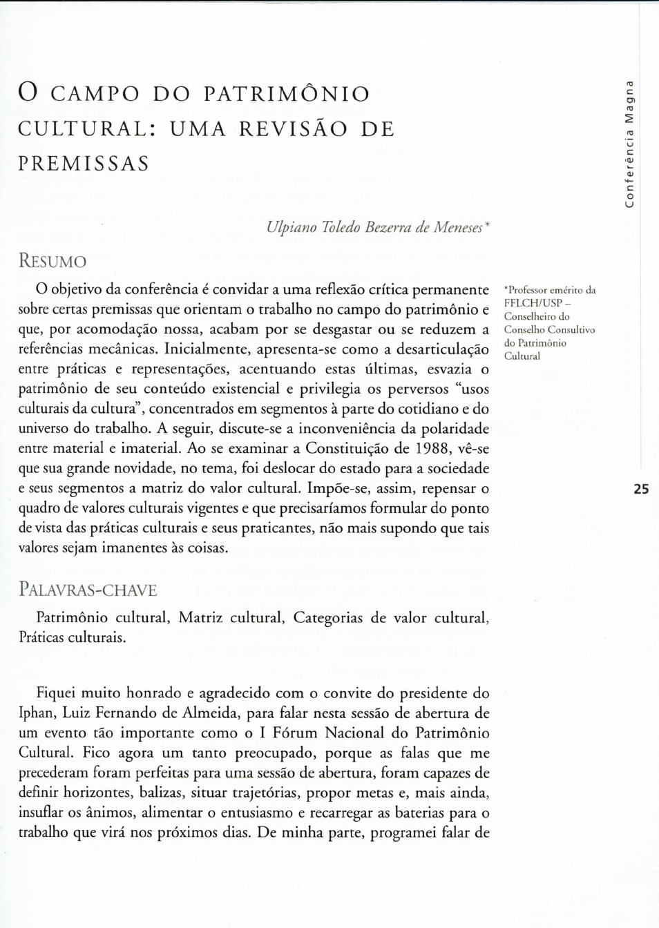 O CAMPO DO PATRIMÔNIO CULTURAL: UMA REVISÃO DE PREMISSAS Ulpiano Toledo Bezerra de Meneses* RESUMO O objetivo da conferência é convidar a uma reflexão crítica permanente *Professor emérito da FFLCH/USP sobre certas premissas que orientam o trabalho no campo do patrimônio e Conselheiro do que, por acomodação nossa, acabam por se desgastar ou se reduzem a Conselho Consultivo do Patrimônio referências mecânicas. Inicialmente, apresenta-se como a desarticulação Cultural entre práticas e representações, acentuando estas últimas, esvazia o patrimônio de seu conteúdo existencial e privilegia os perversos "usos culturais da cultura", concentrados em segmentos à parte do cotidiano e do universo do trabalho. A seguir, discute-se a inconveniência da polaridade entre material e imaterial. Ao se examinar a Constituição de 1988, vê-se que sua grande novidade, no tema, foi deslocar do estado para a sociedade e seus segmentos a matriz do valor cultural. assim, repensar o 25 quadro de valores culturais vigentes e que precisaríamos formular do ponto de vista das práticas culturais e seus praticantes, não mais supondo que tais valores sejam imanentes às coisas. Patrimônio cultural, Matriz cultural, Categorias de valor cultural, Práticas culturais. Fiquei muito honrado e agradecido com o convite do presidente do Iphan, Luiz Fernando de Almeida, para falar nesta sessão de abertura de um evento tão importante como o I Fórum Nacional do Patrimônio Cultural. Fico agora um tanto preocupado, porque as falas que me precederam foram perfeitas para uma sessão de abertura, foram capazes de definir horizontes, balizas, situar trajetórias, propor metas e, mais ainda, insuflar os ânimos, alimentar o entusiasmo e recarregar as baterias para o trabalho que virá nos próximos dias. De minha parte, programei falar deproblemas conceituais e de fundamentos que devem nortear nosso trabalho de especialistas do patrimônio cultural tema talvez pouco apropriado para uma abertura de evento e quase certamente menos apropriado ainda para este horário tardio. No entanto, é na disposição de ser útil que escolhi o tema "O campo do patrimônio cultural: uma revisão de premissas". Sua formulação pode parecer um tanto pretensiosa, mas meu objetivo é chamar a atenção para a necessidade indispensável e urgente de manter permanentemente uma atitude crítica em relação a certas premissas que devem orientar a atividade do no campo do patrimônio cultural e que acabam por se desgastar, se banalizar ou se perder em desvios. Não pretendo dar lições ou doutrinar, nem mesmo ser sistemático, mas propor uma agenda de questões que, na minha perspectiva, merecem aprofundamento crítico e reflexão continuada. Considerei oportuno tomar como referência desta minha exposição um cartum publicado há muito tempo numa revista ilustrada francesa perdi a pista, mas é muito provável que se trate de Paris-Match. Essa imagem me acompanha desde que comecei a me interessar pelo patrimônio cultural, pela sua capacidade de sintetizar uma série de problemas com uma extraordinária força de convicção que só os artistas são capazes de obter 26 (tenho a vaga memória de que o cartunista seria Sempé). Nessa imagem, no interior hierático, solene e penumbroso de uma catedral gótica (Chartres), aparece uma velhinha encarquilhada, de joelhos diante do altar-mor, profundamente imersa em oração. Em torno dela, a contemplá-la interrogativamente, dispõe-se um magote de orientais, talvez japoneses. A presença de um guia francês nos permite considerar que se trata de turistas em visita à catedral. O guia toca os ombros da e lhe diz: "Minha senhora, a senhora está perturbando a visitação". Eis um retrato impressionante da perversidade de certa noção de patrimônio cultural vigente entre CULTURA: ENTRE PRÁTICAS E REPRESENTAÇÕES Conviria começar por identificar as diferenças cheias de implicações entre a velhinha, os turistas e o guia. Ela, ao que tudo indica, é uma habitante do lugar que também abriga a catedral. Sua ação é plenamente territorializada: nada nela indica que seu procedimento se dissocie dos demais espaços contíguos em que se desenrolaria sua vida cotidiana, a começar pelas roupas simples, do dia a dia e pelo fato de se encontrarsozinha, apesar das carências trazidas pela idade. Aliás, ela pode ser rigorosamente considerada o protótipo do habitante - para o que a cotidianidade é precondição. O verbo habeo em latim significa possuir, manter relações com alguma coisa, apropriar-se dela. Com o acréscimo da partícula it, que indica reforço (como em salio, "dançar, pular" e saltito, "dar pulinhos"), o verbo habito acrescenta intensidade e permanência a essas relações. Hábito, habitualidade expressam bem essa noção de constância, continuidade. Trata-se, portanto, de uma relação de pertencimento mecanismo nos processos de identidade que nos situa no espaço, assim como a memória nos situa no tempo: são as duas coordenadas que balizam nossa existência. Consequentemente, a relação da velhinha com a catedral não deve ser pontual, de exceção ou que se consuma num momento privilegiado e depois não mais se repita, ou se repita de forma atenuada ou descontínua. A relação da velhinha é existencial, pressupondo tempos dilatados (morar, moradia são palavras que também explicitam esse conteúdo de extensão temporal no habitar). Já para os turistas, a atividade que executam se revela desterritorializada, secionada de seu cotidiano, opondo-se mesmo a ele, pois desprendida de habitualidade. De qualquer forma, pressupõe-se um fosso entre o cotidiano desses turistas e o tempo/espaço comprimido da visita à catedral. 27 Além disso, a forma de relacionar-se que habitante e visitantes desenvolvem com o vamos chamar assim "bem cultural" é funda- mentalmente diversa. A vida cultural, no caso da velhinha, pode ser entendida como uma forma de qualificação p