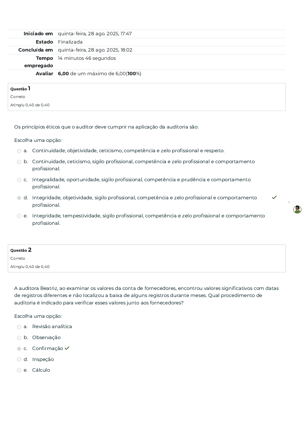 Iniciado em quinta-feira, 28 ago. 2025, 17:47 Estado Finalizada Concluída em quinta-feira, 28 ago. 2025, 18:02 Tempo empregado 14 minutos 46 segundos Avaliar 6,00 de um máximo de 6,00(100%) Questão 1 Correto Atingiu 0,40 de 0,40 Questão 2 Correto Atingiu 0,40 de 0,40 Os princípios éticos que o auditor deve cumprir na aplicação da auditoria são: Escolha uma opção: a. Continuidade, objetividade, ceticismo, competência e zelo profissional e respeito. b. Continuidade, ceticismo, sigilo profissional, competência e zelo profissional e comportamento profissional. c. Integralidade, oportunidade, sigilo profissional, competência e prudência e comportamento profissional. d. Integridade, objetividade, sigilo profissional, competência e zelo profissional e comportamento profissional. ✓ e. Integridade, tempestividade, sigilo profissional, competência e zelo profissional e comportamento profissional. A auditora Beatriz, ao examinar os valores da conta de fornecedores, encontrou valores significativos com datas de registros diferentes e não localizou a baixa de alguns registros durante meses. Qual procedimento de auditoria é indicado para verificar esses valores junto aos fornecedores? Escolha uma opção: a. Revisão analítica b. Observação c. Confirmação ✓ d. Inspeção e. Cálculo 1 Questão 3 Correto Atingiu 0,40 de 0,40 Questão 4 Correto Atingiu 0,40 de 0,40 A etapa que se constitui na definição de estratégia global para o trabalho e para o desenvolvimento do plano de auditoria é : Escolha uma opção: a. Programa de auditoria b. Planejamento de auditoria ✓ c. Avaliação dos controles internos d. Risco de auditoria e. Teste de auditoria Sobre os procedimentos que devem ser observados pelos auditores no desenvolvimento dos trabalhos, marque a alternativa correta com o conceito de observação: Escolha uma opção: a. É um procedimento que pode identificar erros, problemas ou deficiências, tais resultados dependem da experiência, conhecimento e senso crítico do auditor. ✓ b. É o exame de forma aprofundada do que está sendo auditado, por exemplo, pode examinar profundamente um documento, uma informação. c. É um procedimento de auditoria para identificar erros, problemas ou deficiências e pouco depende dos conhecimentos do auditor. d. É um procedimento de auditoria que implica na averiguação dos documentos em papel ou eletrônicos, internos ou externos e. É um procedimento que requer senso crítico do auditor que realiza o exame, por isso não pode identificar erros, problemas. 1 Questão 5 Correto Atingiu 0,40 de 0,40 Questão 6 Correto Atingiu 0,40 de 0,40 Questão 7 Correto Atingiu 0,40 de 0,40 As disponibilidades apresentam risco elevado e dificuldades de controle, assim a auditoria nas disponibilidades tem por finalidade: Escolha uma opção: a. determinar se não contém despesas capitalizadas e, por outro lado, as despesas não contêm itens capitalizáveis b. determinação da existência de um sistema adequado de controle interno sobre investimentos e lucros deles decorrentes c. aplicar critérios de julgamento quantitativos e qualitativos, usando, na maior parte do tempo, evidências indiretas, em vez de diretas d. determinar a existência da disponibilidade, se pertence à empresa, se são aplicados os princípios contábeis, a existência de restrições de uso e se estão classificadas de maneira correta. ✓ e. determinar a existência da disponibilidade, se pertence à empresa, se são aplicados os princípios contábeis, a existência de restrições de uso, mas não é papel da auditoria verificar se a classificadas está de maneira correta. As normas técnicas de auditoria fornecem diretrizes para execução do trabalho de auditoria, assinale quais itens discorre as normas relativas à execução do trabalho. Escolha uma opção: a. Relevância, independência e risco de auditoria. b. Planejamento, relevância e independência. c. Execução, relevância e independência. d. Planejamento, relevância e risco de auditoria. ✓ e. Planejamento, parecer e risco de auditoria. Thiago Albuquerque é auditor, realizou auditoria numa empresa de construção civil, ao final do trabalho o auditor divulgou informações obtidas no processo de auditoria a um terceito. A ação do auditor fere qual princípio ético? Escolha uma opção: a. Competência e zelo profissional b. Sigilo profissional ✓ c. Integridade d. Objetividade e. Comportamento profissional 1 Questão 8 Correto Atingiu 0,40 de 0,40 Questão 9 Correto Atingiu 0,40 de 0,40 Os papéis de trabalho, relatórios e pareceres são documentos de auditoria, devem ser mantidos em boa guarda, a partir da data de emissão do parecer, pelo prazo de: Escolha uma opção: a. 10 anos b. 1 ano c. 5 anos ✓ d. 3 anos e. 7 anos Pedro, um auditor externo da empresa Griffing S. A. foi solicitado a prestar trabalho de auditoria com auxilio do diretor Felipe, que é seu tio de 2º grau e que também será o sócio responsável pela auditoria. De acordo com as normas relativas a pessoa do auditor, é correto afirmar como Pedro deve proceder: Escolha uma opção: a. Deve aceitar o trabalho, pois está descrito nas normas que fica impedido de executar o trabalho de auditoria independente o auditor que tenha vínculo de parentesco de primeiro grau. b. O auditor não deve aceitar o trabalho pois segundo a normas de auditoria viola o requisito de independência. ✓ c. Pode aceitar o trabalho de auditoria desde que não deixe-se influenciar por seu primo na condução do trabalho. d. O auditor só poderá aceitar o trabalho se assinar a declaração de independência expondo que possui parentesco com membro da administração da empresa auditada. e. Só deve recusar se algum órgão fidcalizador descobrir. 1 Questão 10 Correto Atingiu 0,40 de 0,40 Questão 11 Correto Atingiu 0,40 de 0,40 Questão 12 Correto Atingiu 0,40 de 0,40 De acordo com a classificação dos papéis de trabalho, é correto afirmar q