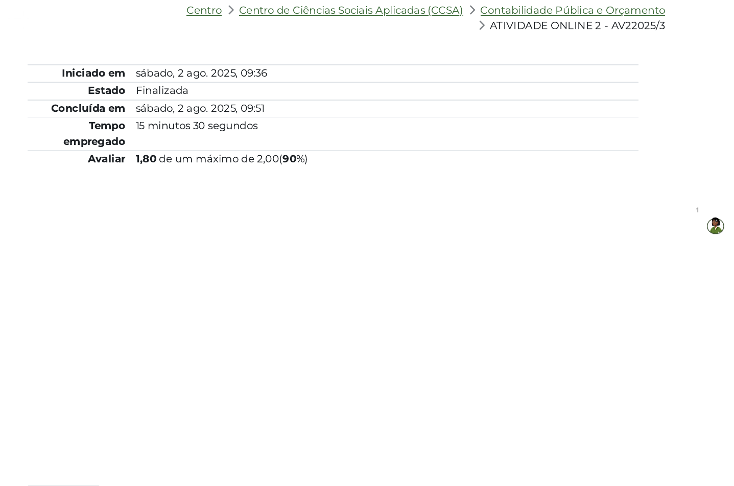 Centro 〉 Centro de Ciências Sociais Aplicadas (CCSA) 〉 Contabilidade Pública e Orçamento 〉 ATIVIDADE ONLINE 2 - AV22025/3 Iniciado em sábado, 2 ago. 2025, 09:36 Estado Finalizada Concluída em sábado, 2 ago. 2025, 09:51 Tempo empregado 15 minutos 30 segundos Avaliar 1,80 de um máximo de 2,00(90%) 1 https://ava.graduacaoead.unicv.edu.br/course/index.php?categoryid=267 https://ava.graduacaoead.unicv.edu.br/course/index.php?categoryid=266 https://ava.graduacaoead.unicv.edu.br/course/view.php?id=14450#section-4 Questão 1 Correto Atingiu 0,20 de 0,20 Segundo Araújo e Arruda (2009, p. 82) “na contabilidade pública, receita engloba todo e qualquer recolhimento de recursos feito aos cofres públicos, realizado sob a forma de numerário e de outros bens representativos de valores”. Sobre as receitas públicas analise as afirmativas a seguir. I - As receitas orçamentárias representam disponibilidades de recursos. II - As receitas extraorçamentárias representam entradas compensatórias. III - As receitas orçamentárias não estão previstas na Lei Orçamentária Anual. IV - As receitas extraorçamentárias estão previstas na Lei Orçamentária Anual. É correto o que se afirma em: Escolha uma opção: a. I, II, III e IV. b. II e III apenas. c. I e II apenas. ✓ d. I, II e III apenas. e. III e IV apenas. 1 Questão 2 Correto Atingiu 0,20 de 0,20 O Balanço Financeiro compõe o conjunto de Demonstrações Contábeis Aplicadas ao Setor Público (DCASP). São informações contidas no Balanço Financeiro: I - Saldo inicial do caixa. II - Saldo final do caixa. III - Receitas orçamentárias e extraorçamentárias recebidas. IV - Saída de recursos provenientes de despesas orçamentárias e extraorçamentárias. É correto o que se afirma em: Escolha uma opção: a. III ei IV apenas. b. I, II, III e IV. ✓ c. II, III e IV apenas. d. I, II e III apenas. e. I e II apenas. 1 Questão 3 Correto Atingiu 0,20 de 0,20 Questão 4 Incorreto Atingiu 0,00 de 0,20 No intuito de gerar informações suficientes para a correta avaliação da situação patrimonial e do desempenho das entidades do setor público, a contabilidade aplicada ao setor público se estrutura em três aspectos. Assinale a alternativa que descreve os três aspectos da contabilidade aplicada ao setor público. Escolha uma opção: a. Orçamentário, patrimonial e fiscal. ✓ b. Patrimonial, fiscal e de competência. c. Patrimonial, fiscal e de controle. d. Orçamentário, patrimonial e de controle. e. Orçamentário, fiscal e de controle. A classificação da receita pública é formada por um código numérico de 8 dígitos divididos em: Categoria Econômica, Origem, Espécie, Desdobramento para identificação de peculiaridade da receita e Tipo. Todo esse desdobramento visa identificar: Escolha uma opção: a. Se a receita foi recolhida devidamente. b. A destinação da receita. × c. O fato gerador da receita. d. O valor real da receita. e. Se a receita está prevista no orçamento. 1 Questão 5 Correto Atingiu 0,20 de 0,20 A contabilidade pública é uma das diversas ramificações da contabilidade. Sobre a contabilidade pública analise as afirmativas a seguir. I - A contabilidade pública vem passando por diversas alterações em direção à convergência para as normas internacionais de contabilidade. II - Para orientar a adoção das novas normas contábeis aplicada ao setor público a Secretaria do Tesouro Nacional vem publicando o Manual de Contabilidade Aplicada ao Setor Público (MCASP). III - Para orientar as ações contábeis aplicadas ao setor público o Conselho Federal de Contabilidade editou as normas brasileiras de contabilidade contidas nas NBC TSP - do Setor Público. É correto o que se afirma em: Escolha uma opção: a. II apenas. b. I, II e III. ✓ c. I apenas. d. I e II apenas. e. II e III apenas. 1 Questão 6 Correto Atingiu 0,20 de 0,20 As demonstrações contábeis representam de forma estruturada a situação patrimonial, financeira e o desempenho das entidades. No caso das Demonstrações Contábeis Aplicadas ao Setor Público (DCASP), o Manual de contabilidade Aplicada ao Setor Público (MCASP) estabelece que devem apresentar informaçõe: I - sobre as fontes, as alocações e os usos de recursos financeiros. II - sobre como a entidade financiou suas atividades e como supriu suas necessidades de caixa. III - sobre a condição financeira da entidade e suas alterações. É correto o que se afirma em: Escolha uma opção: a. I, II e III. ✓ b. II e III apenas. c. I apenas. d. II apenas. e. I e II apenas. 1 Questão 7 Correto Atingiu 0,20 de 0,20 Para gerar informações de diferentes naturezas o Plano de Contas Aplicado ao Setor Público (PCASP) está estruturado em 8 classes. Sobre esta estrutura analise as afirmativas a seguir. I - As classes 1, 2, 3 e 4 atendem às informações de natureza patrimonial. II - A classe 1 representa o Ativo, a classe 2 o Passivo e a classe 3 o Patrimônio Líquido. III - As classes 5 e 6 atendem às informações de natureza orçamentária. IV - As classes 7 e 8 atendem às informações de natureza fiscal. É correto o que se afirma em: Escolha uma opção: a. II, III e IV apenas. b. I e III apenas. ✓ c. I, II, III e IV. d. I, II e III apenas. e. II e IV apenas. 1 Questão 8 Correto Atingiu 0,20 de 0,20 Entende-se por processamento da receita pública o conjunto de atividades, ou etapas, desenvolvidas pelos órgãos arrecadadores, objetivando a arrecadação de dinheiros e outros bens que, por força de lei ou de contrato, pertencem ao Poder Público. Tais etapas constituem: Escolha uma opção: a. Fixação, liquidação, arrecadação e pagamento. b. Previsão, lançamento, arrecadação e recolhimento. ✓ c. Fixação, lançamento, recolhimento e pagamento. d. Previsão, liquidação, empenho e arrecadação. e. Previsão, arrecadação, recolhimento e liquidação. 1 Questão 9 Correto Atingiu 0,20 de 0,20 As Demonstrações Contábeis Aplicadas